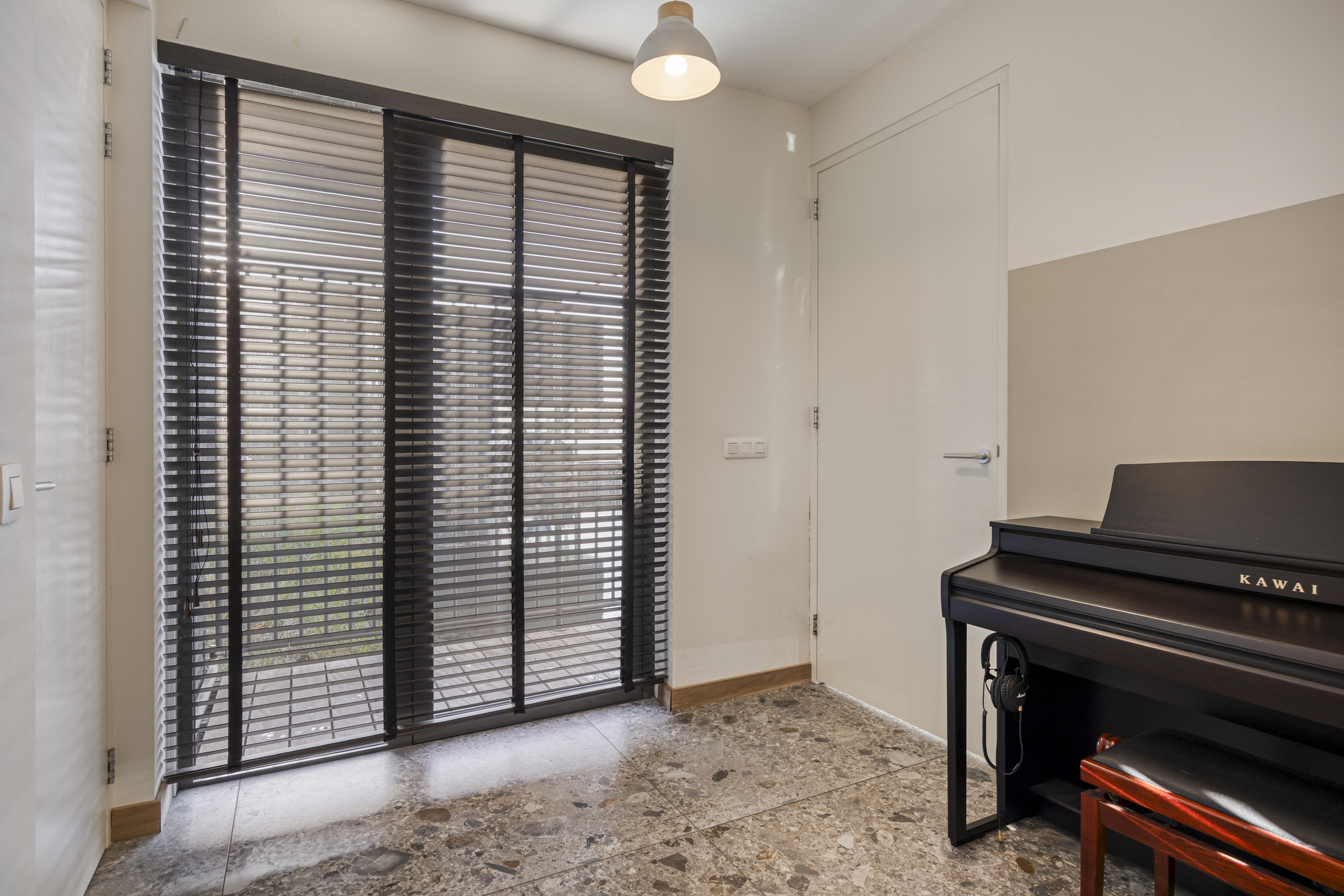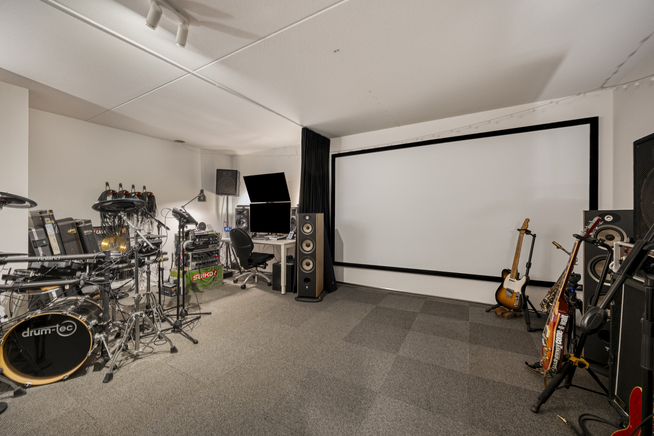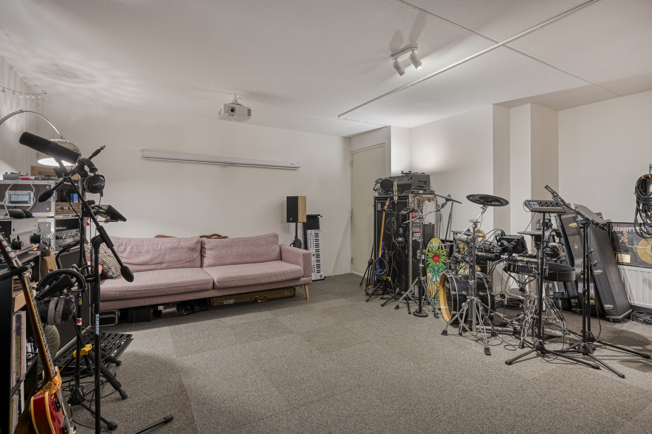 Soundproofed basement with underfloor heating and mechanical ventilation, currently used as a music studio and home cinema. Decorative plaster walls, carpet tiles, and spray-plastered ceiling.