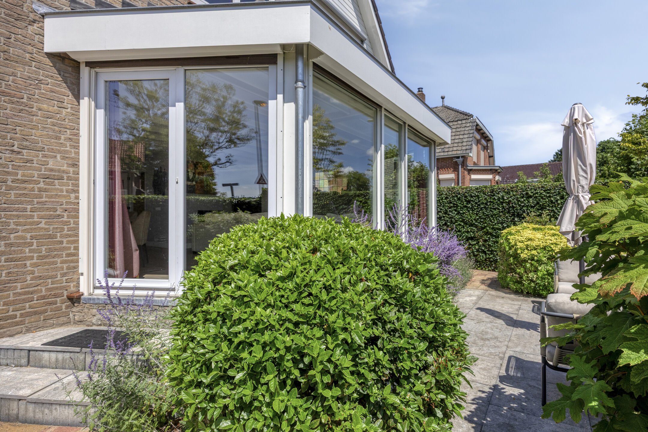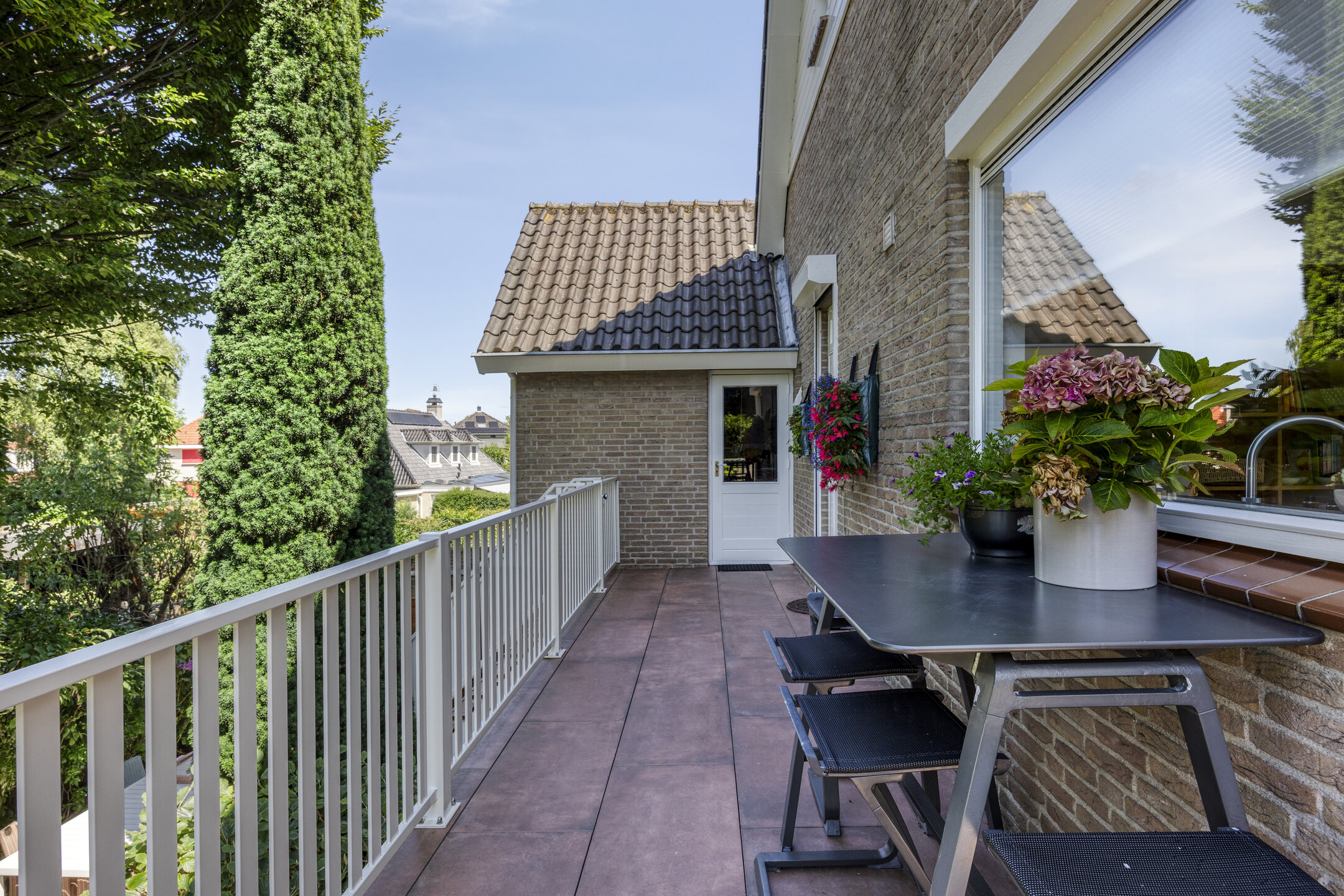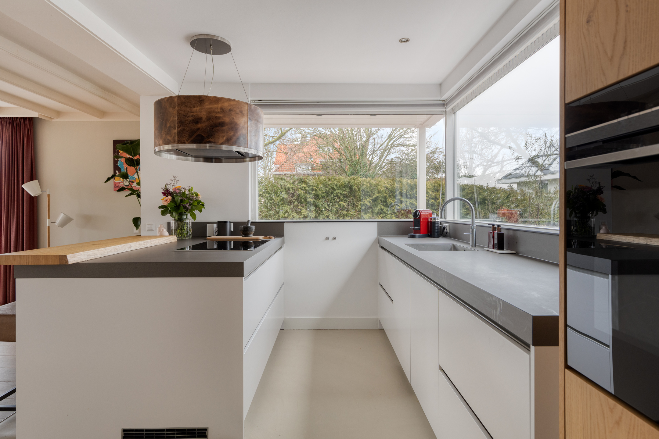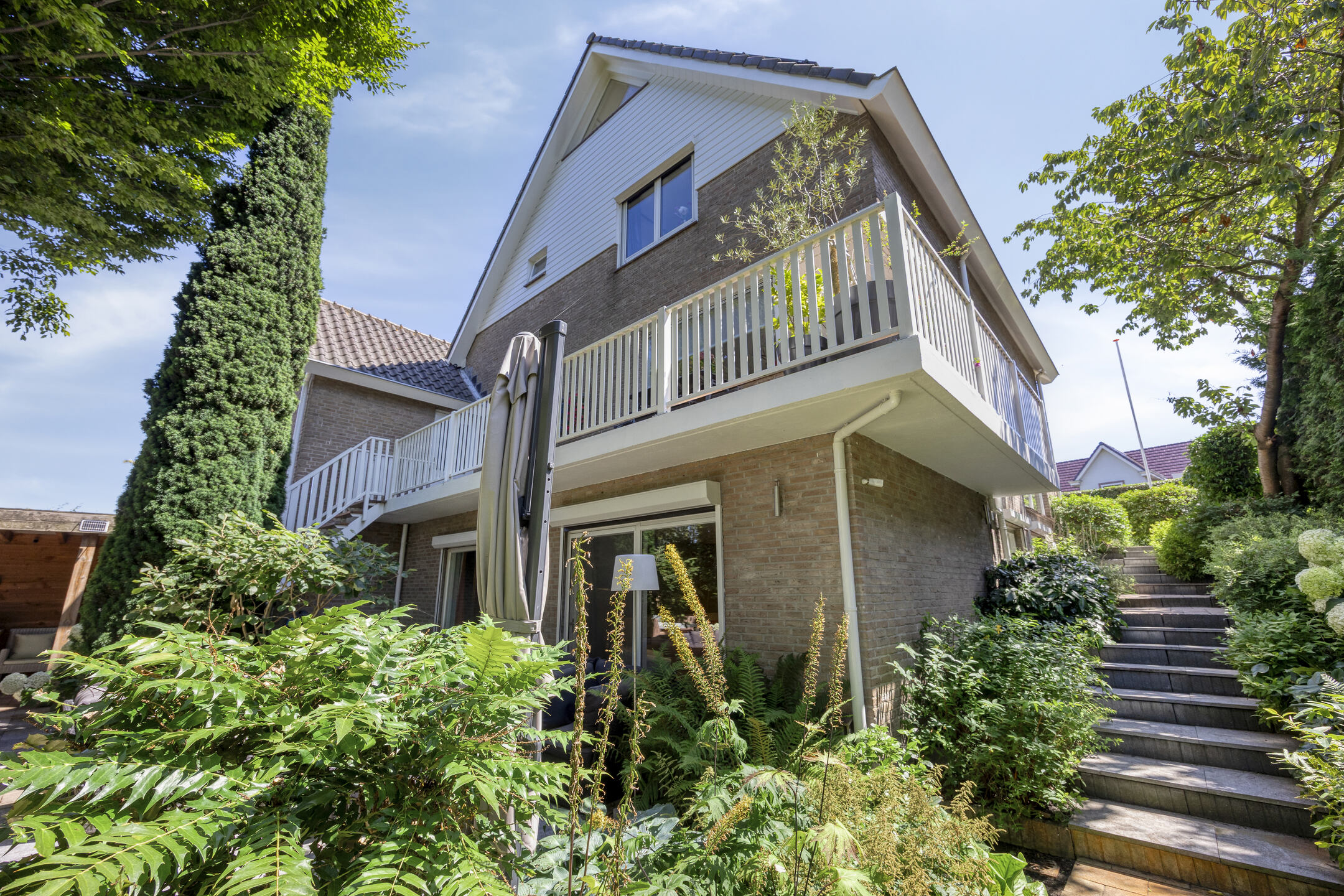 A large driveway with electric charging point introduces the property, complemented by a private garage. Expanses of glass and a serene conservatory suffuse the main living area with light, where a wooden floor and open fireplace create a welcoming atmosphere. The kitchen, with its modern island and extensive built in appliances, includes features such as a climate cabinet, Quooker and steam oven. Adjacent balconies and gardens offer seamless transitions between indoor and outdoor life, with sun throughout the day and practical roll down shutters, sun awnings and twenty solar panels ensuring both comfort and efficiency.
