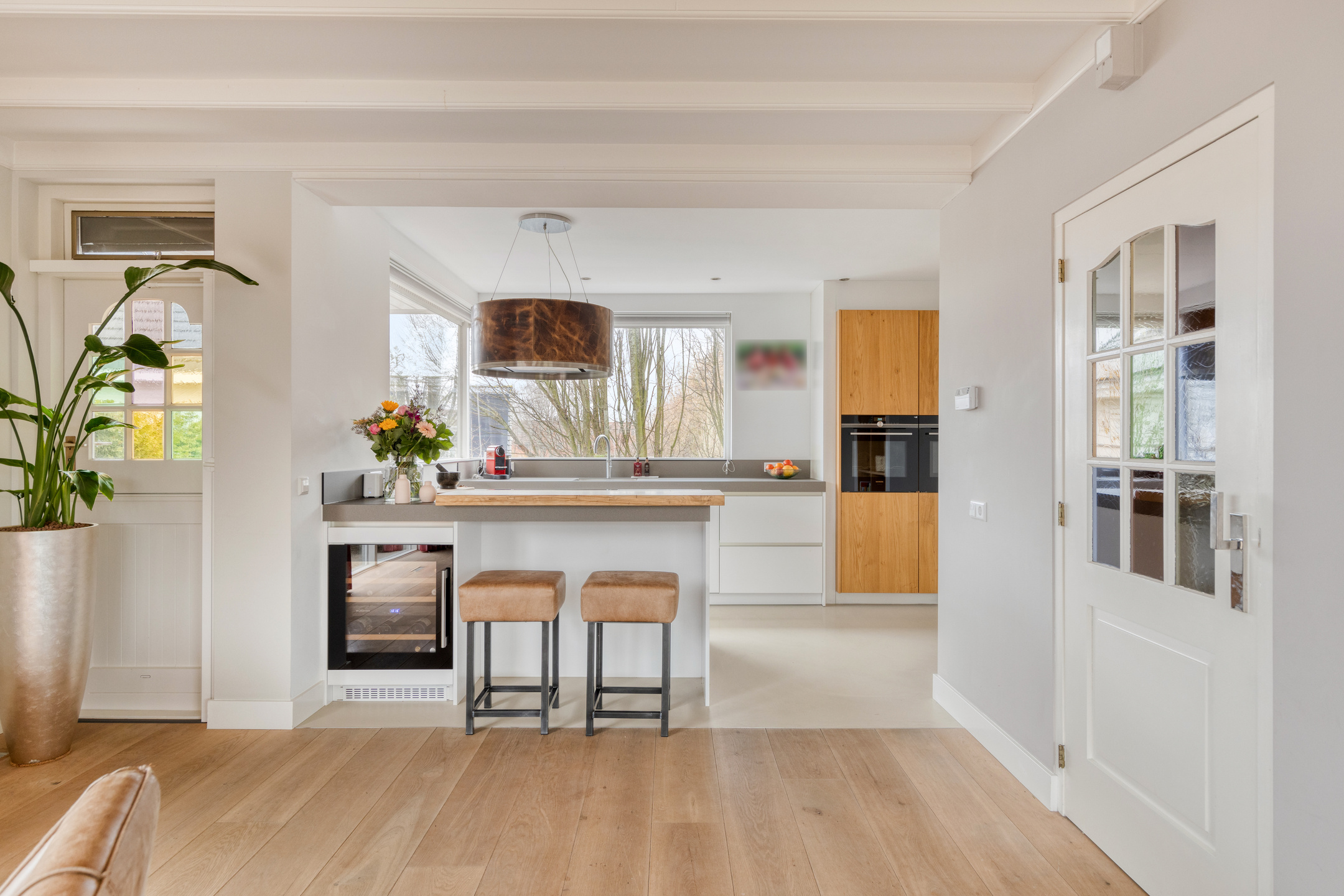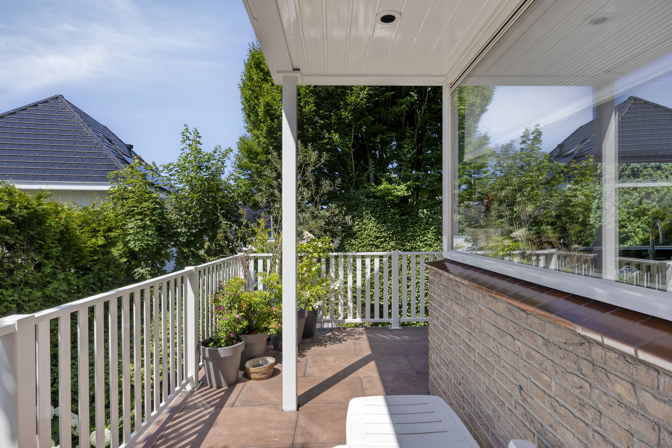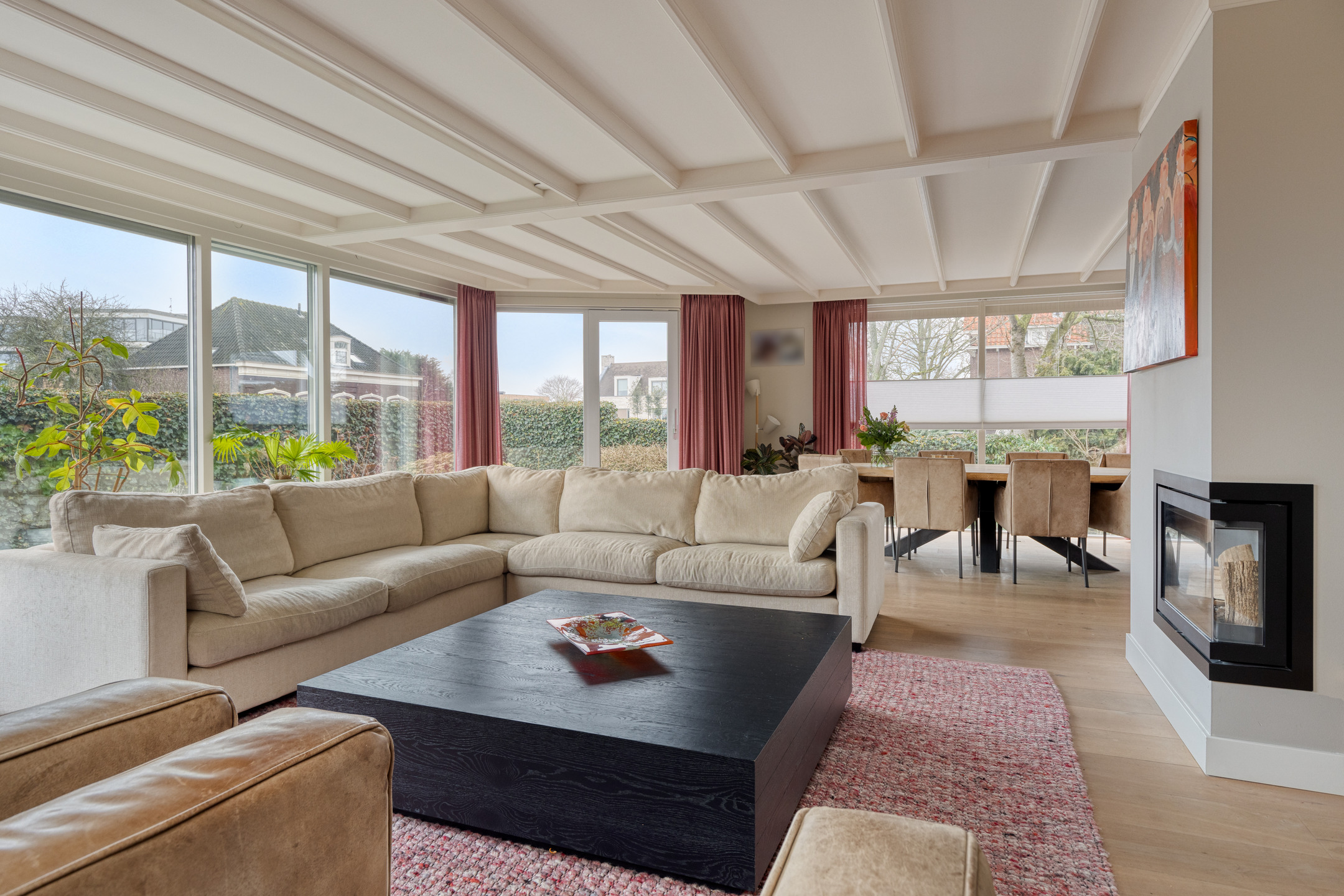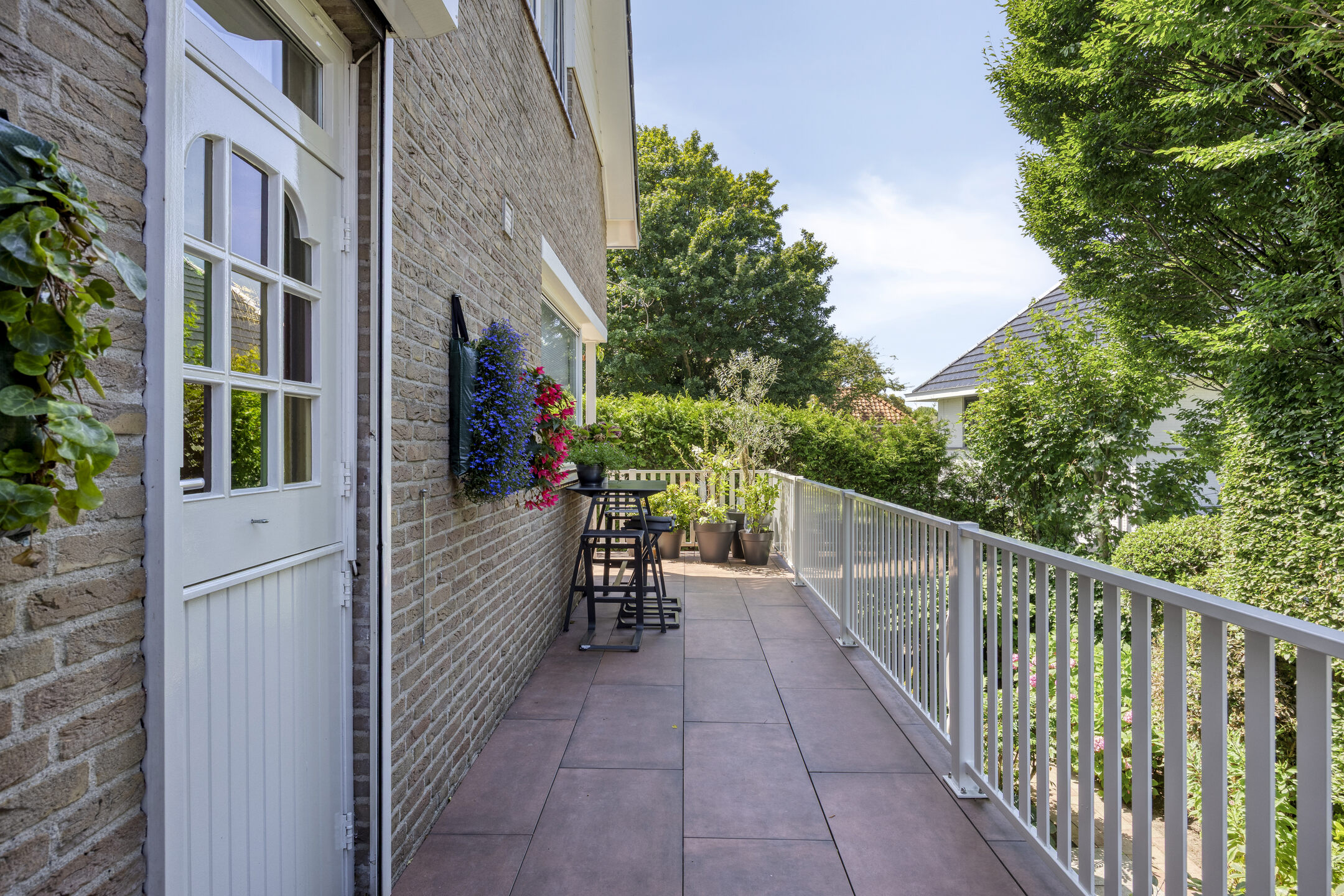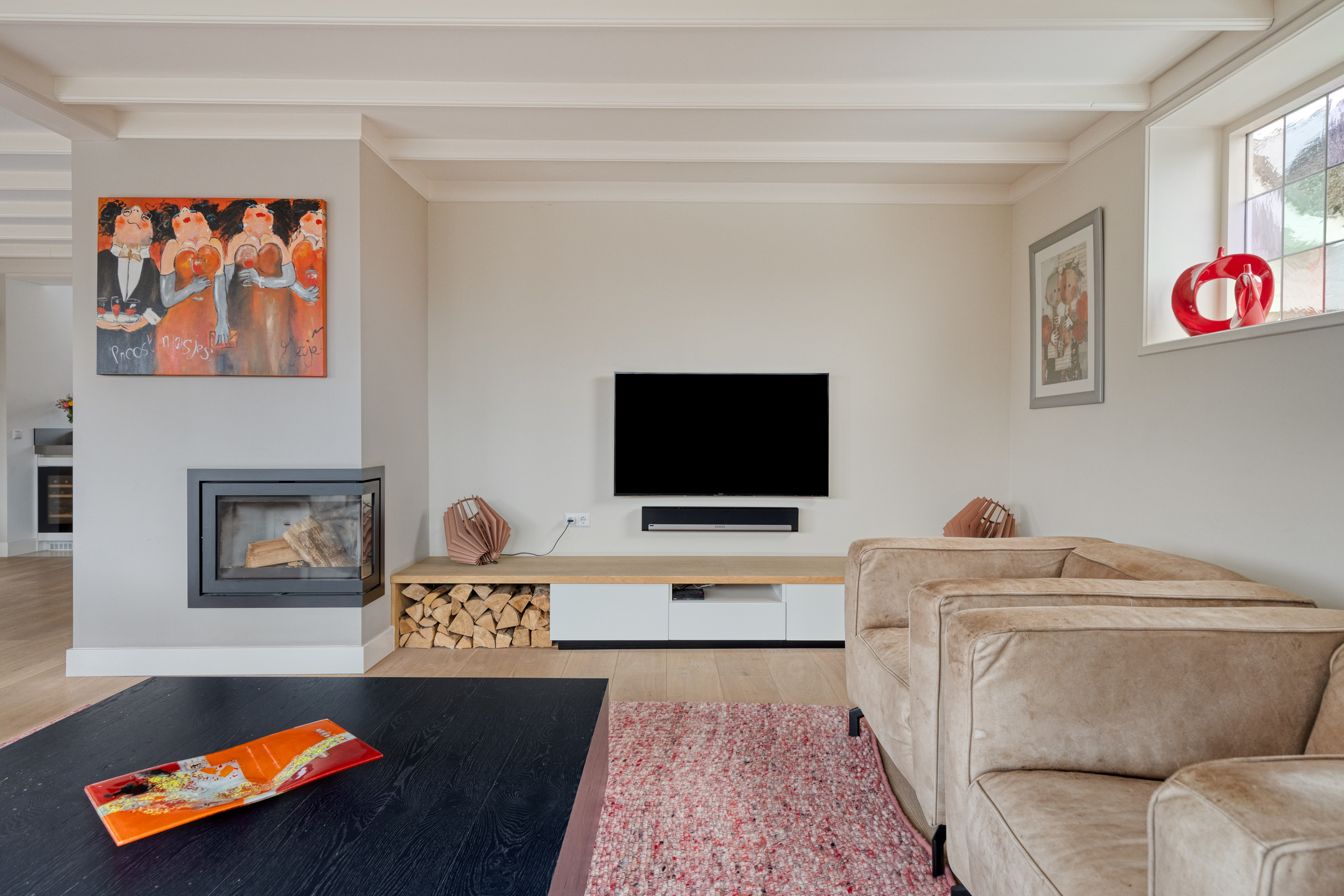 A large driveway with electric charging point introduces the property, complemented by a private garage. Expanses of glass and a serene conservatory suffuse the main living area with light, where a wooden floor and open fireplace create a welcoming atmosphere. The kitchen, with its modern island and extensive built in appliances, includes features such as a climate cabinet, Quooker and steam oven. Adjacent balconies and gardens offer seamless transitions between indoor and outdoor life, with sun throughout the day and practical roll down shutters, sun awnings and twenty solar panels ensuring both comfort and efficiency.