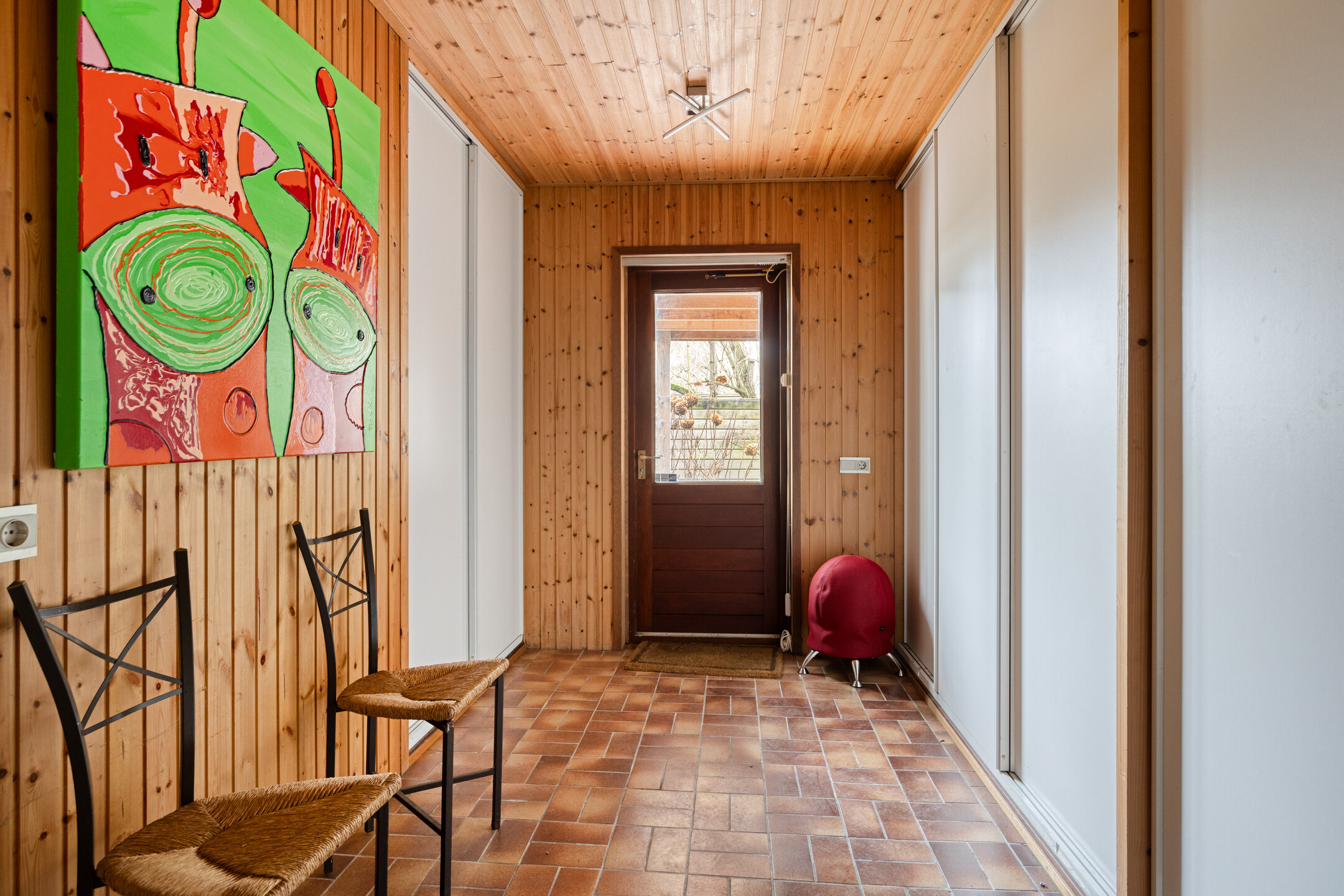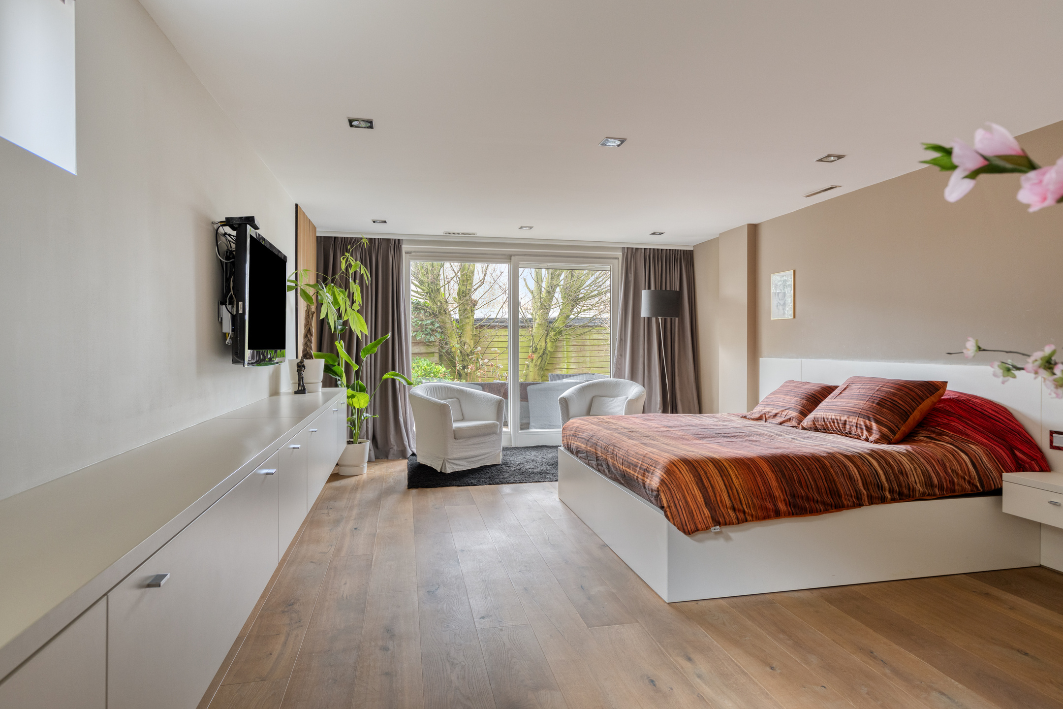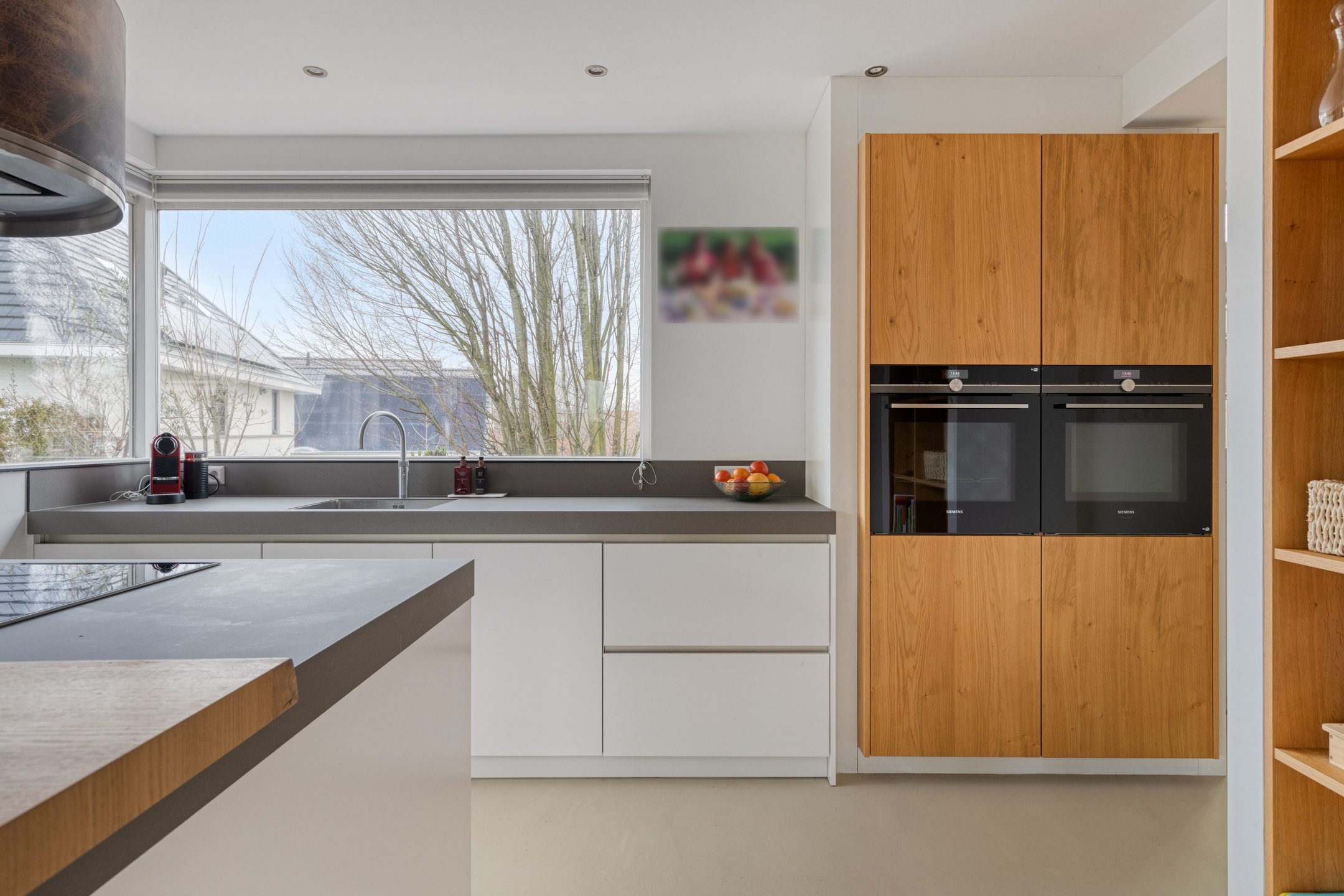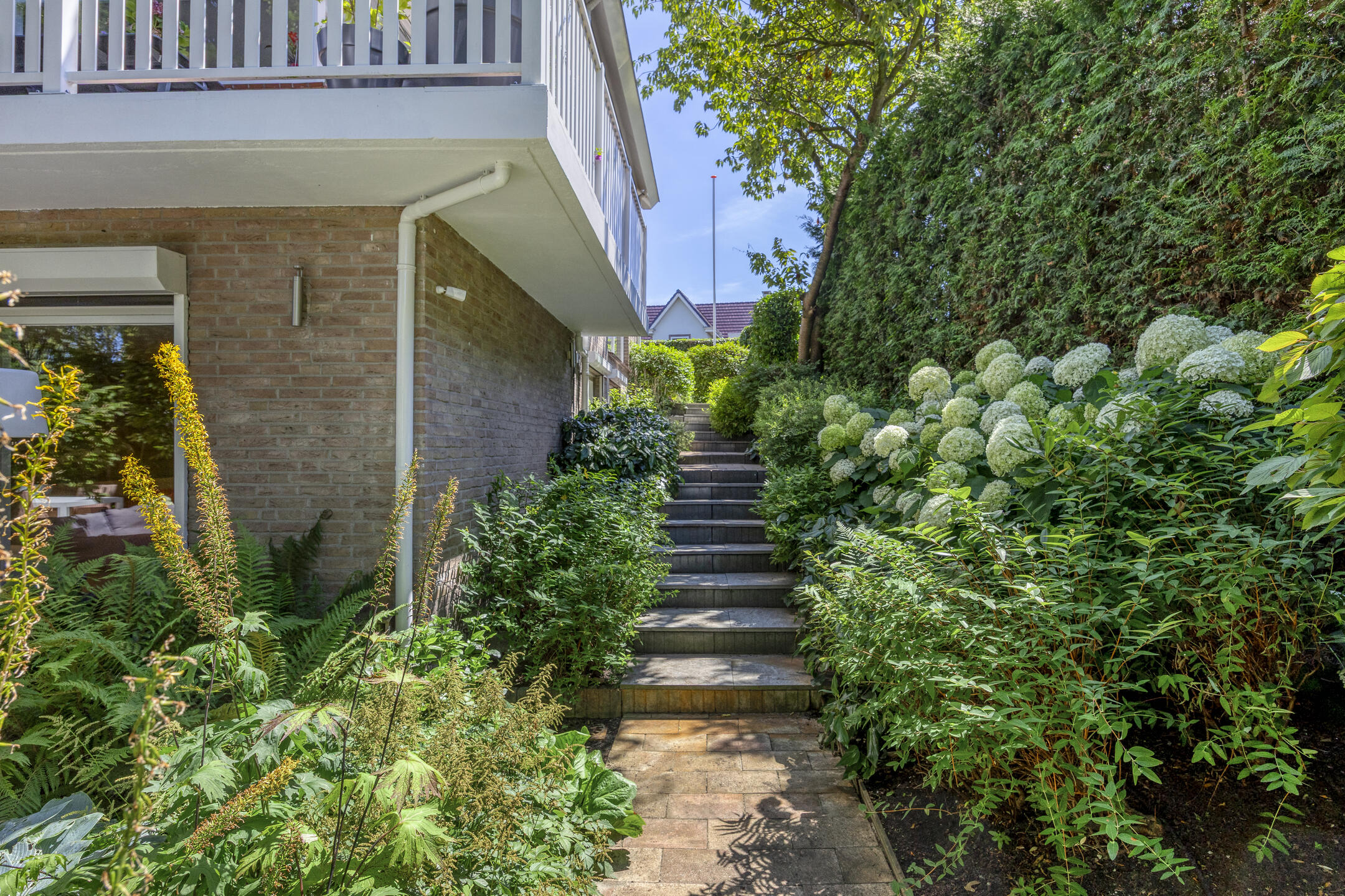 A large driveway with electric charging point introduces the property, complemented by a private garage. Expanses of glass and a serene conservatory suffuse the main living area with light, where a wooden floor and open fireplace create a welcoming atmosphere. The kitchen, with its modern island and extensive built in appliances, includes features such as a climate cabinet, Quooker and steam oven. Adjacent balconies and gardens offer seamless transitions between indoor and outdoor life, with sun throughout the day and practical roll down shutters, sun awnings and twenty solar panels ensuring both comfort and efficiency.
