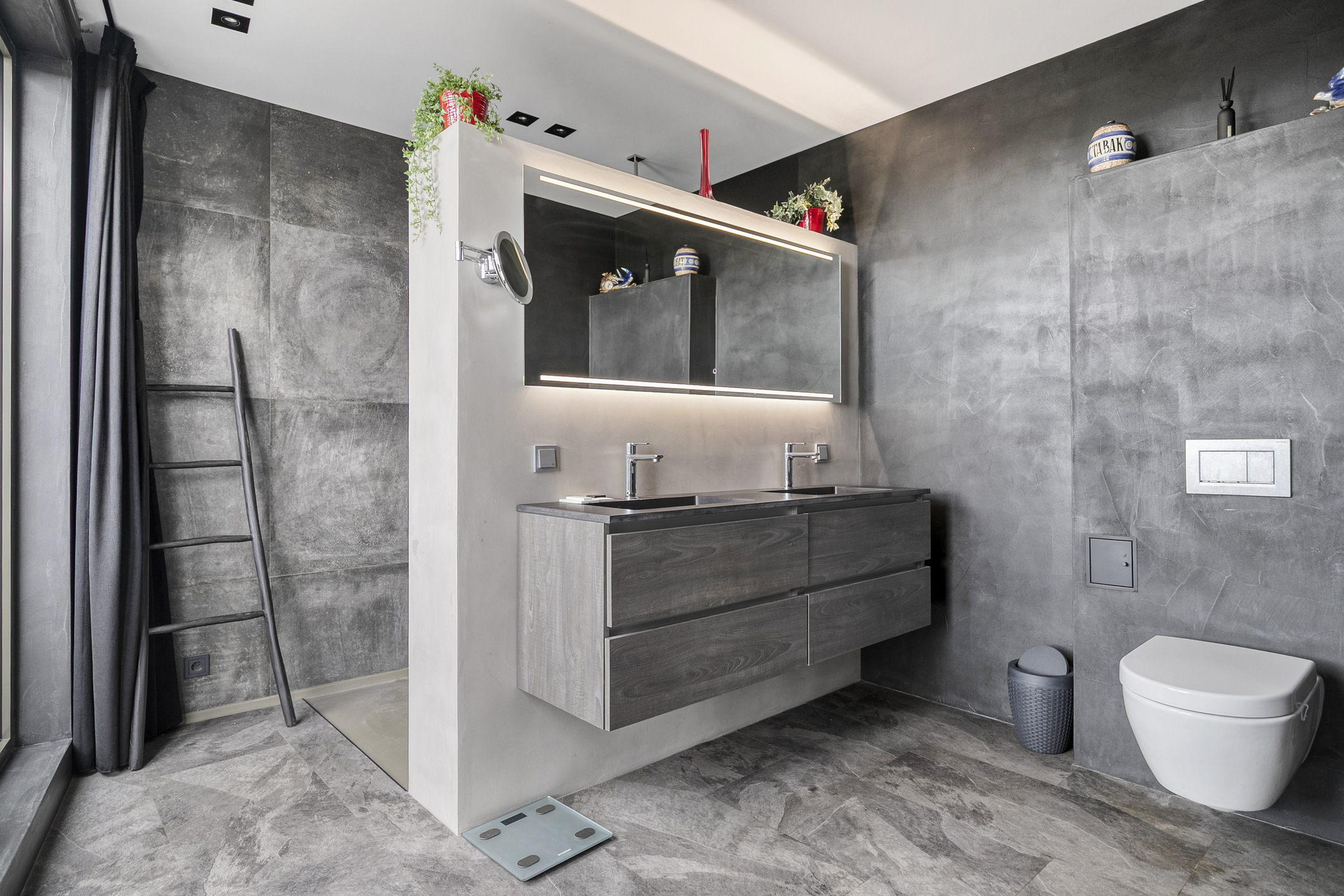 The bathroom features a spacious walk-in shower, double washbasin with vanity unit, and a second toilet.
