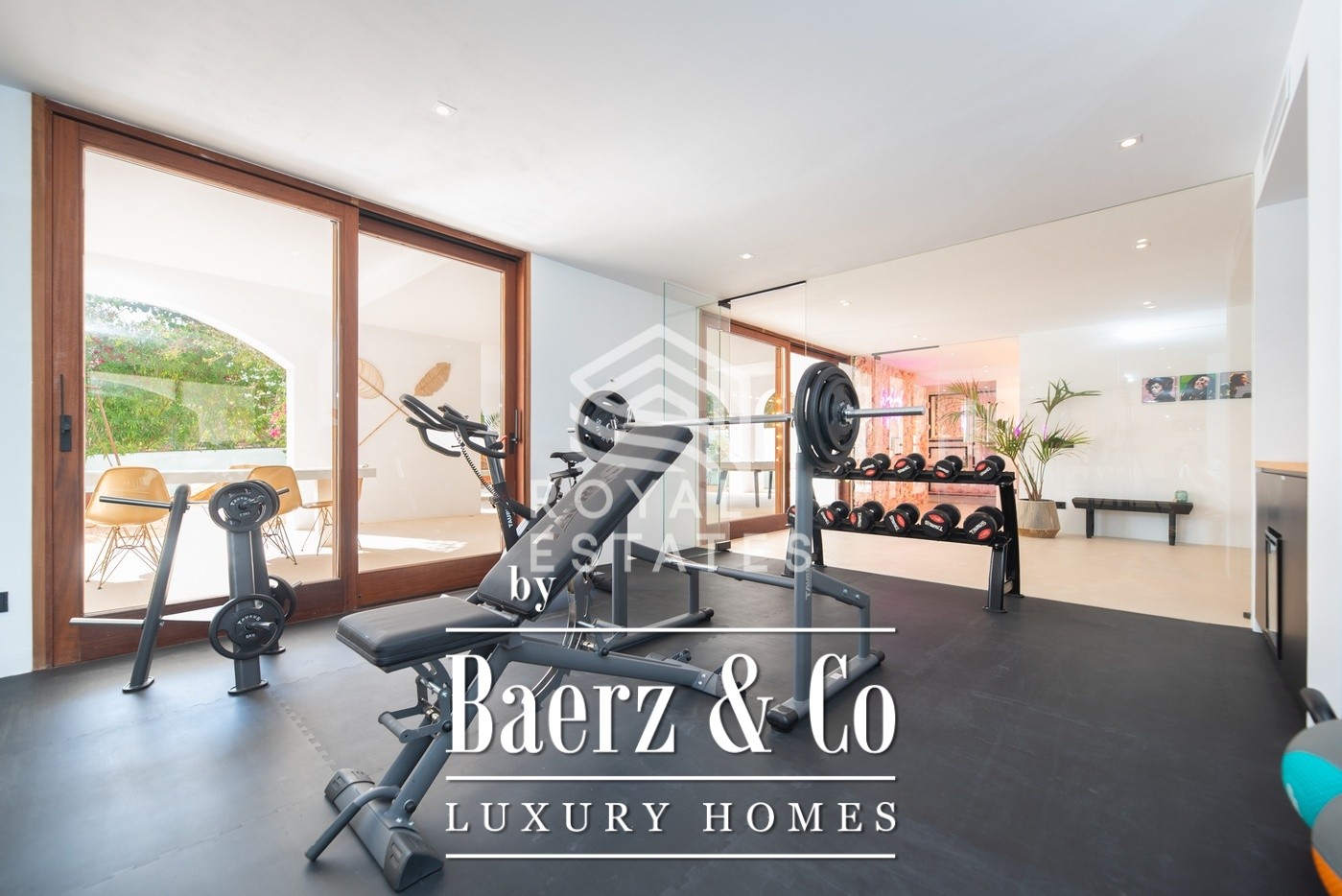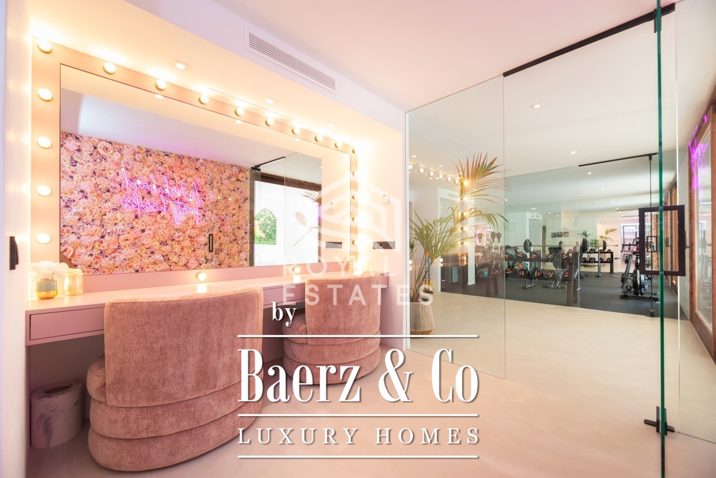 Expansive terraces open to landscaped gardens, mature palms, and lagoon-style pool, inviting both relaxed solitude and social gatherings. Outdoor games, a firepit, and sunbathing enclaves complement spaces for both celebration and calm. Wellness is a priority, with a dedicated gym, home cinema, and glam room on the ground floor. Fine natural materials—wood, stone, tactile fabrics—shape a minimalist, timeless aesthetic, unified by underfloor heating, integrated air conditioning, and dimmable lighting.