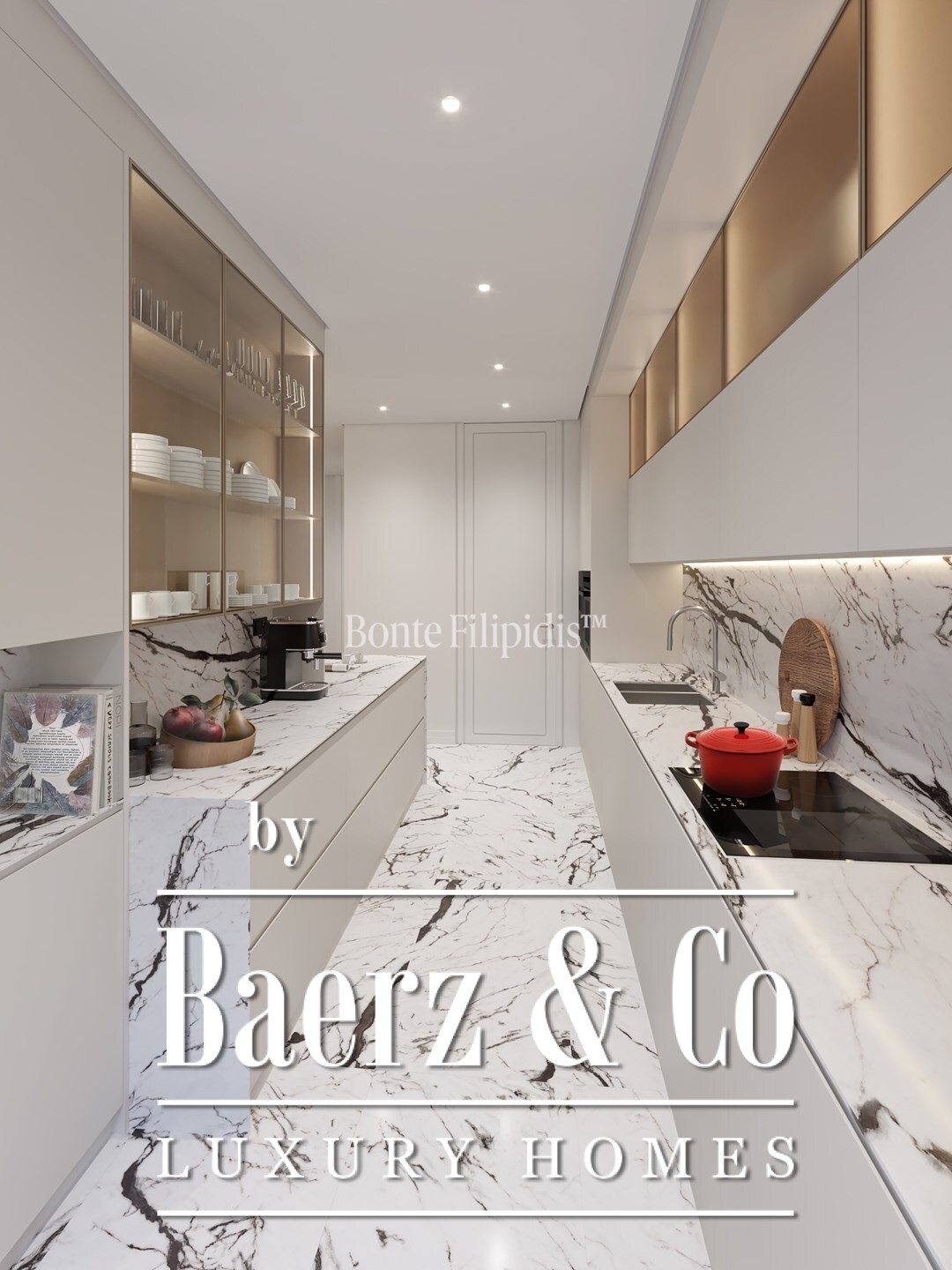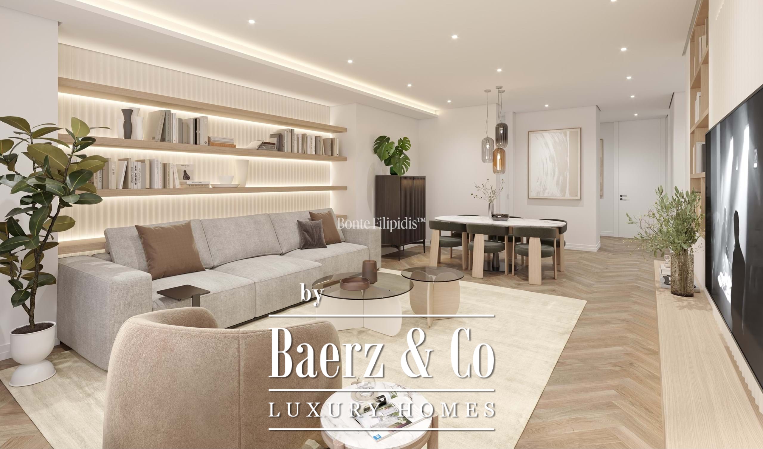 The kitchen features bespoke cabinetry, integrated appliances and marble finishes, merging functionality with restrained elegance. In the private wing, three bedrooms offer ample comfort, including a suite with a walk-in closet. Every bathroom is crafted with contemporary fittings and marble, underscoring the commitment to quality materials throughout.