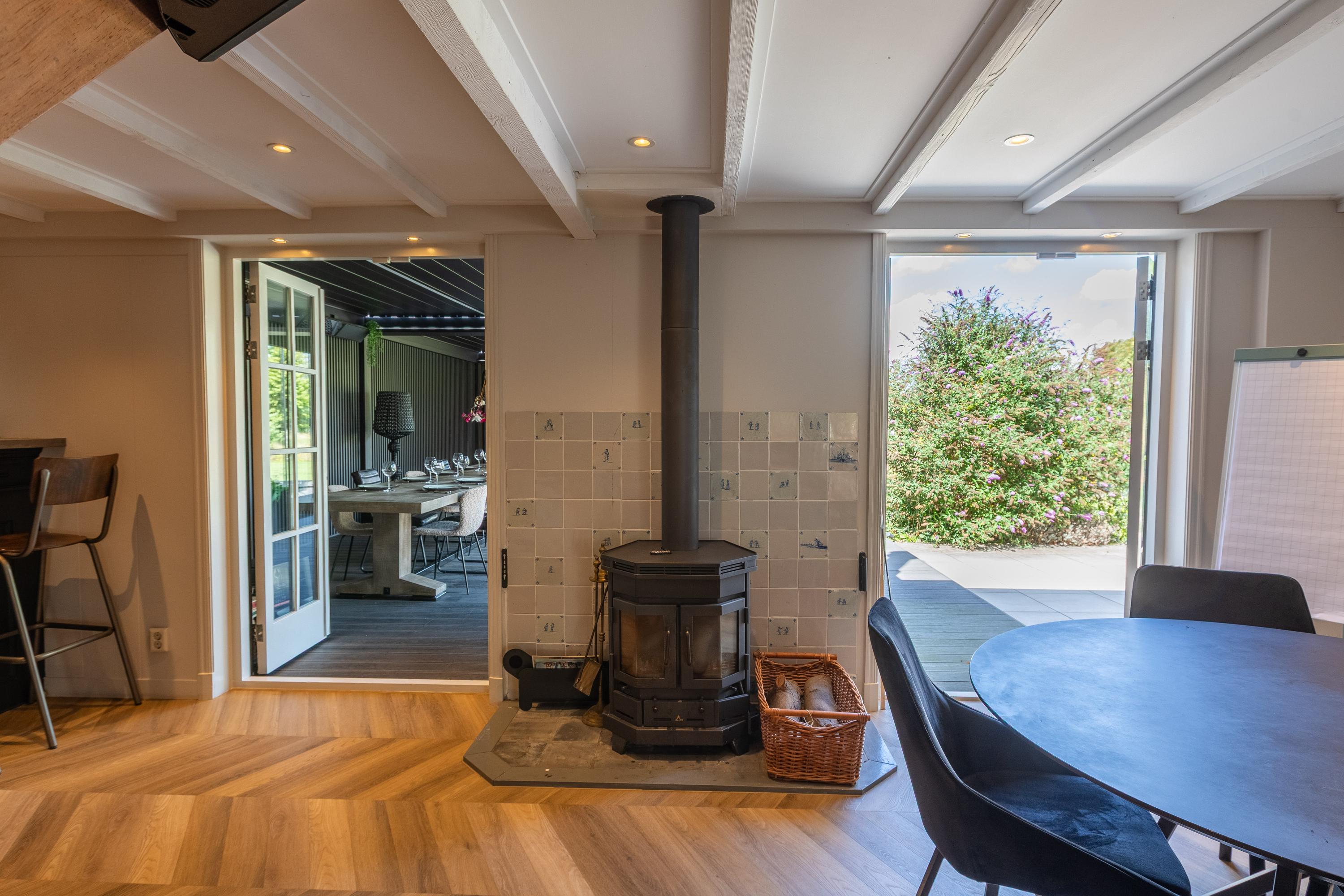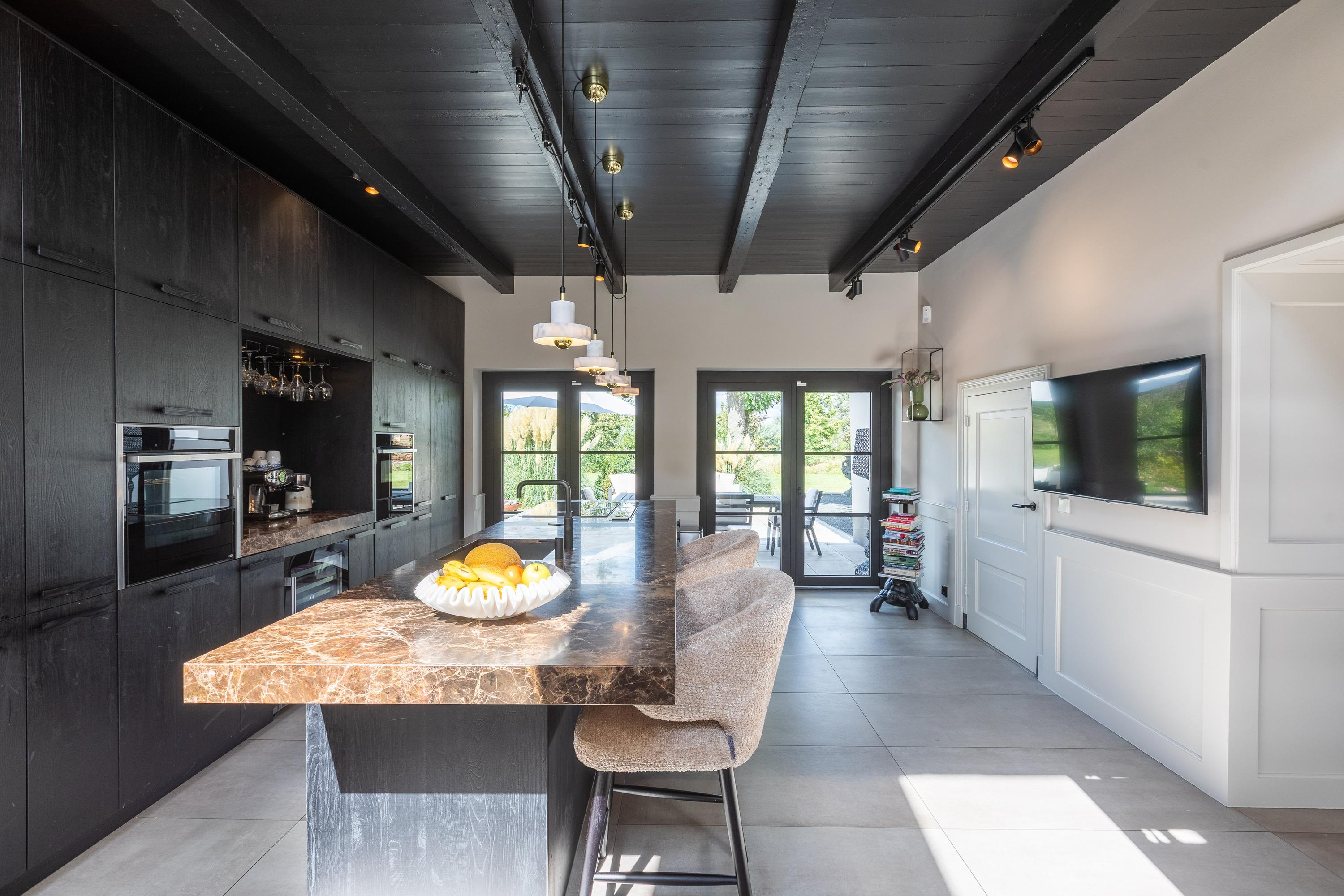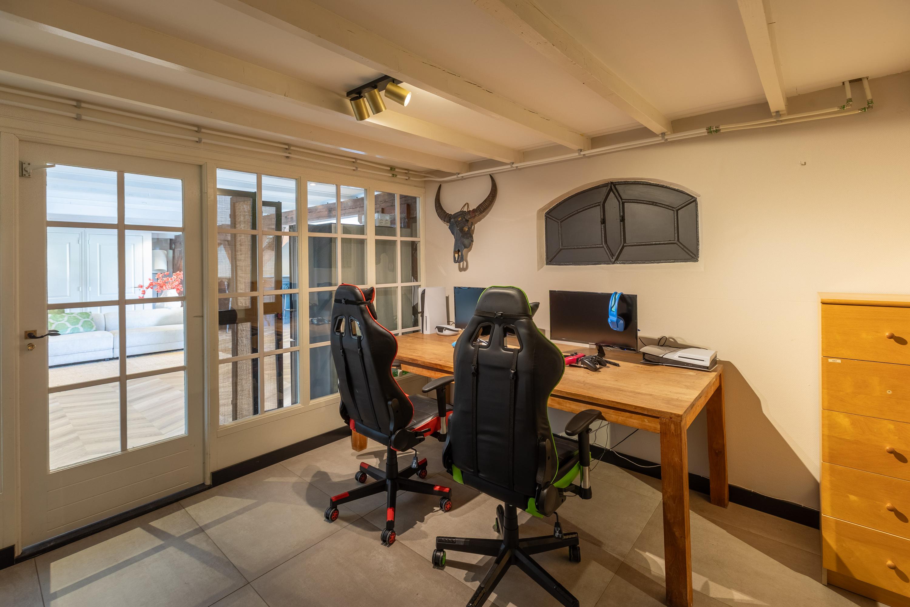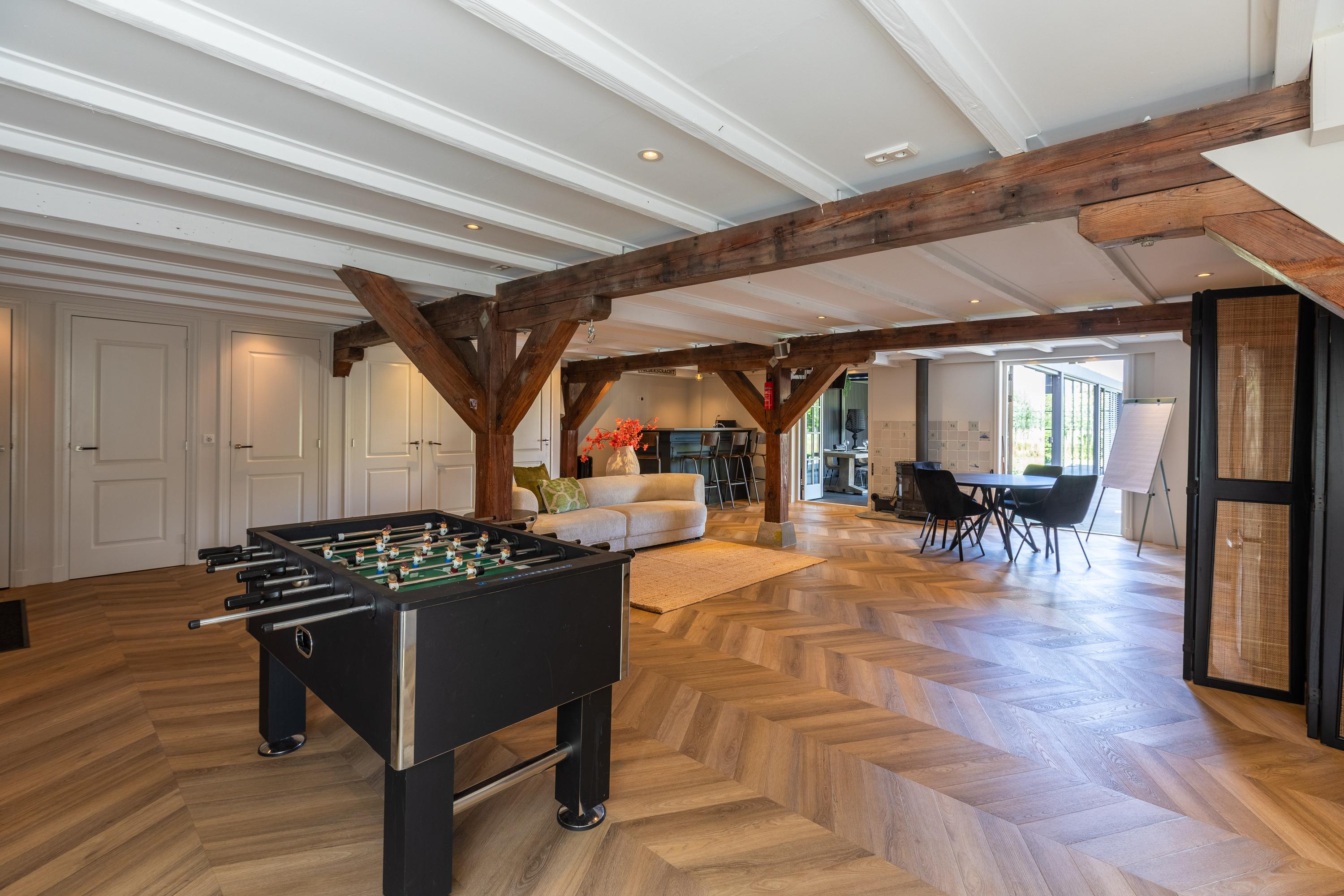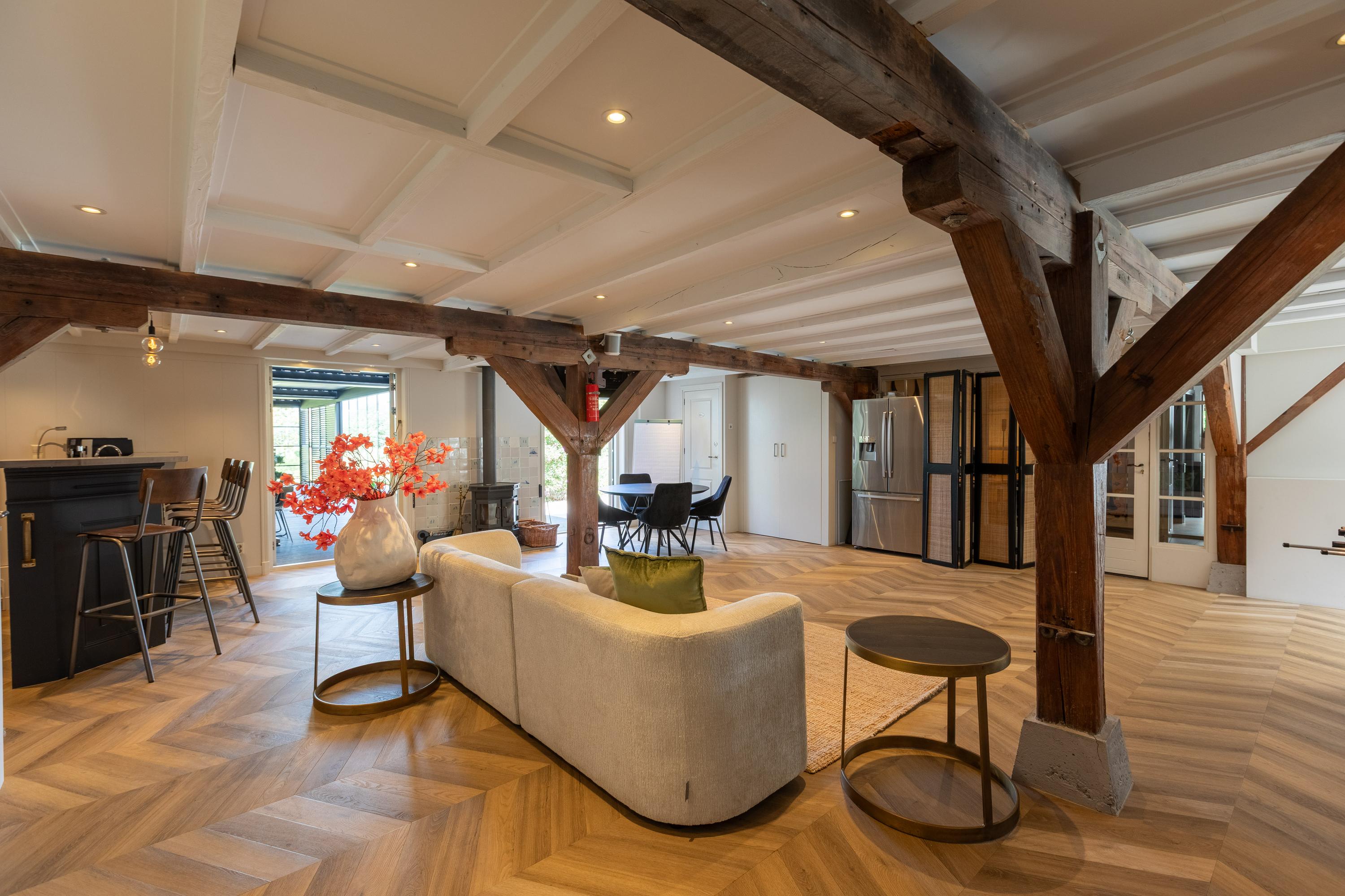 In addition, the ground floor features a second modern kitchen adjacent to the terrace and a multifunctional space of approximately 85 m² in the former stable, equipped with a bar, pantry, toilet, and access to the garages and storage space. On the other side of this space, you enter the spacious extension with wellness facilities, fully equipped with a jacuzzi, Finnish sauna, infrared sauna, and enough space for a large dining table or lounge set—a wonderful place to relax and enjoy each other's company.