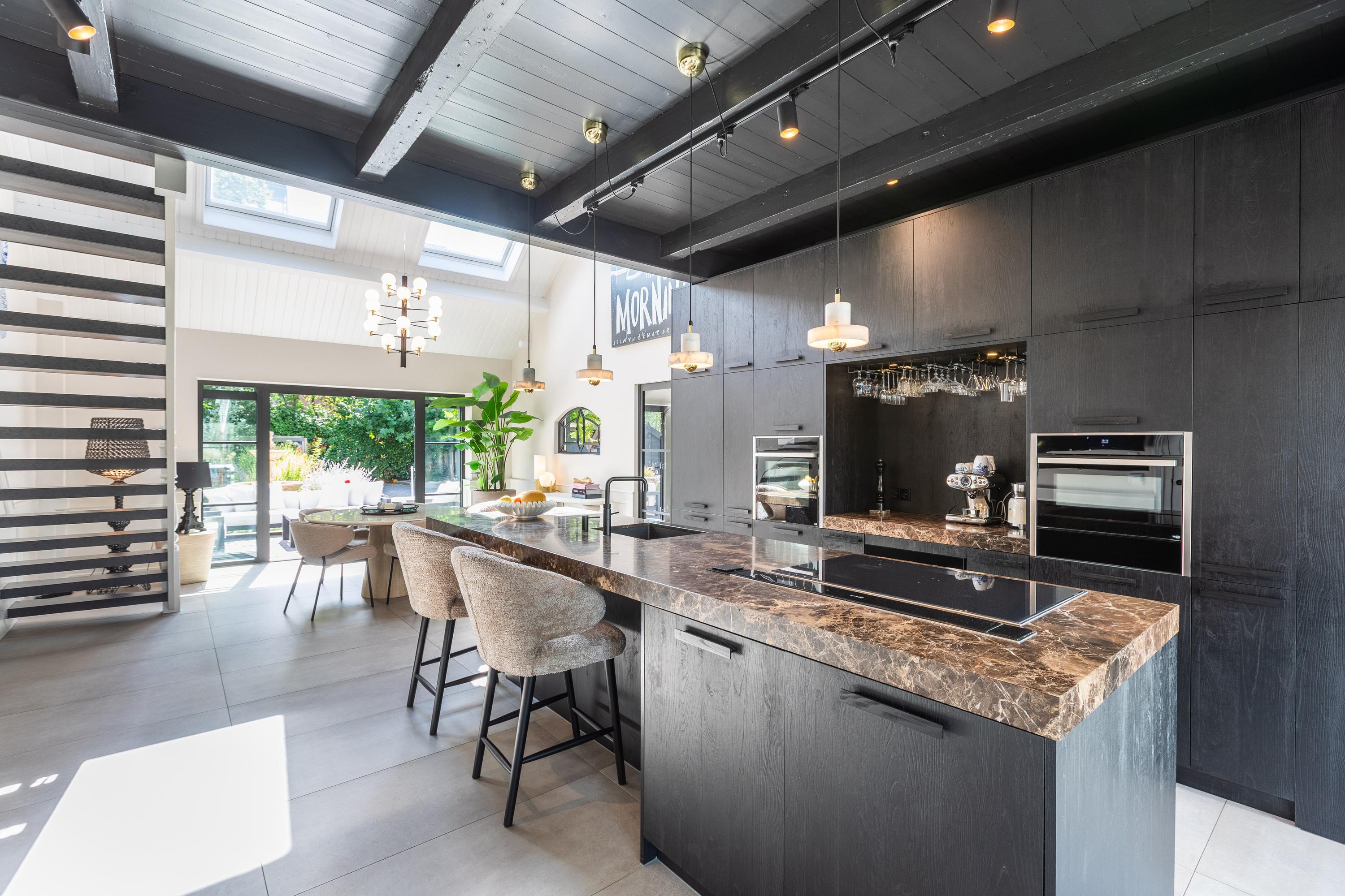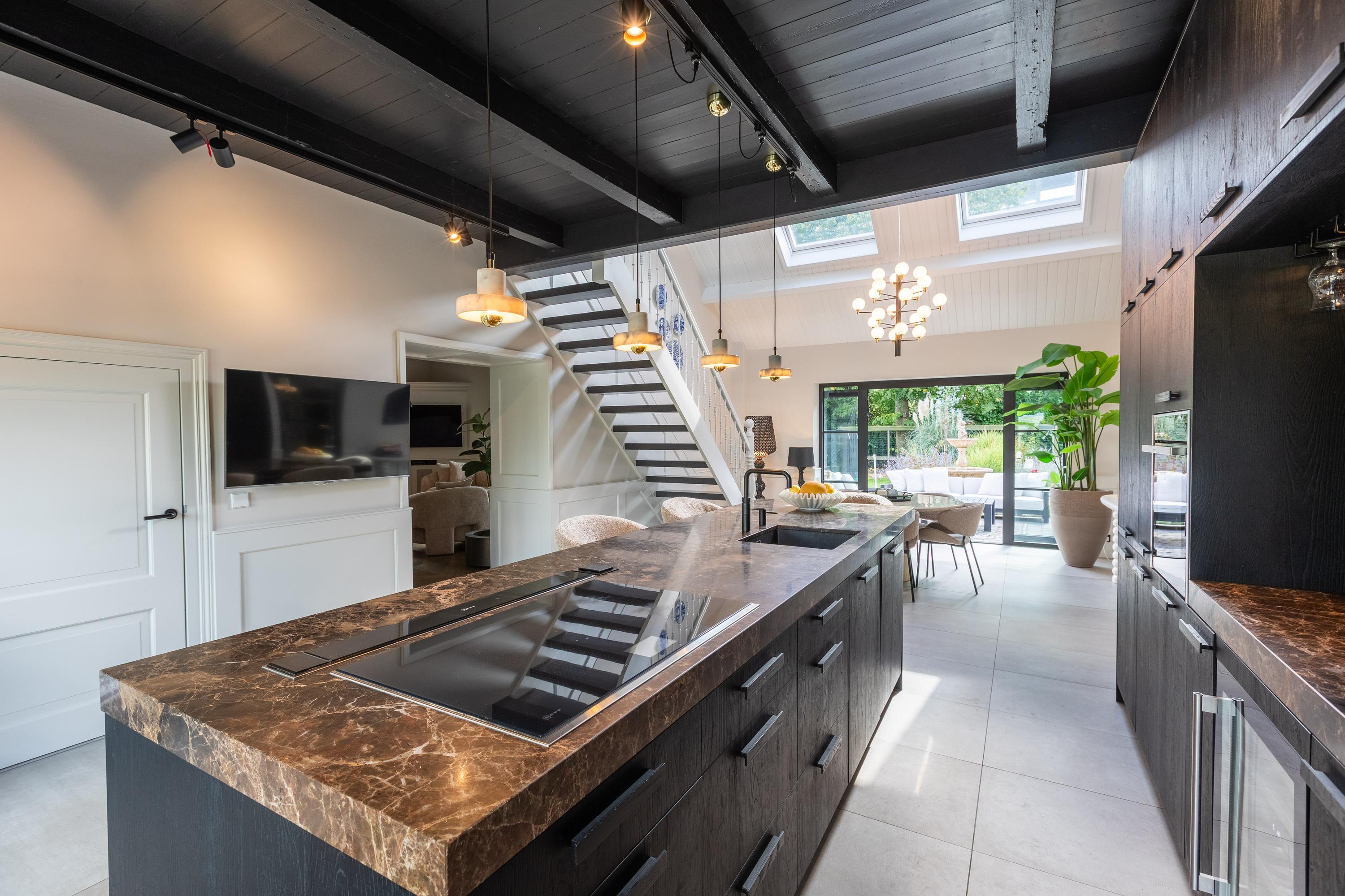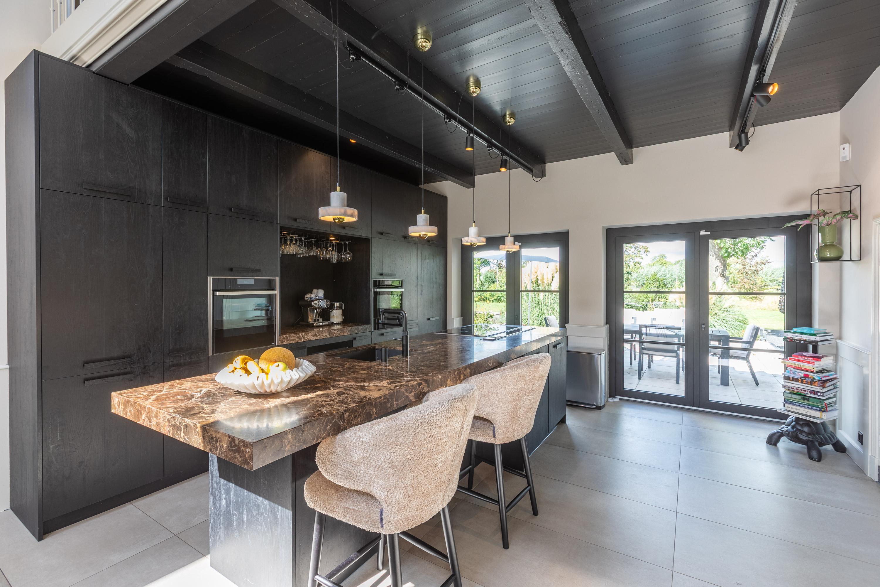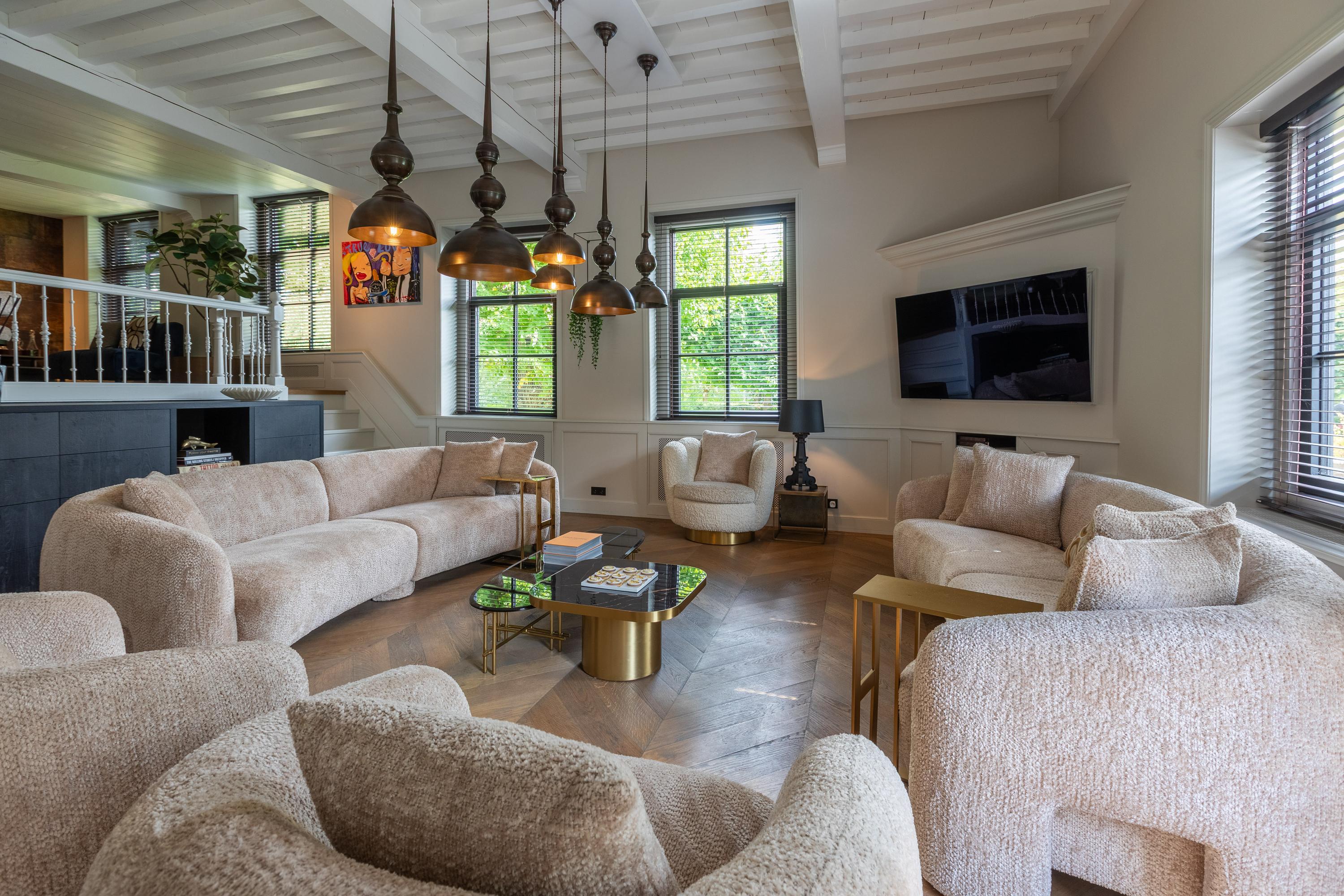 In addition, the ground floor features a second modern kitchen adjacent to the terrace and a multifunctional space of approximately 85 m² in the former stable, equipped with a bar, pantry, toilet, and access to the garages and storage space. On the other side of this space, you enter the spacious extension with wellness facilities, fully equipped with a jacuzzi, Finnish sauna, infrared sauna, and enough space for a large dining table or lounge set—a wonderful place to relax and enjoy each other's company.