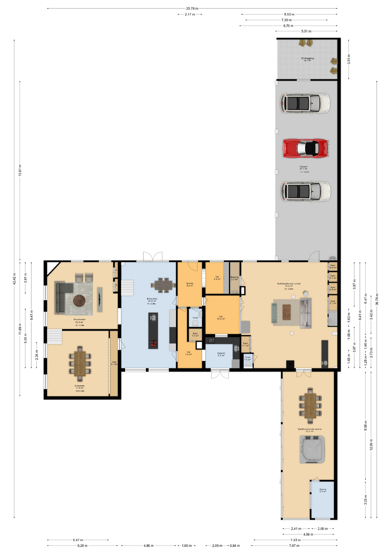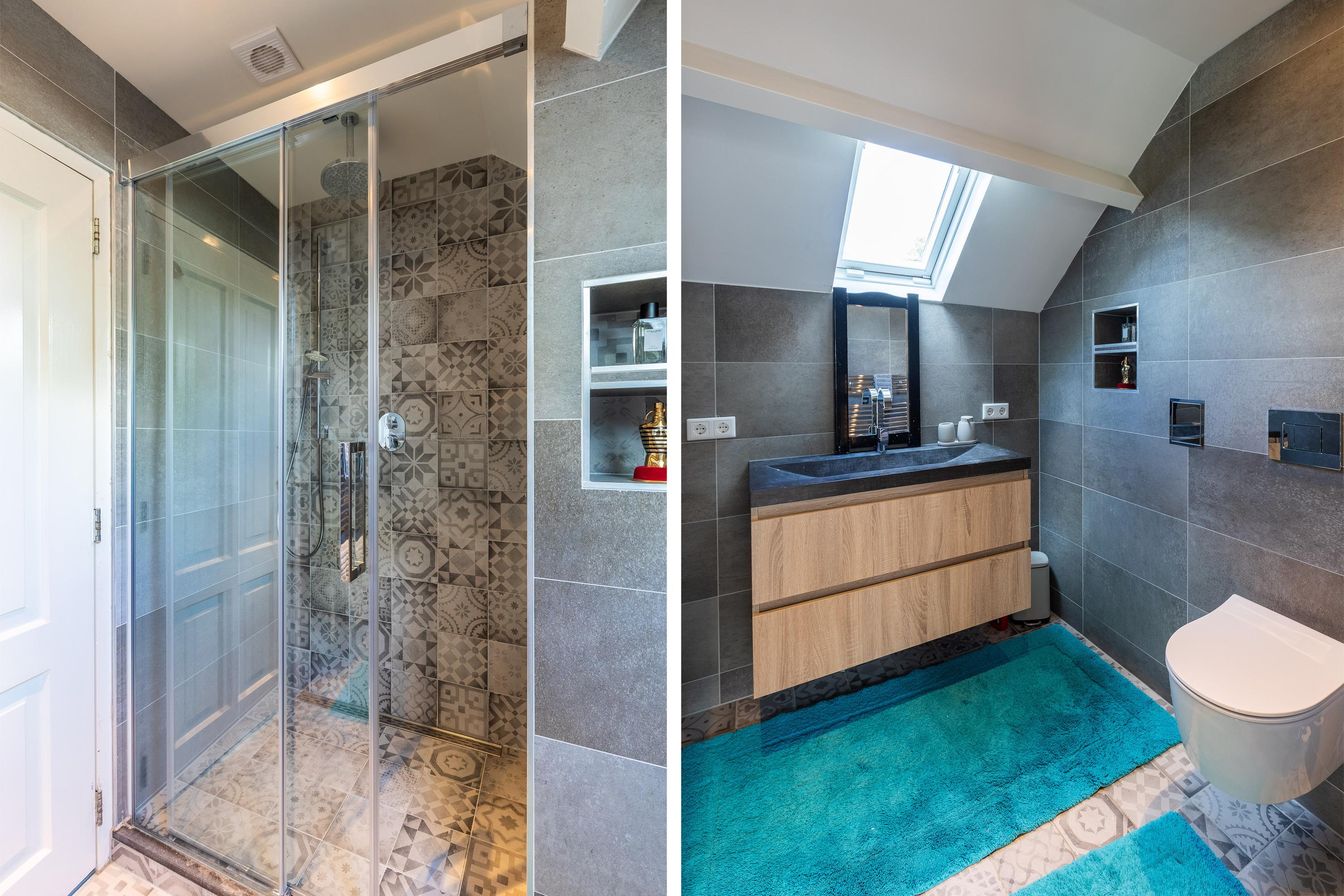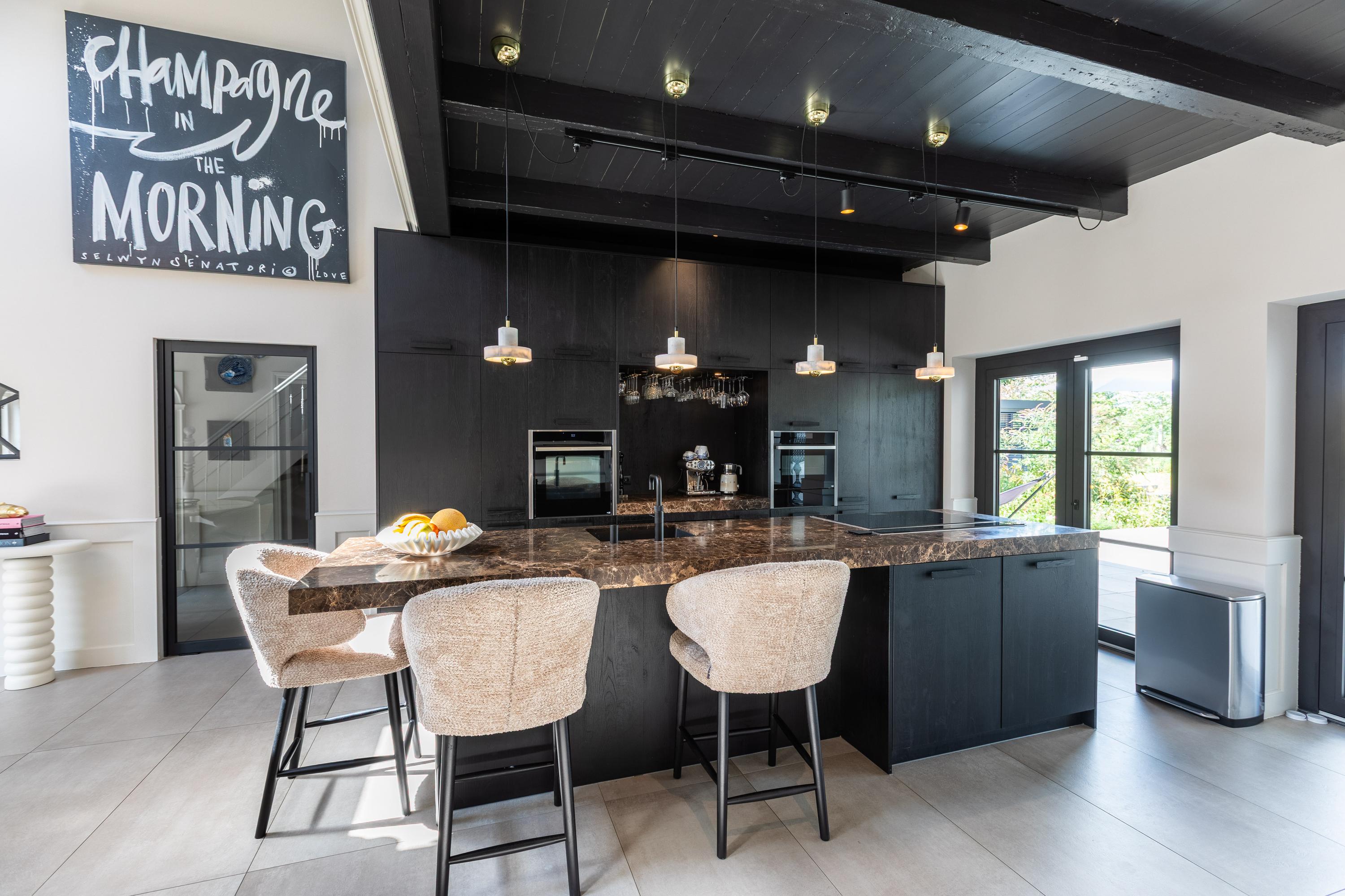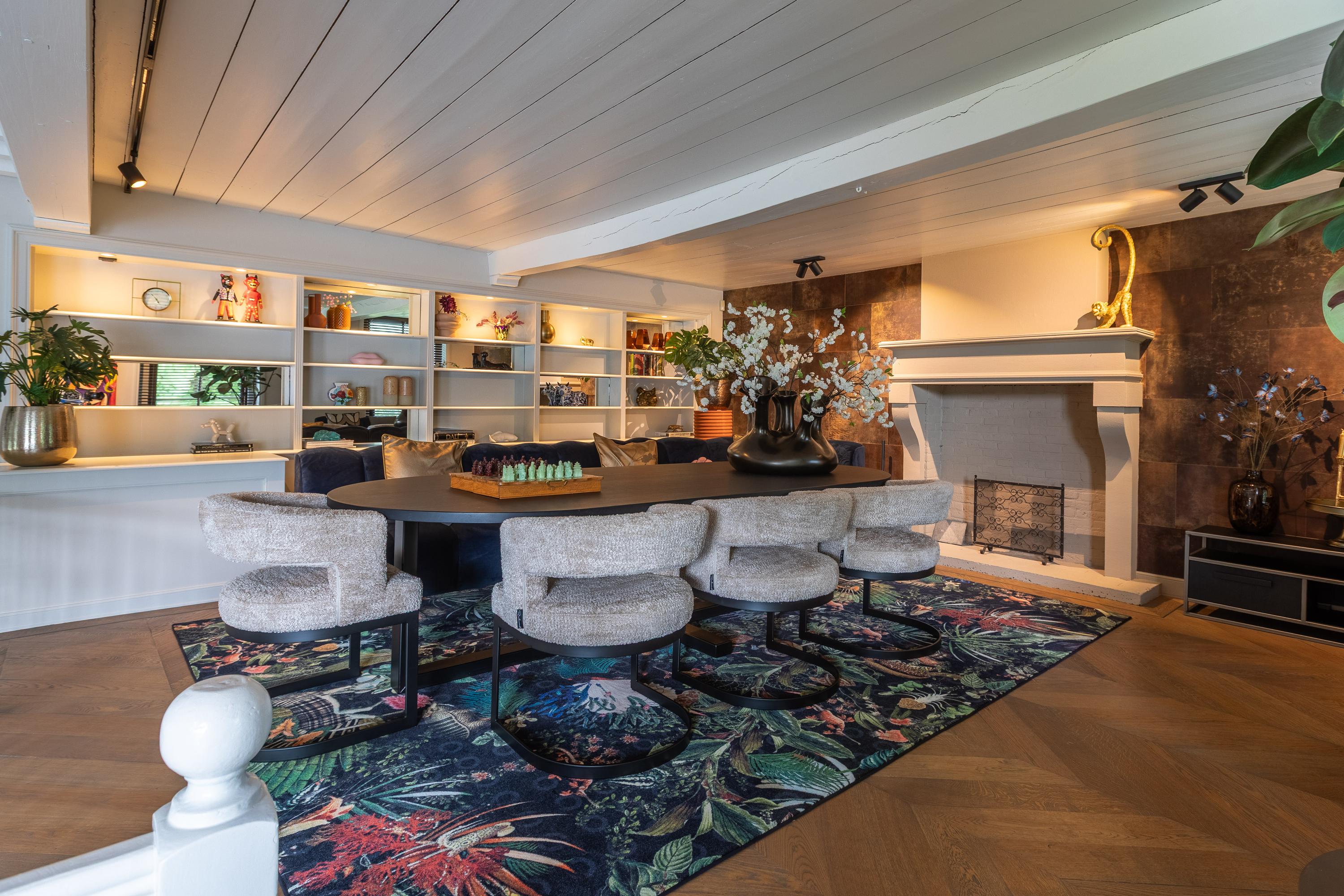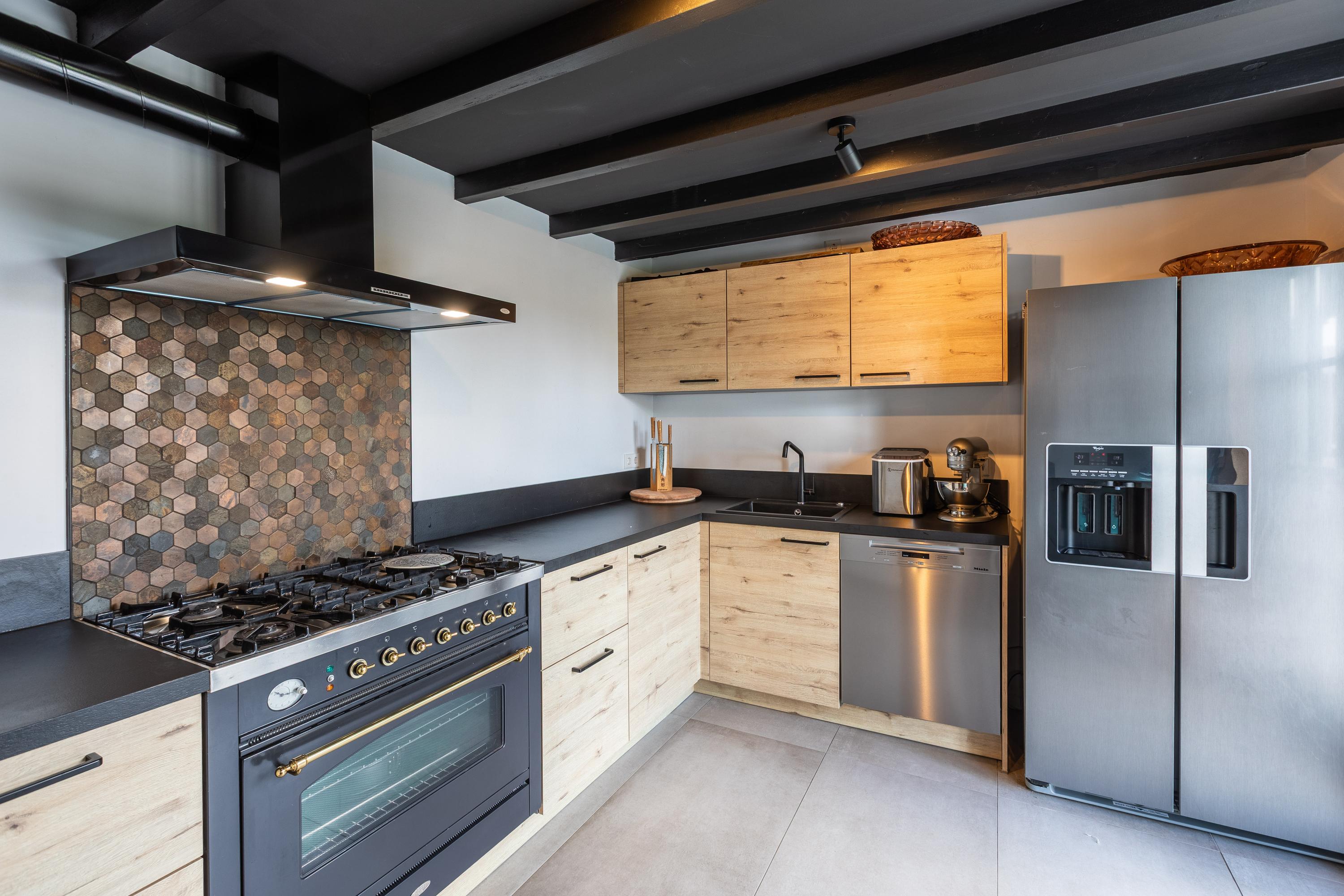 In addition, the ground floor features a second modern kitchen adjacent to the terrace and a multifunctional space of approximately 85 m² in the former stable, equipped with a bar, pantry, toilet, and access to the garages and storage space. On the other side of this space, you enter the spacious extension with wellness facilities, fully equipped with a jacuzzi, Finnish sauna, infrared sauna, and enough space for a large dining table or lounge set—a wonderful place to relax and enjoy each other's company.