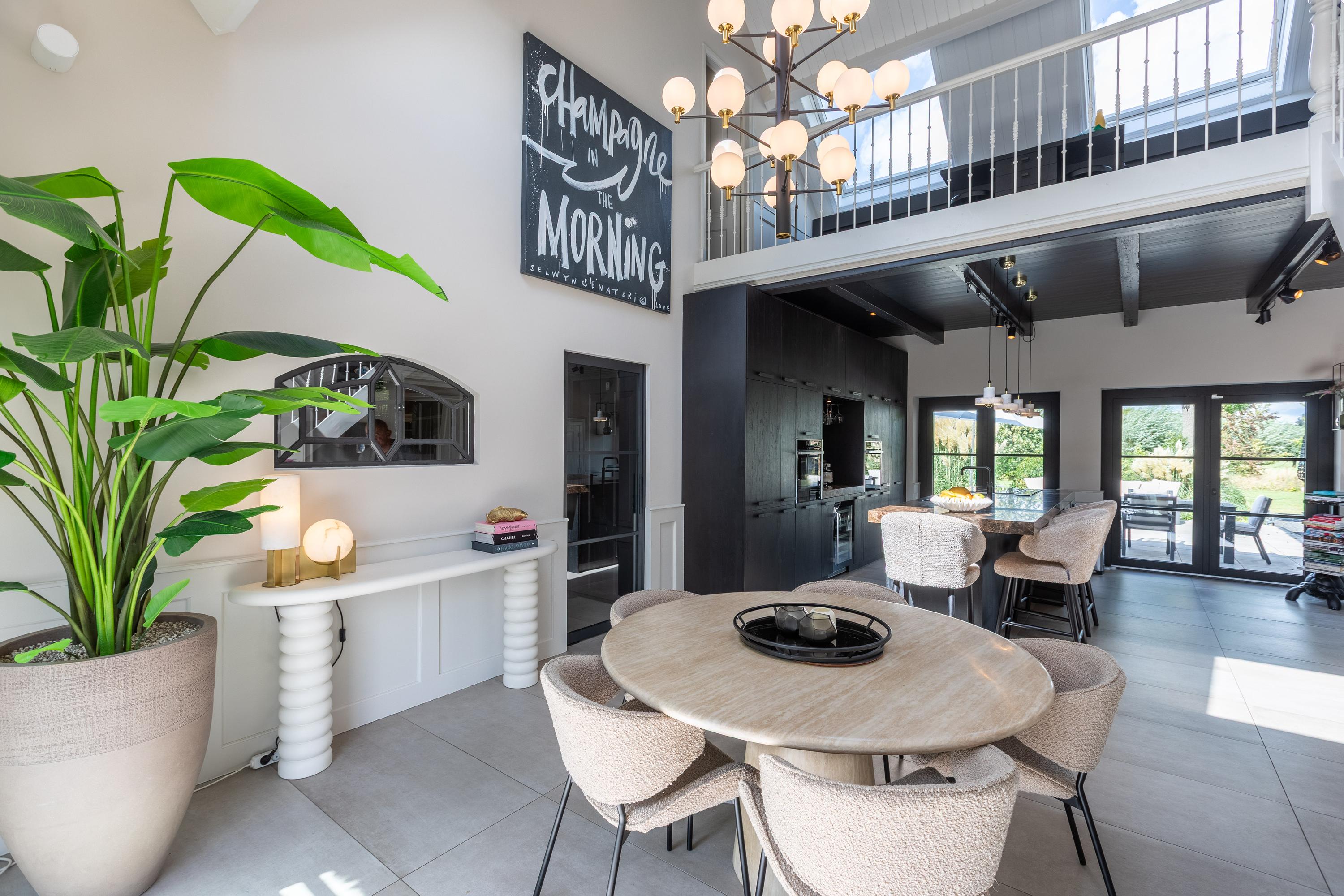 The entrance is centrally located and provides access to a spacious hall with a cloakroom and toilet. From here, you enter the impressive kitchen/diner of approx. 45 m², luxuriously equipped with a cooking island and high-quality built-in appliances. Thanks to the high ceiling and mezzanine, you can enjoy a wonderful sense of space here.