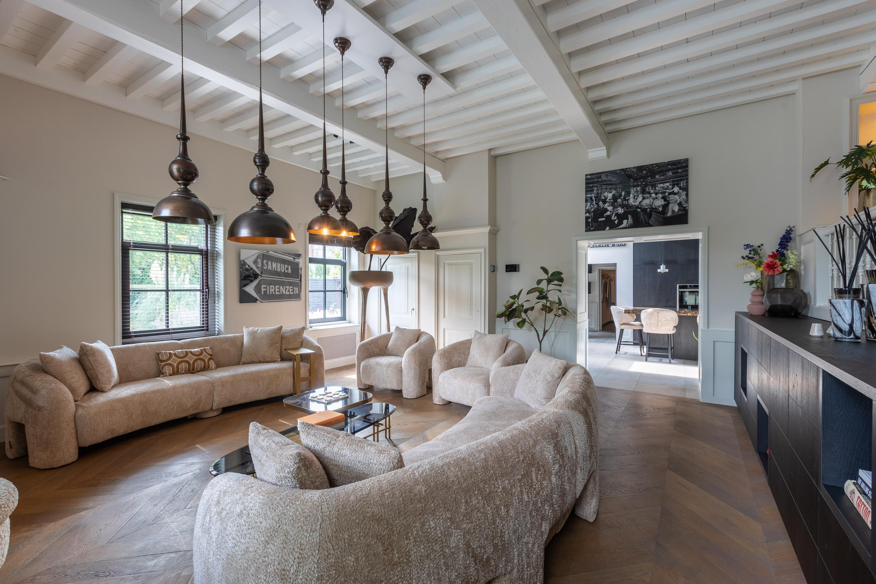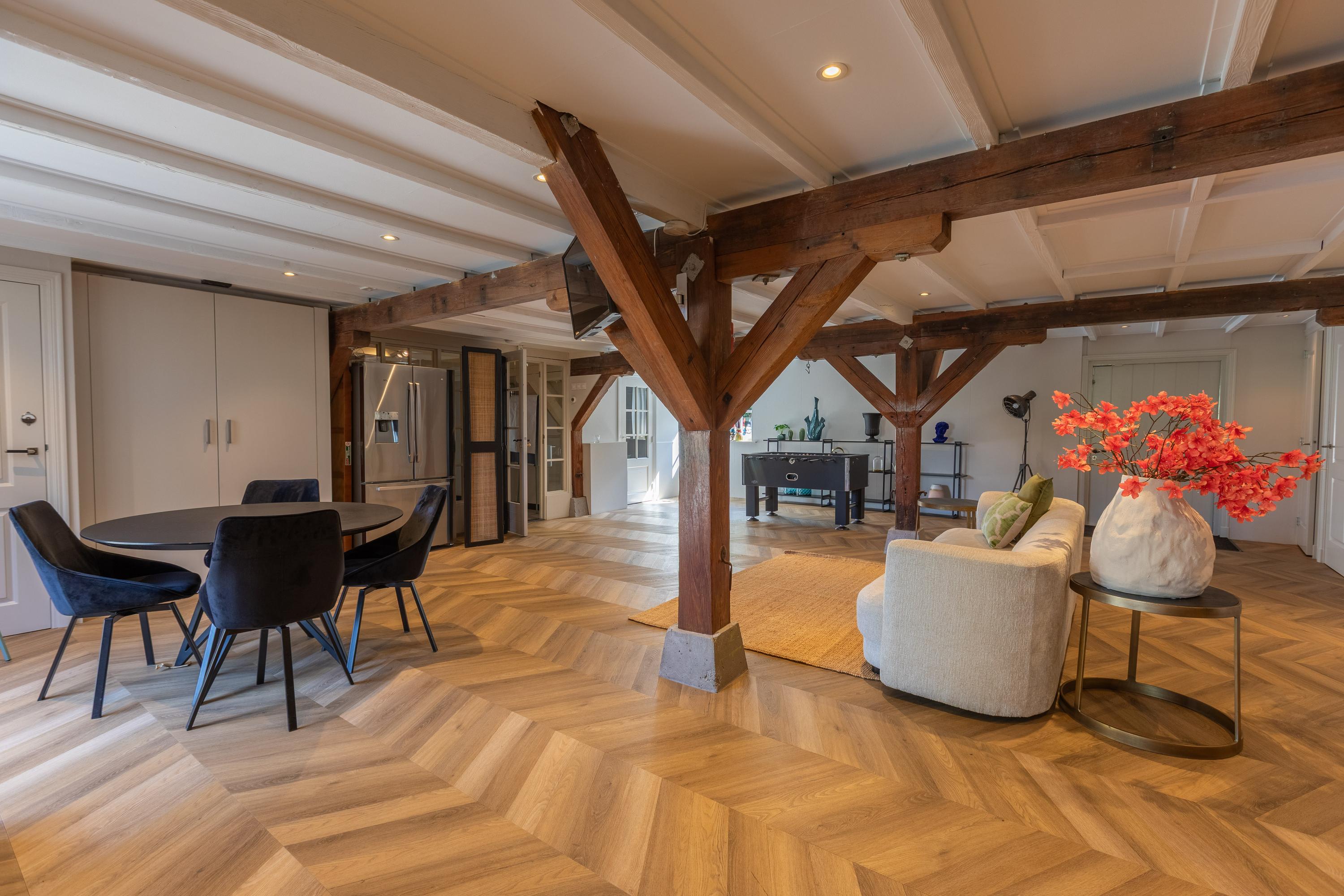 Adjacent to this is the stylish living room, consisting of two parts that can be arranged according to your own wishes. Currently, the dining room is located in the former upper room (the raised section) and the sitting room in the lower section, where the characteristic beamed ceiling immediately catches the eye. If desired, the dining room and living room can easily be swapped.