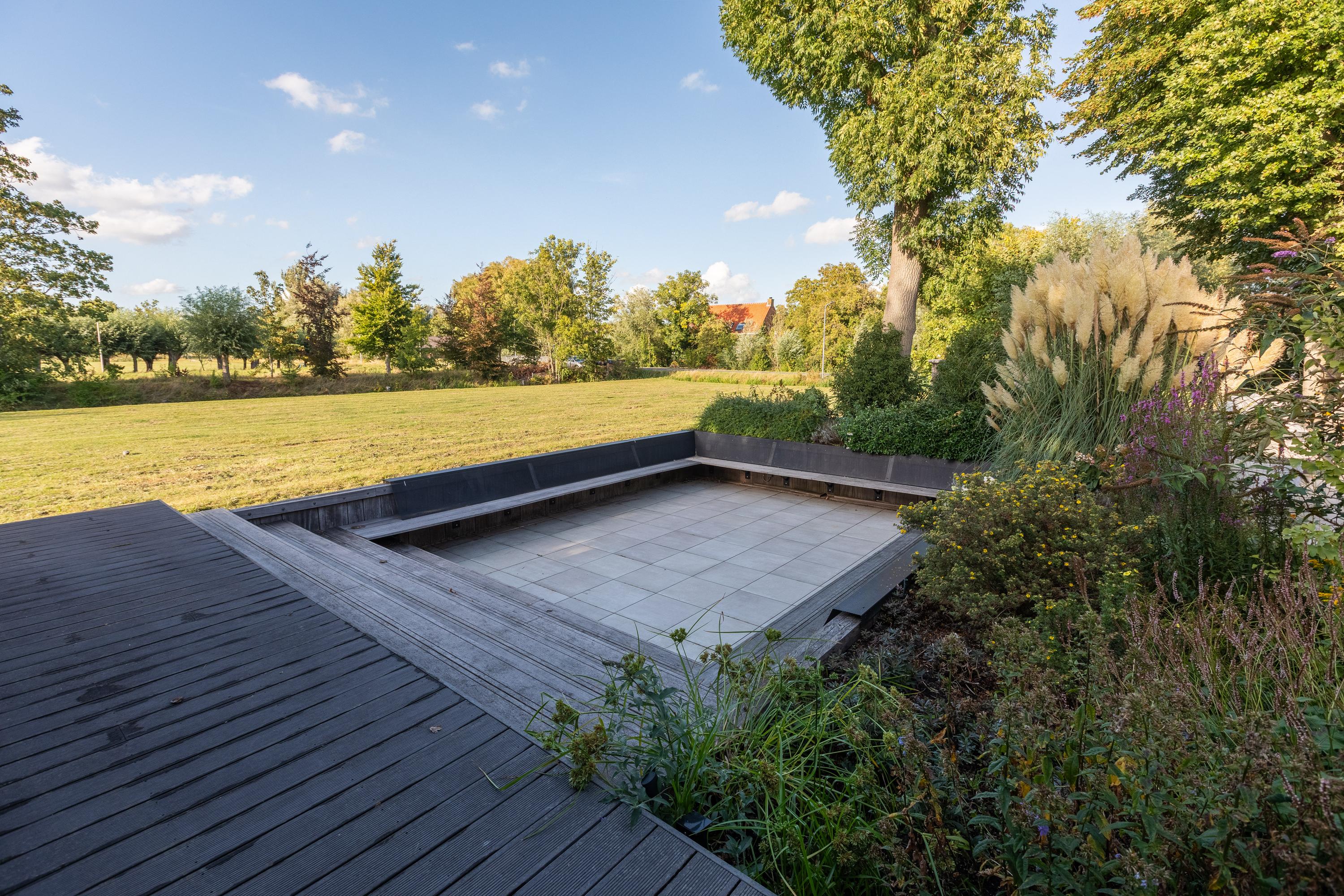 An electrically operated gate leads to the spacious front garden with several parking spaces. The garden is tastefully landscaped with terraces, a large lawn, borders, and a cozy sunken seating area adjacent to the meadow. The large shady tree and beautifully landscaped borders complete the picture. Here you will experience a unique combination of luxury, comfort, and rural charm—an outdoor space that invites you to enjoy every season to the fullest.