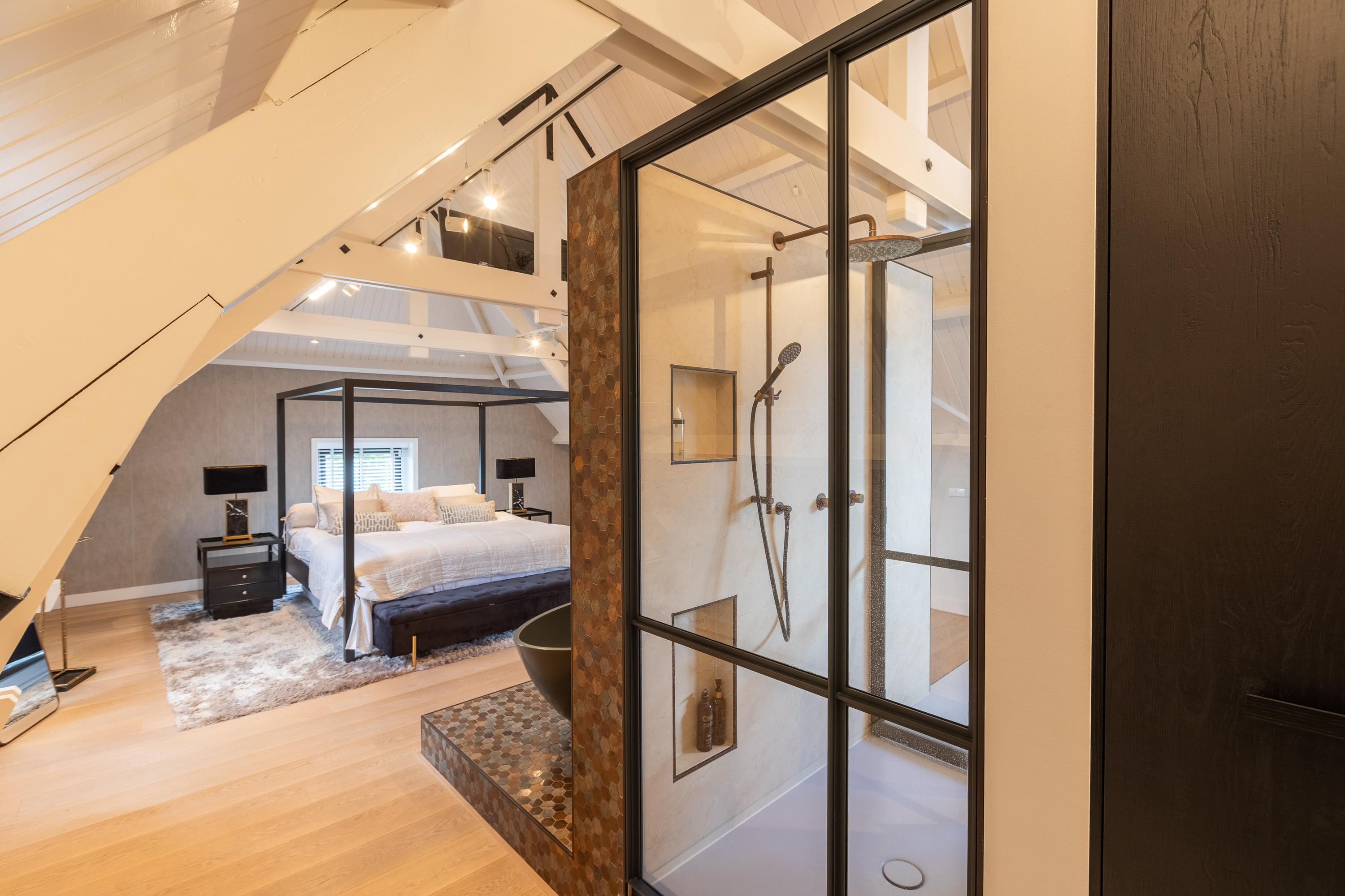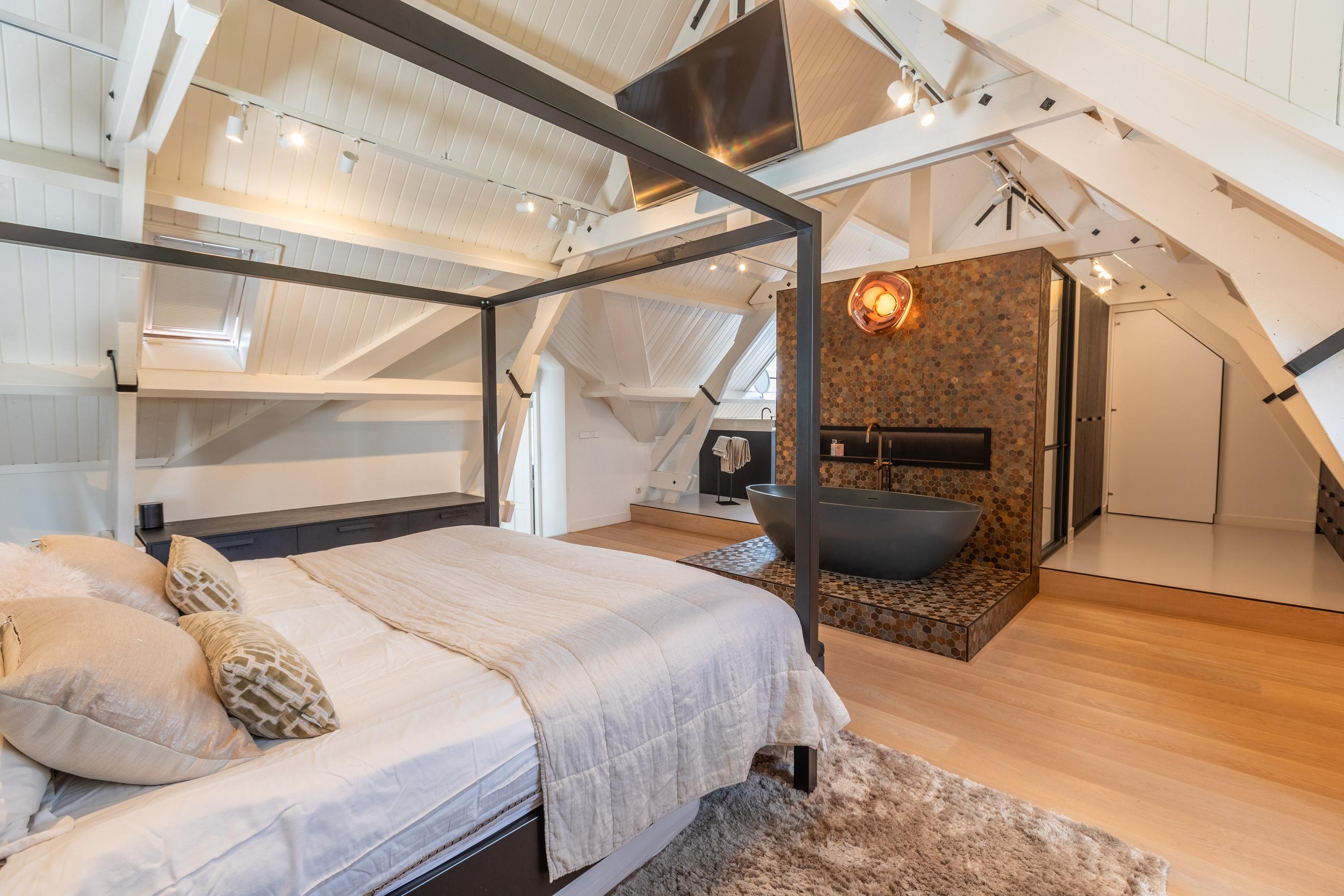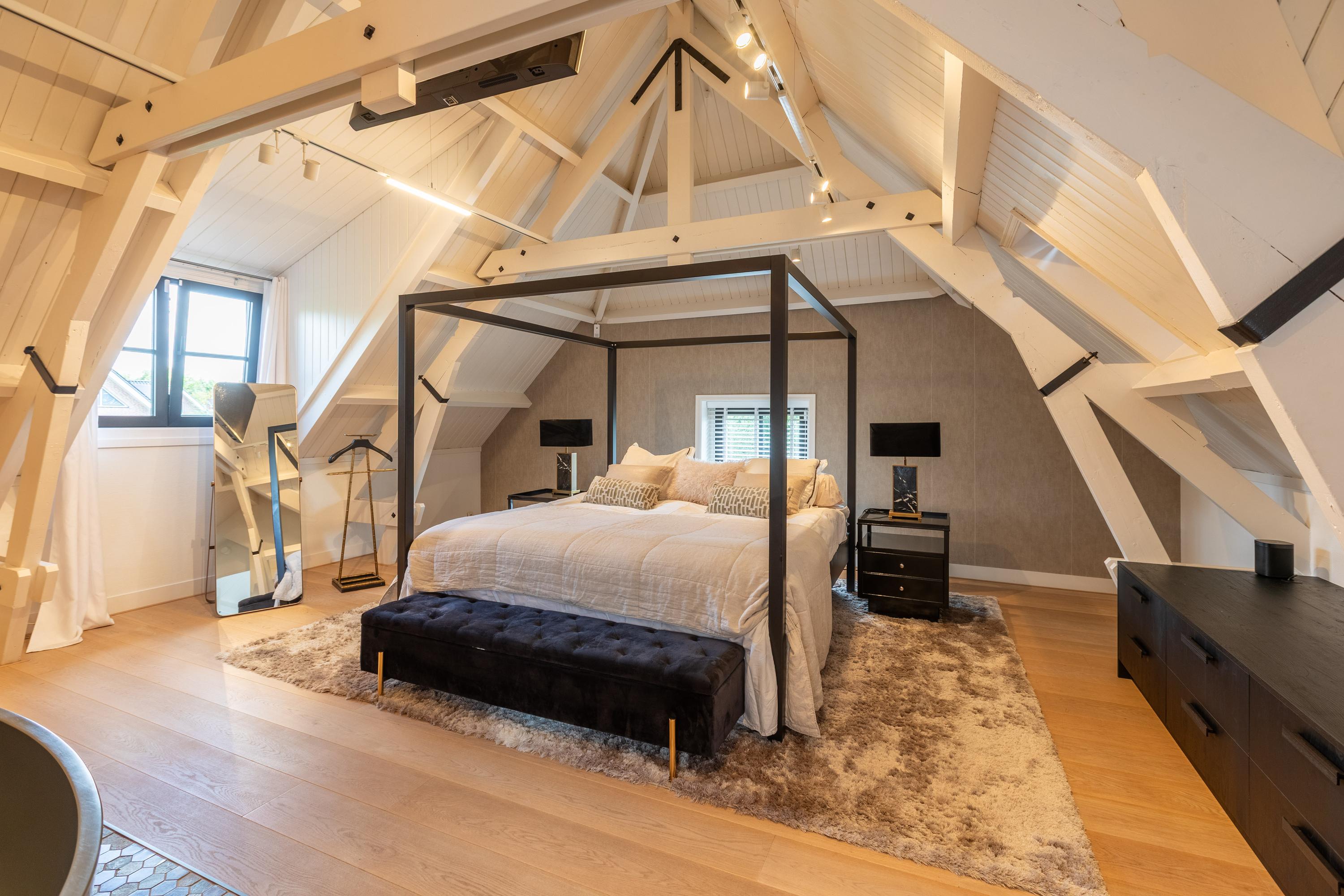 A spacious landing above the kitchen provides access to the master bedroom (approx. 65 m²) with air conditioning and characteristic wooden beams, a luxurious en-suite bathroom with freestanding bath, walk-in shower, toilet, and double sink, plus a walk-in closet with dormer window and views of the greenery of Midden-Delfland.