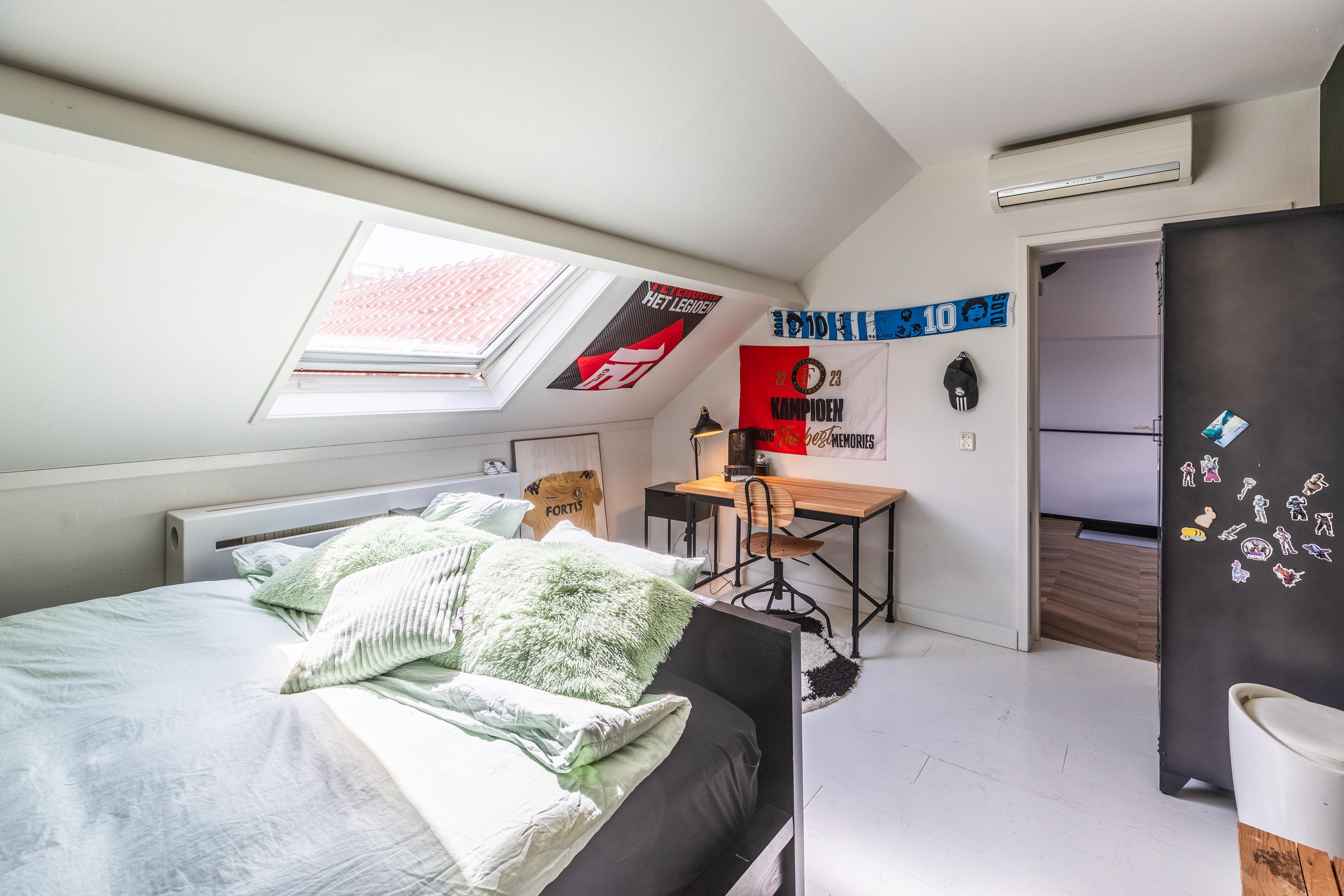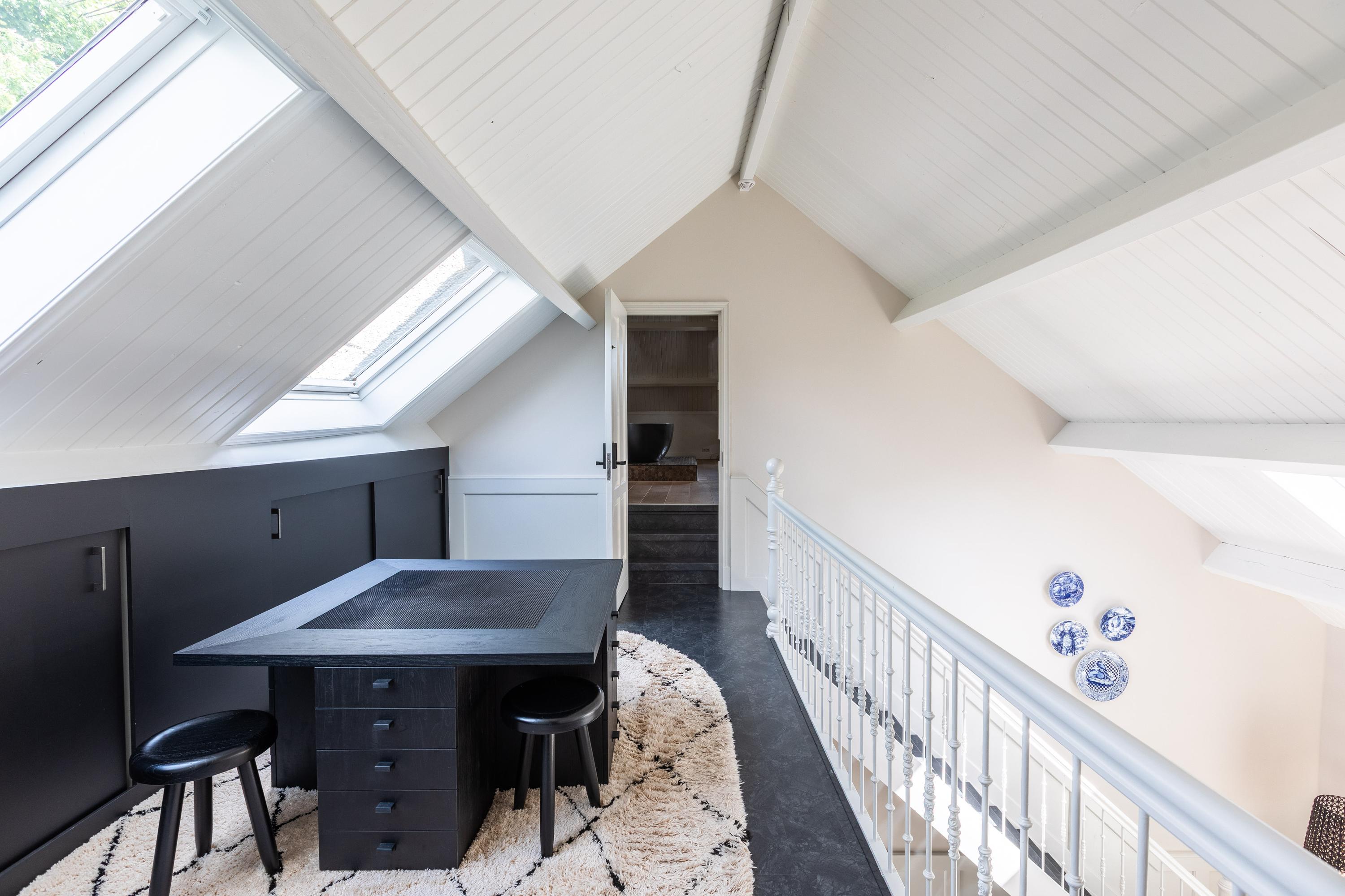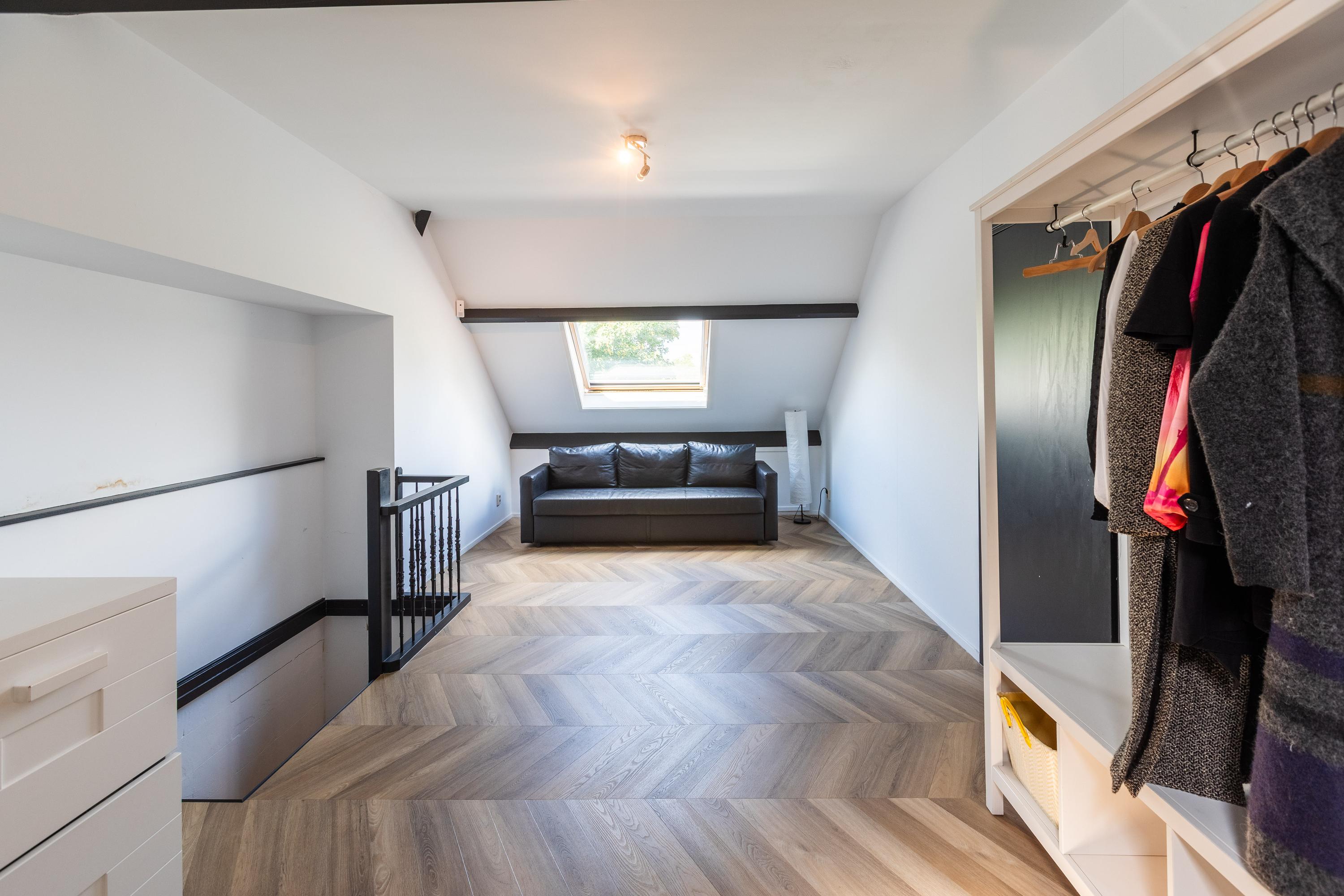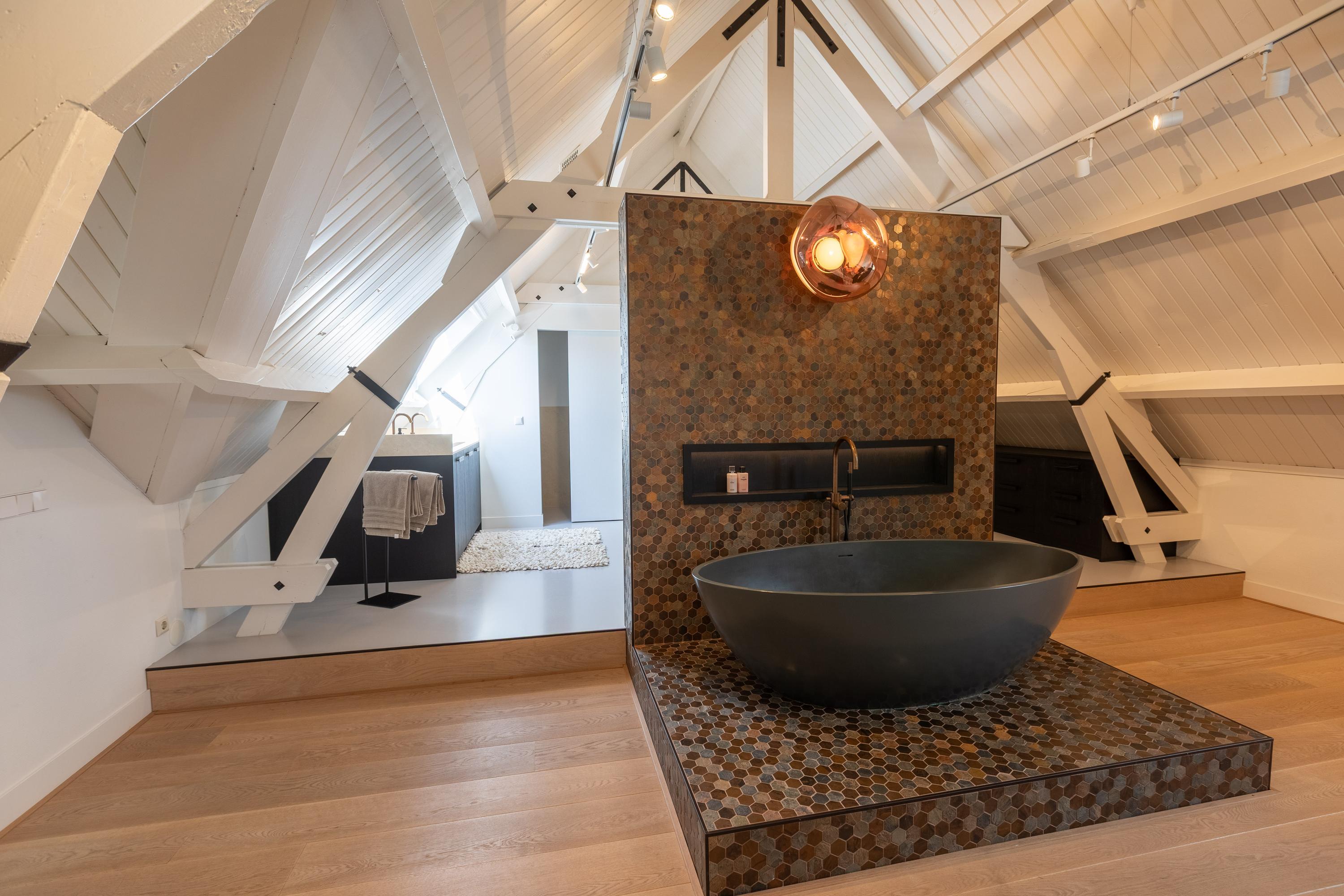 A spacious landing above the kitchen provides access to the master bedroom (approx. 65 m²) with air conditioning and characteristic wooden beams, a luxurious en-suite bathroom with freestanding bath, walk-in shower, toilet, and double sink, plus a walk-in closet with dormer window and views of the greenery of Midden-Delfland.