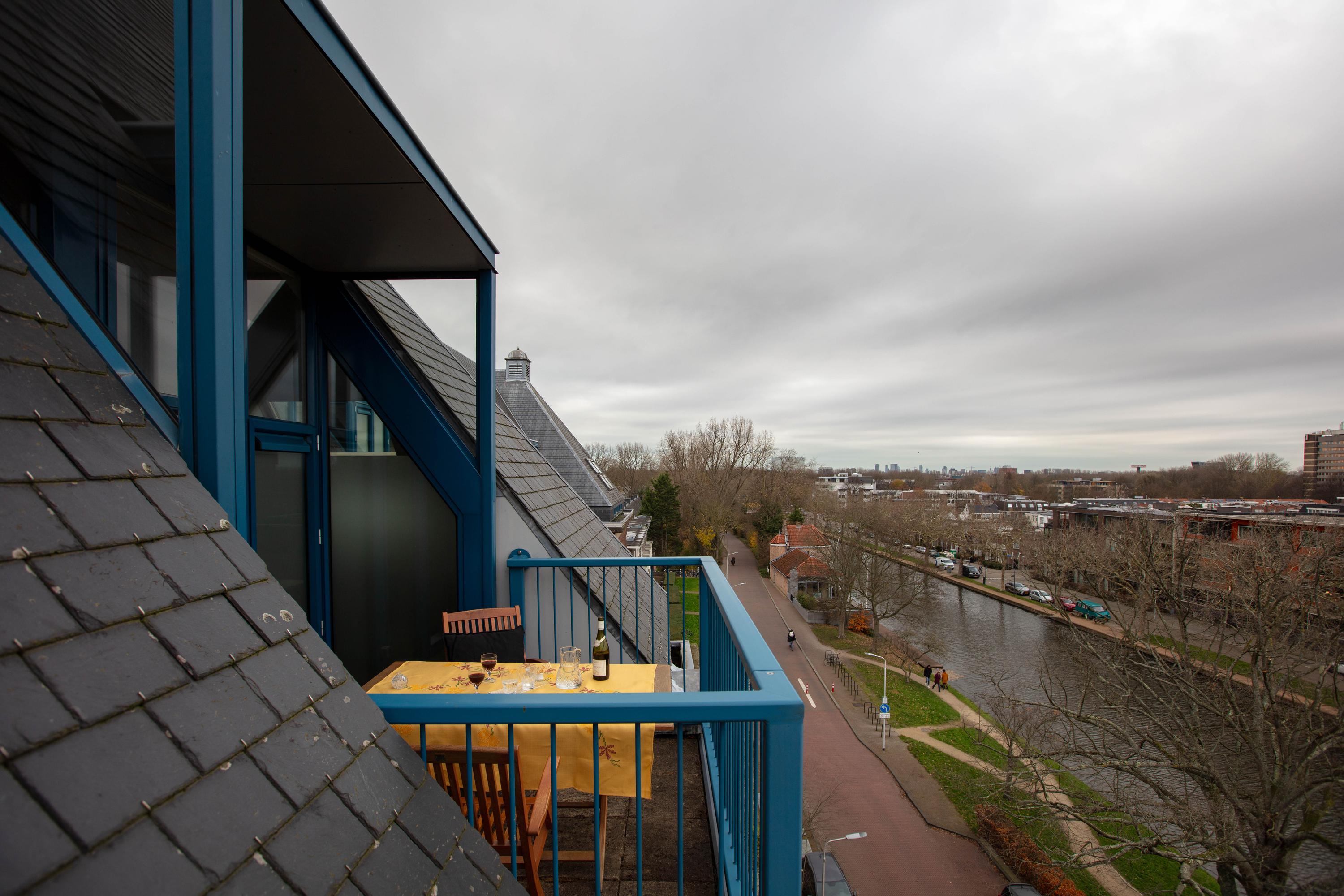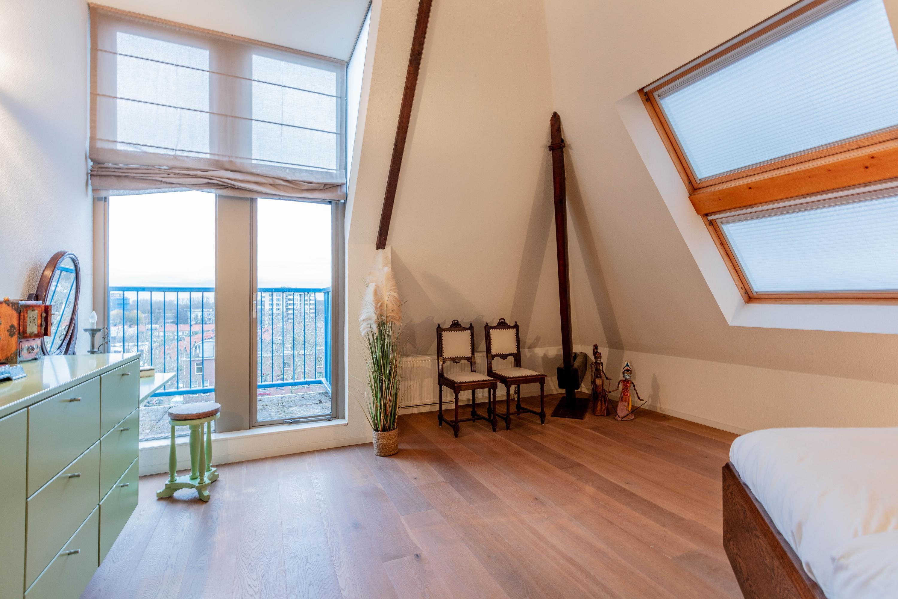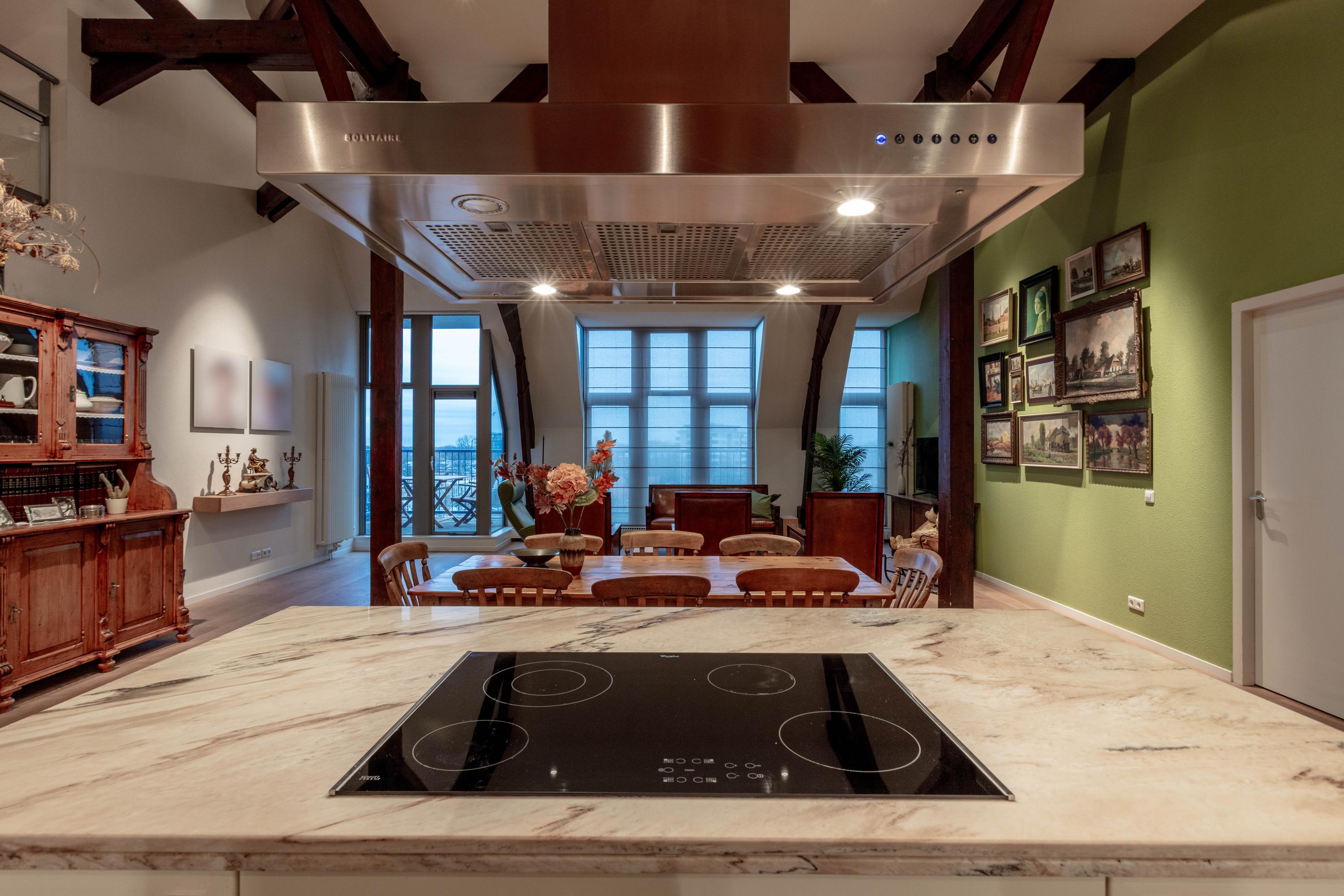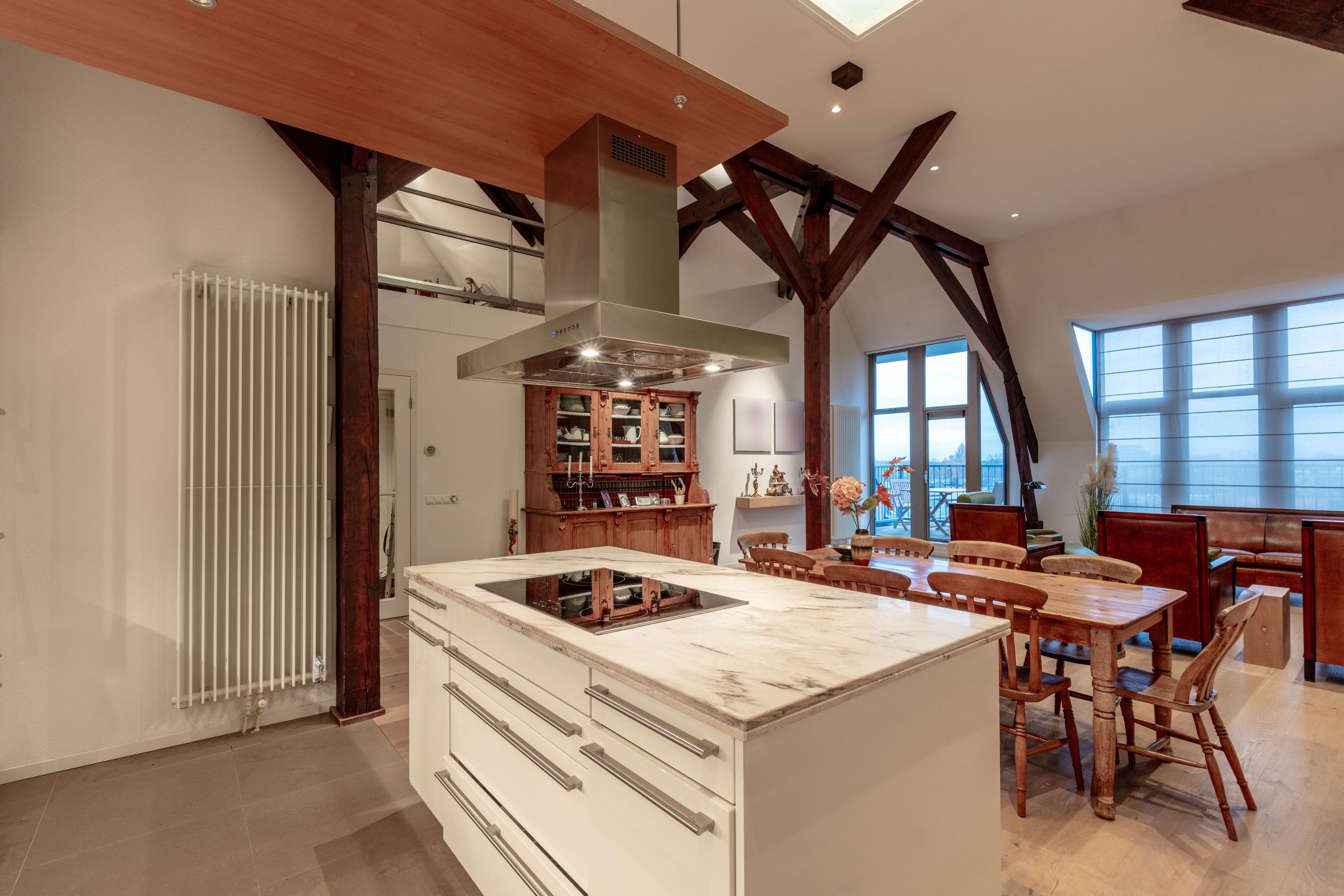 Inside, two generous bedrooms each provide a dedicated bathroom and direct access to an outdoor balcony, capturing open sightlines over Delft and the Schie. The voluminous living area features oak parquet flooring and soaring ceilings, while the Siematic kitchen is fitted with a marble countertop and premium integrated appliances. A mezzanine overlooks the main living zone, providing space for fitness, play, or retreat.