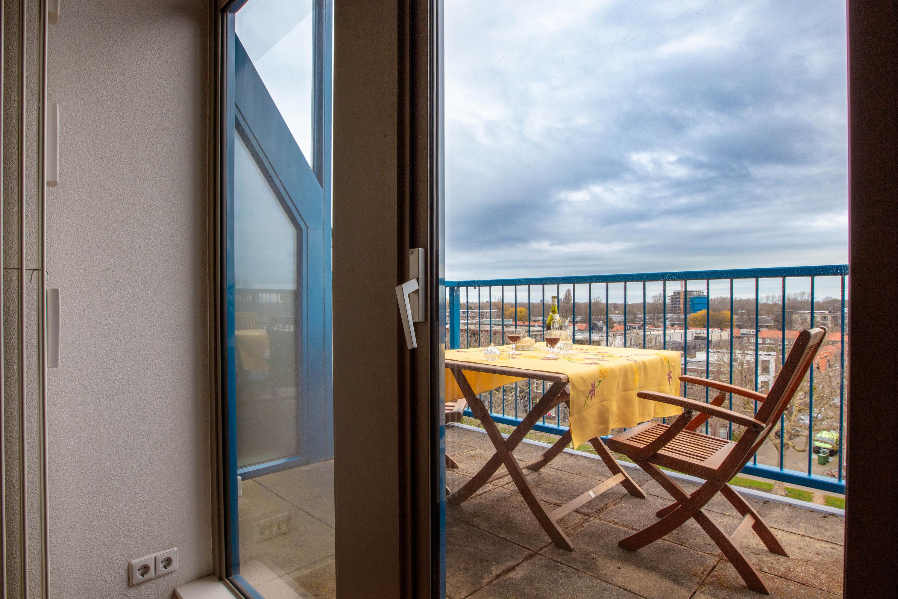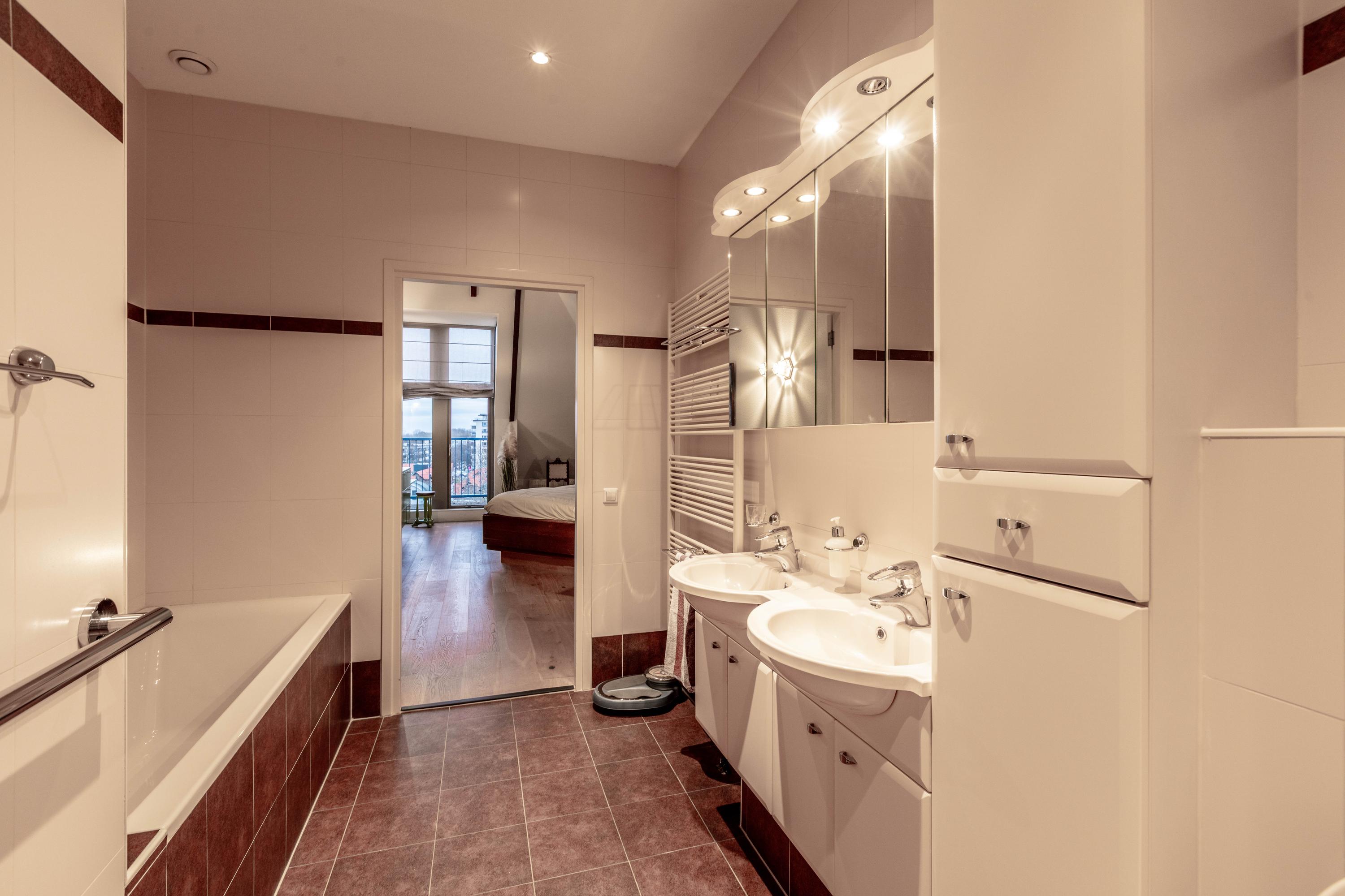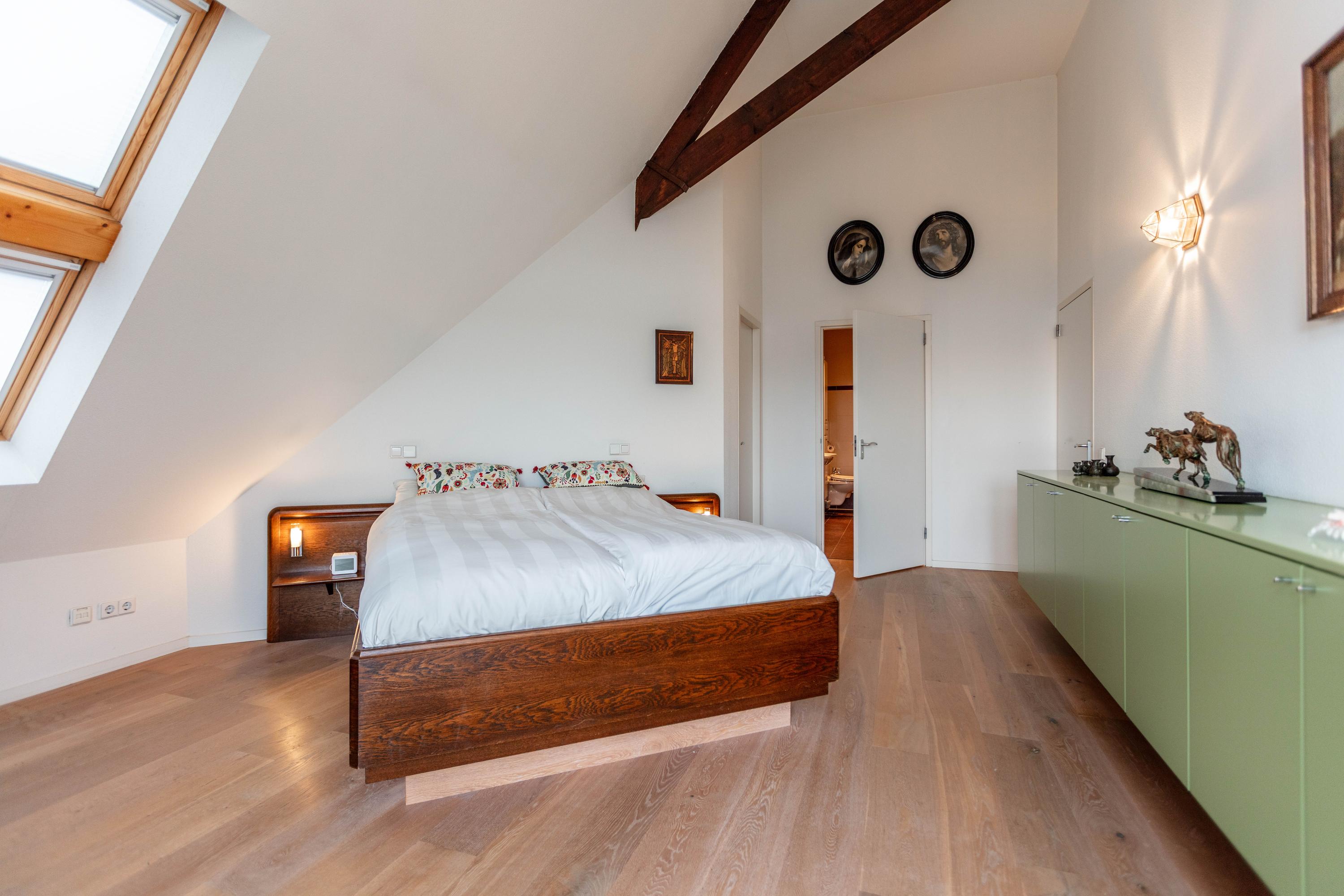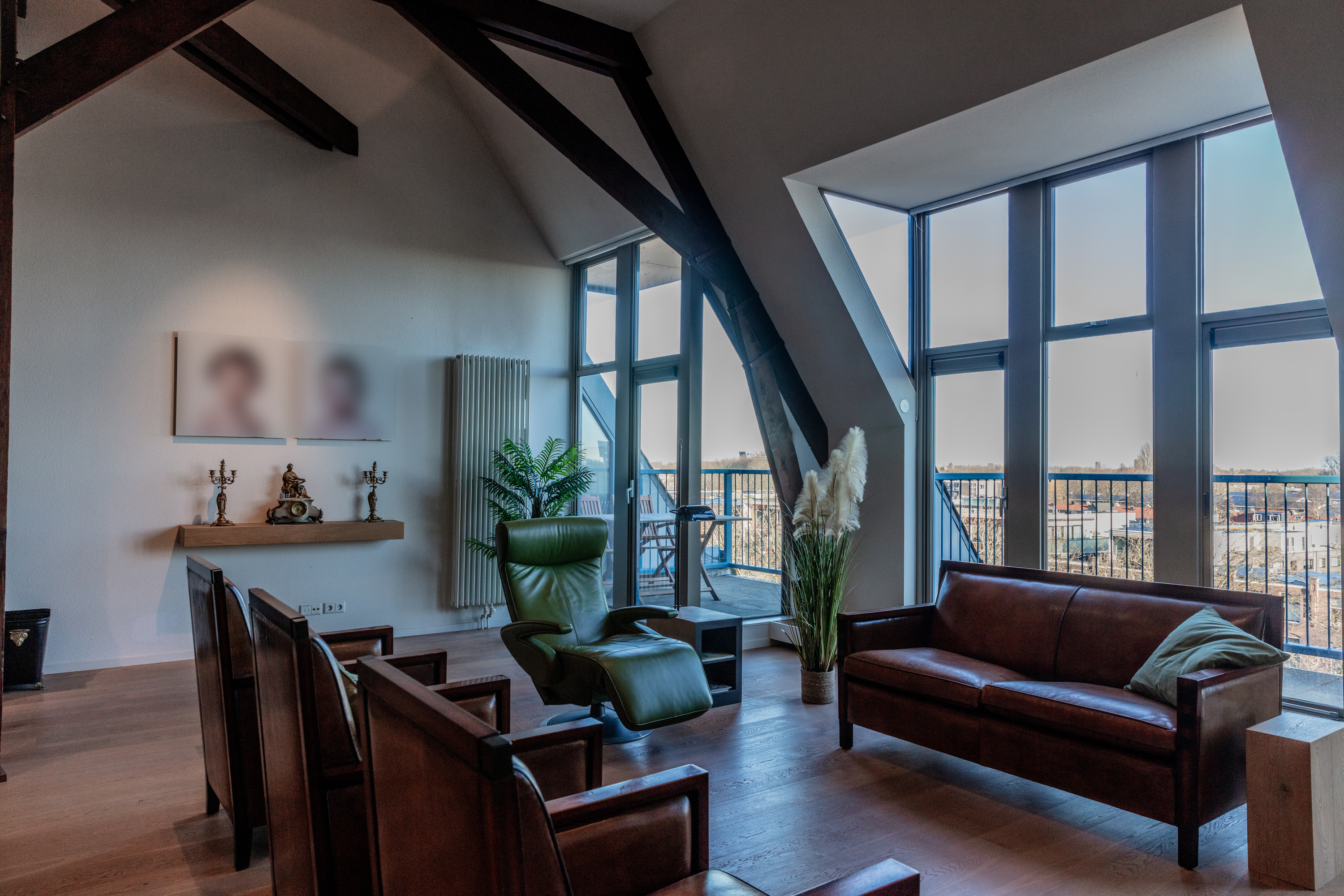Inside, two generous bedrooms each provide a dedicated bathroom and direct access to an outdoor balcony, capturing open sightlines over Delft and the Schie. The voluminous living area features oak parquet flooring and soaring ceilings, while the Siematic kitchen is fitted with a marble countertop and premium integrated appliances. A mezzanine overlooks the main living zone, providing space for fitness, play, or retreat.