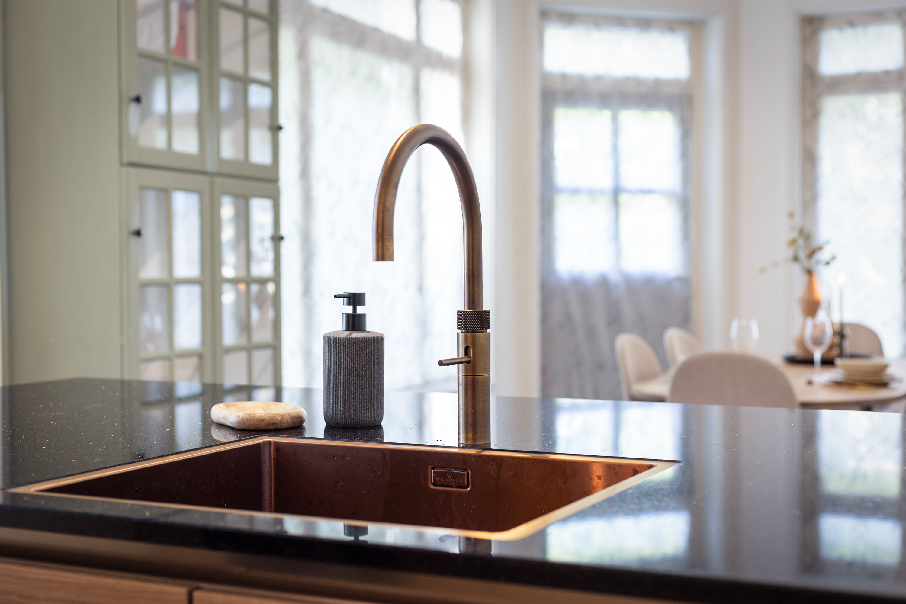 The kitchen-diner forms the heart of the home. Large new windows and the renewed door to the front garden create a light and welcoming space. The brand-new Siematic kitchen features a dual arrangement with island and is fitted with Siemens appliances, including an induction hob with fish burner, combi-oven, built-in coffee machine with warming drawer, dishwasher and a stylish bronze-coloured Quooker. The black granite worktop contrasts beautifully with the oak cabinetry and the marbled splashback. Additional cabinetry has been added at the rear of the island, ensuring practicality and design go hand in hand. The adjoining dining area is generous, easily accommodating a large table, with French doors opening directly onto the south-west facing terrace.