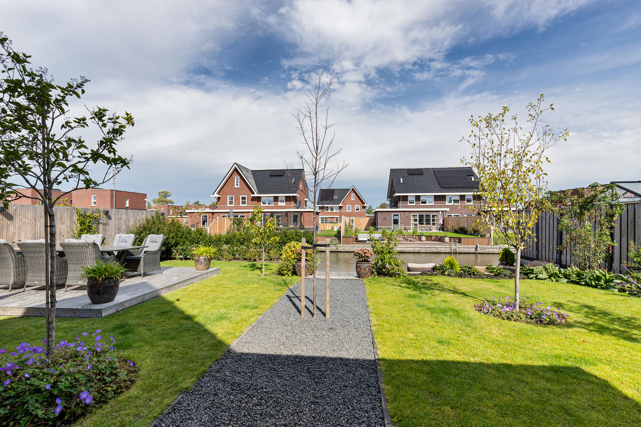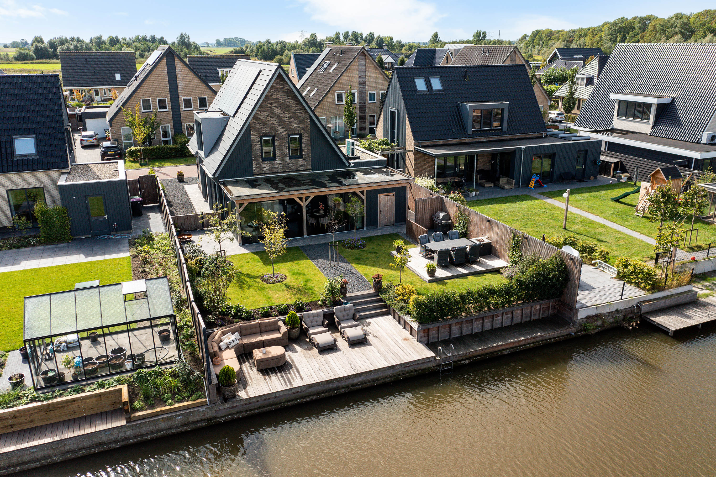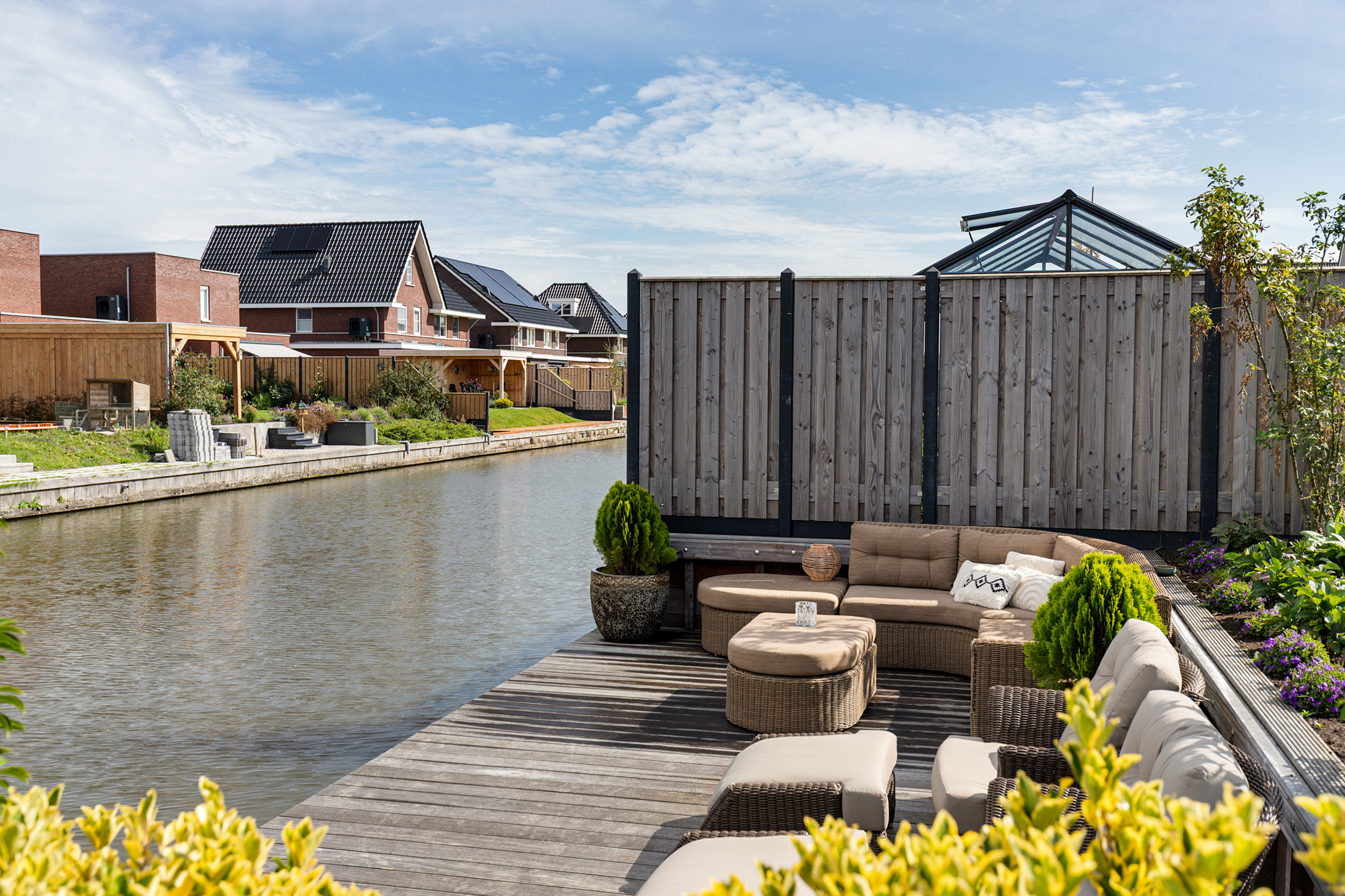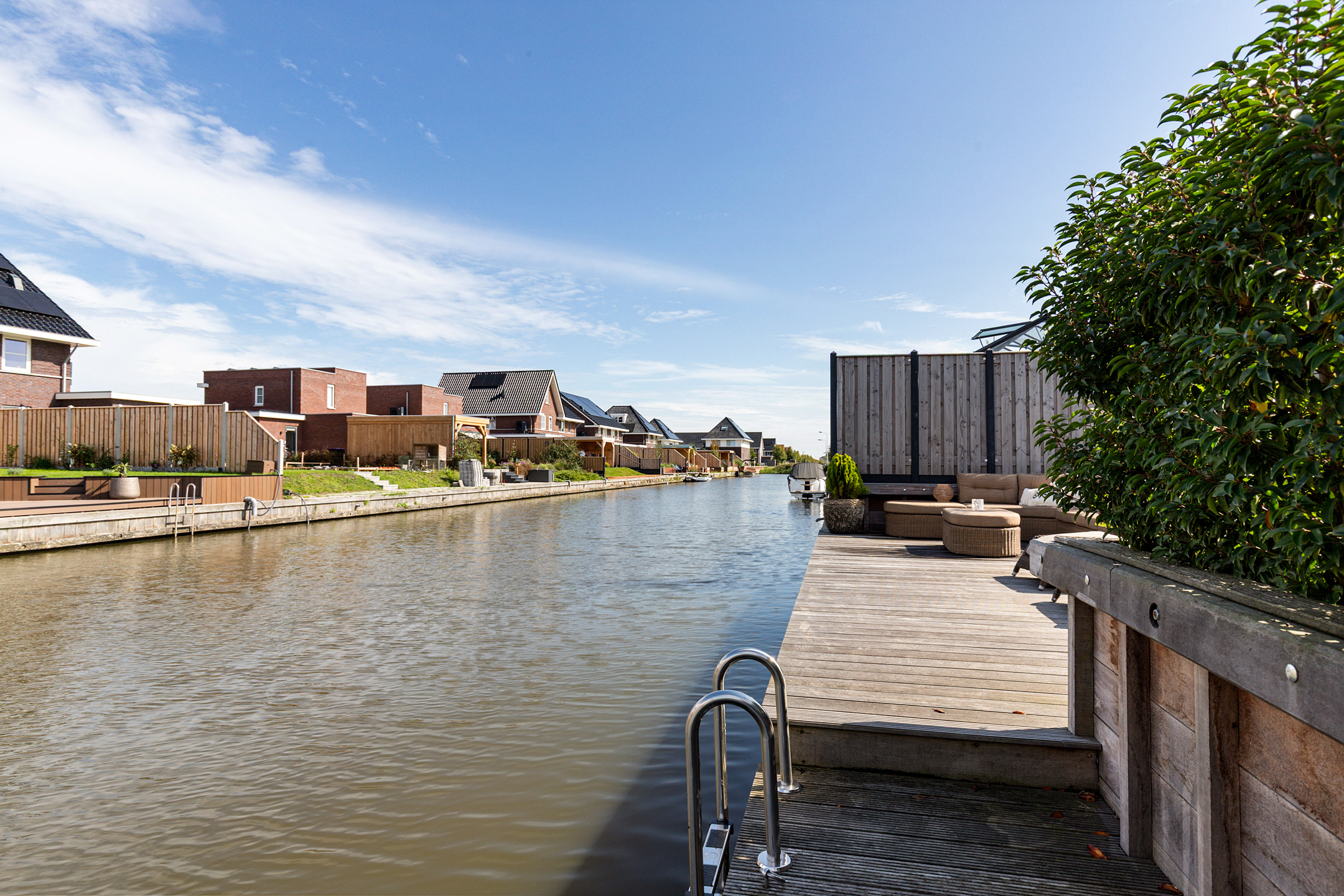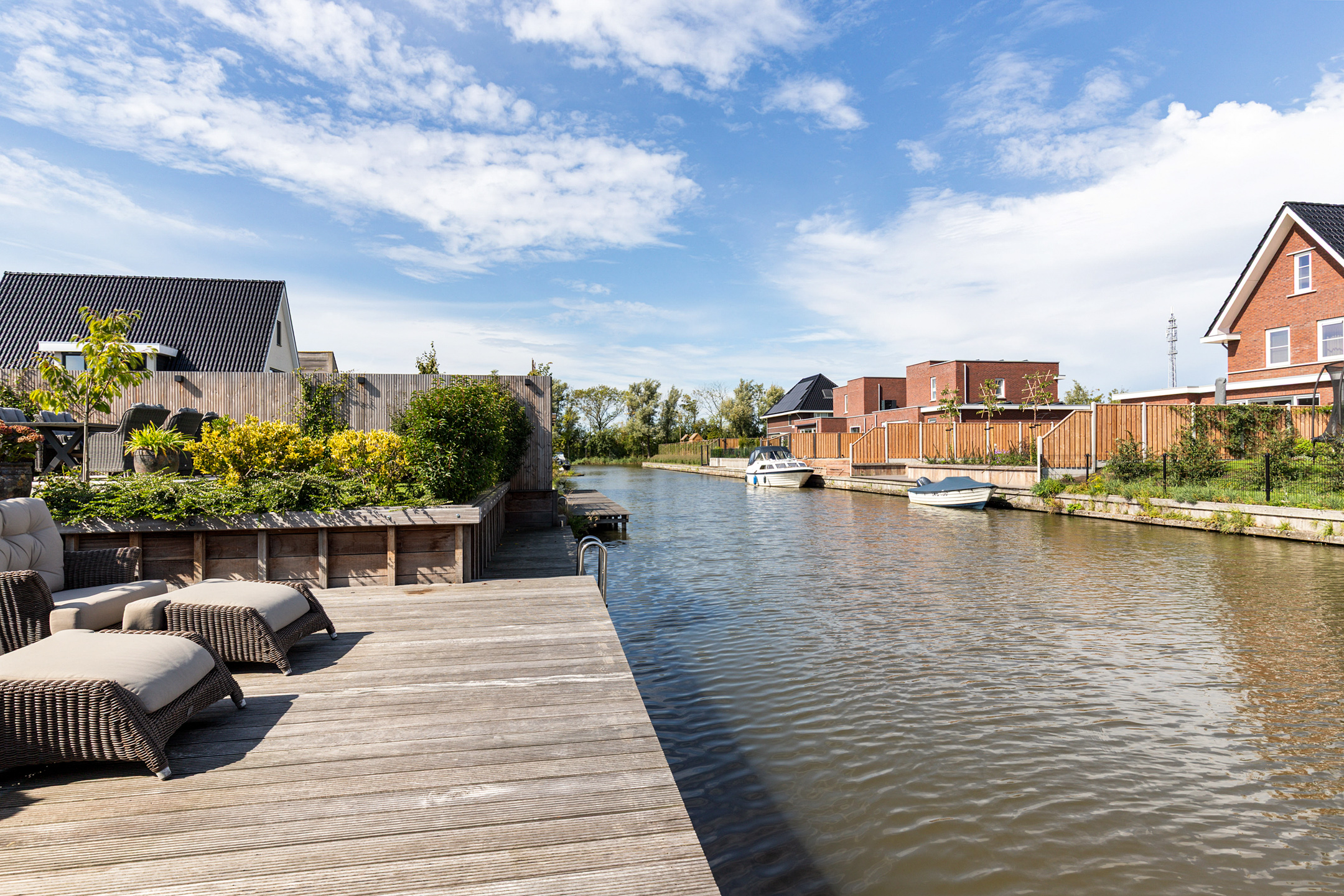 The 15-metre hardwood jetty, set slightly lower for easy access, is a true highlight – ideal for mooring your boat, enjoying water sports, or creating a private waterfront lounge. Thanks to the lush greenery, the garden guarantees both seclusion and a perfect balance of sun and shade.