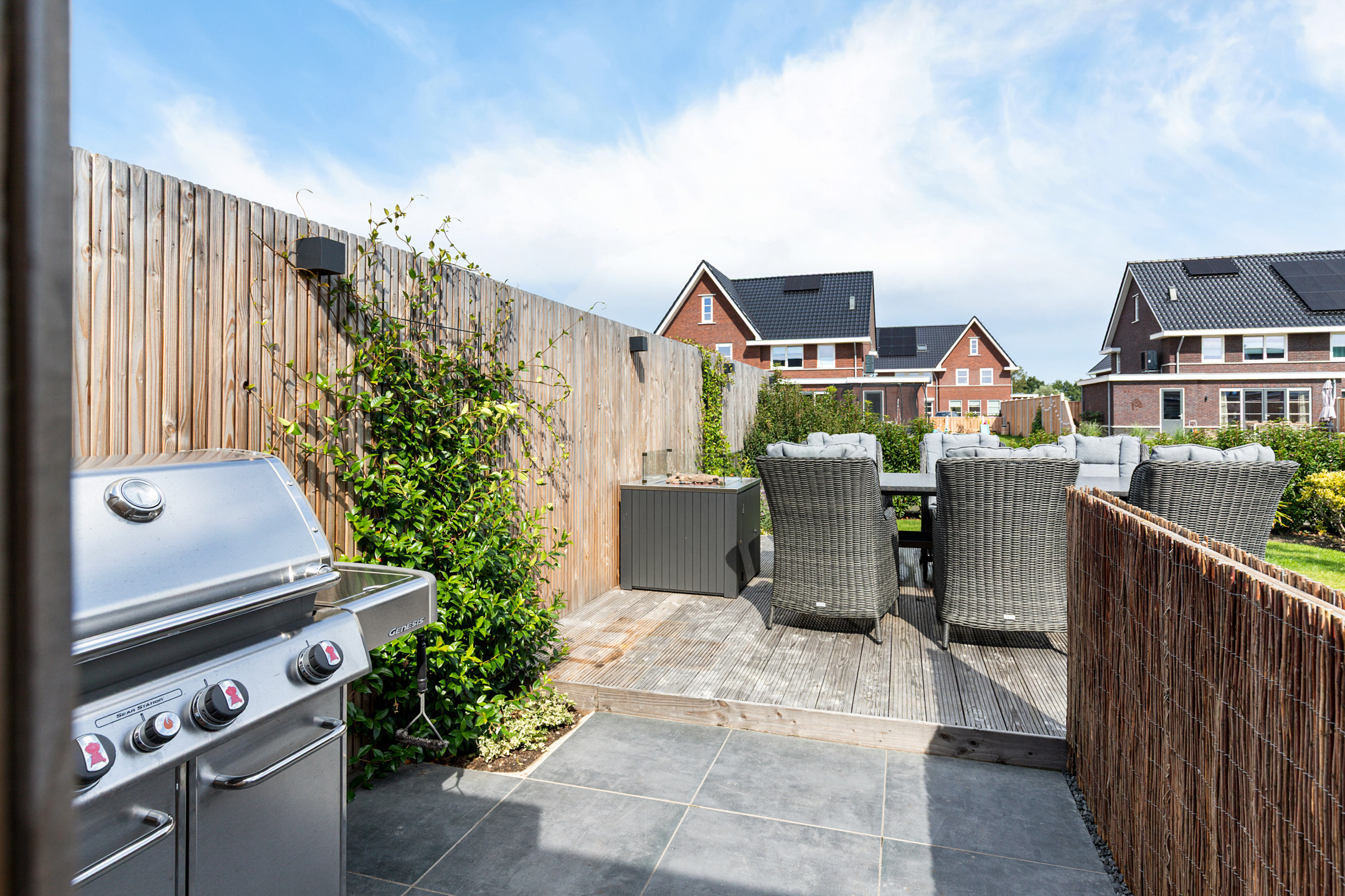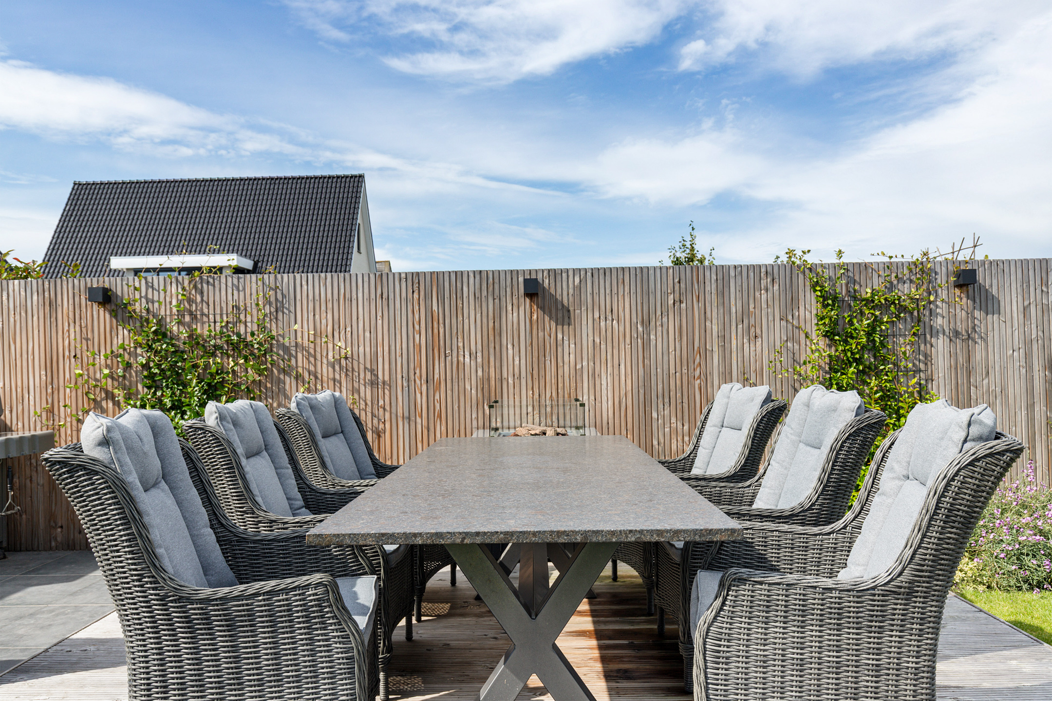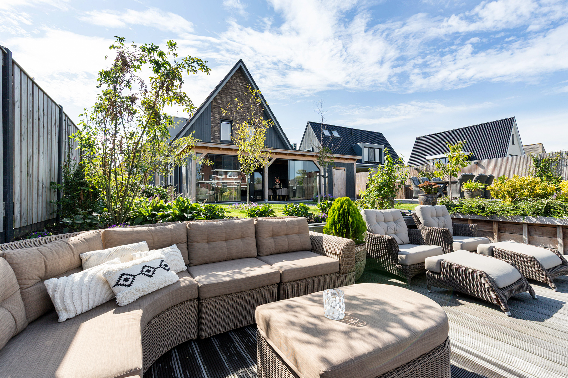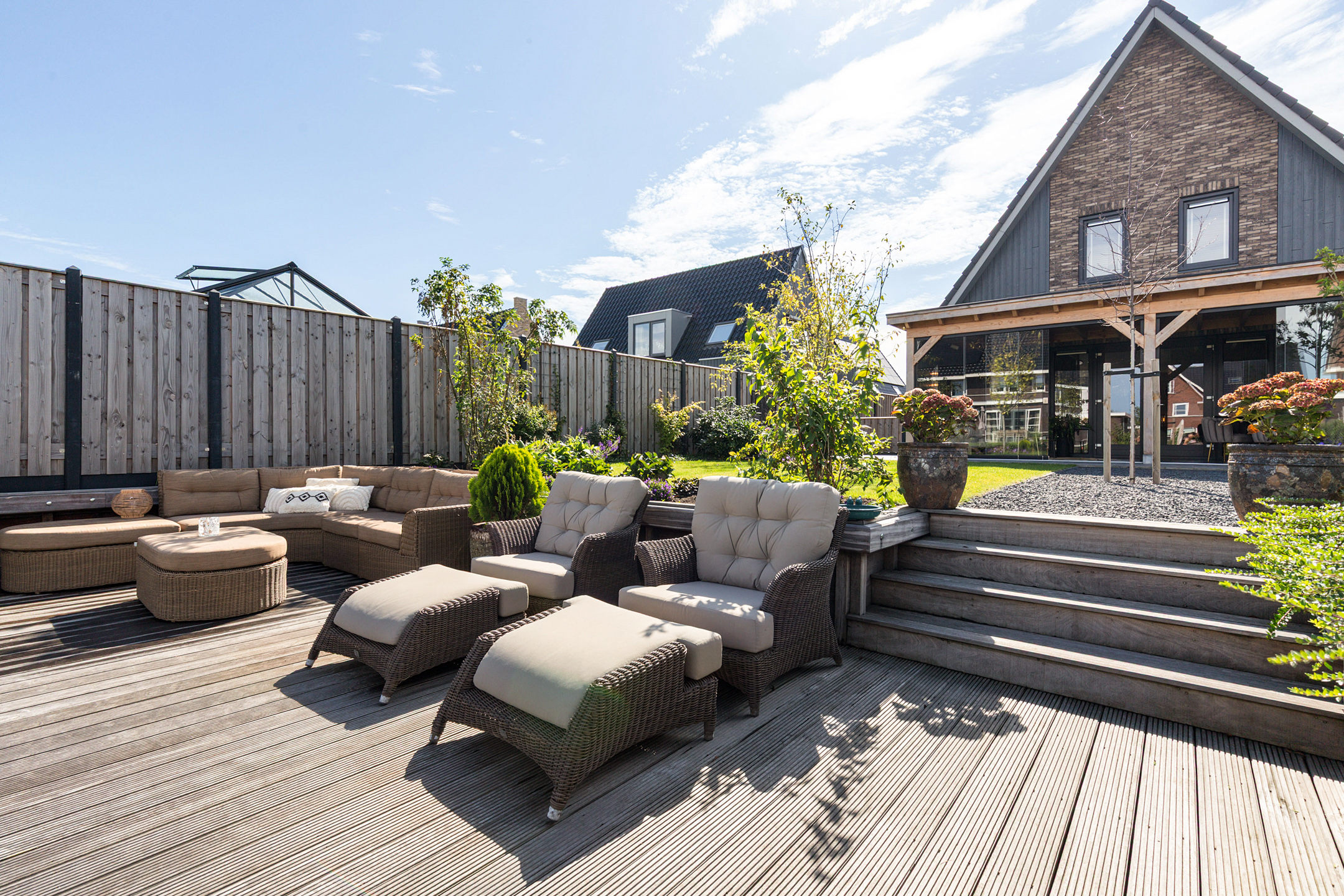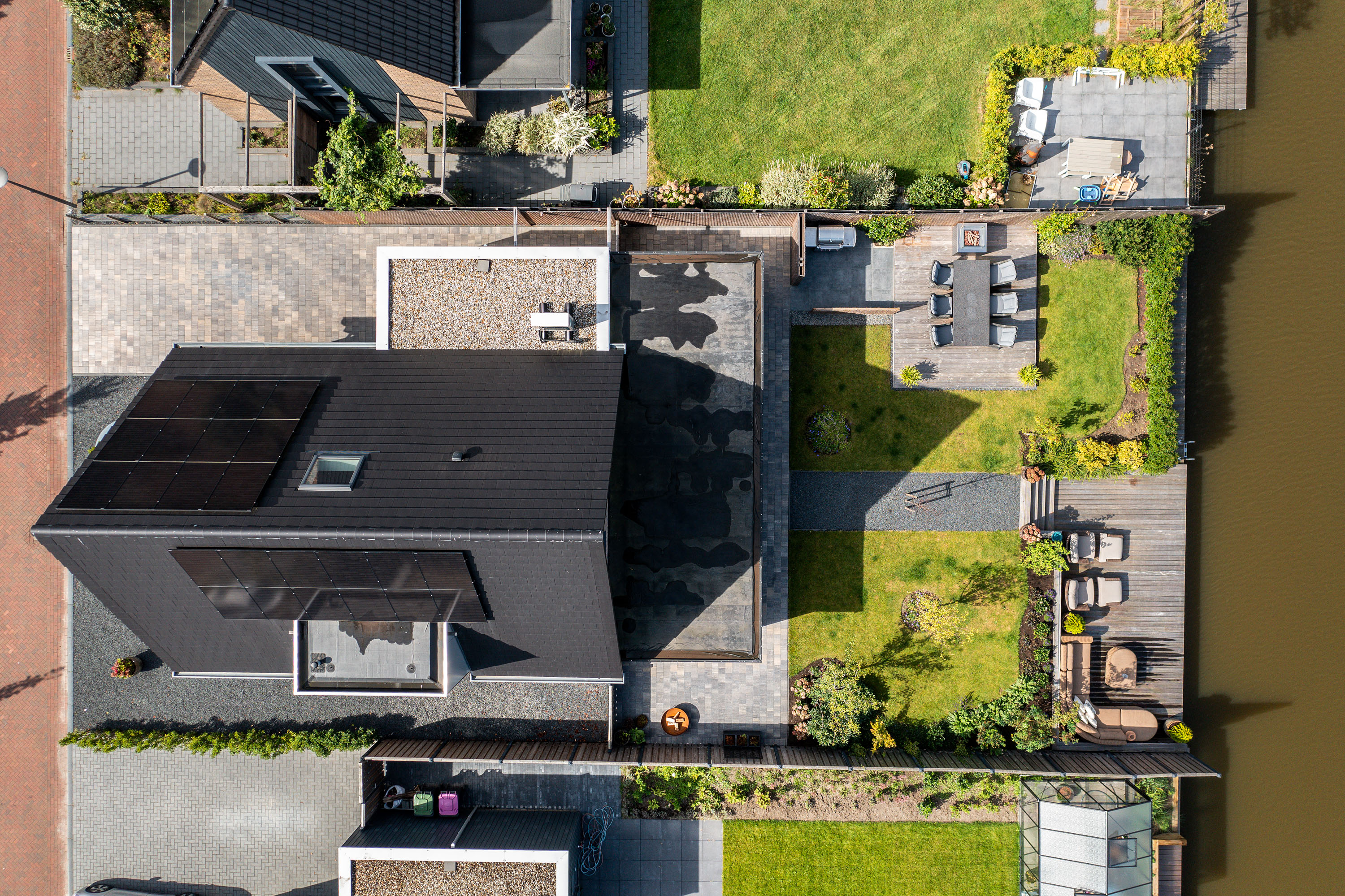 The 15-metre hardwood jetty, set slightly lower for easy access, is a true highlight – ideal for mooring your boat, enjoying water sports, or creating a private waterfront lounge. Thanks to the lush greenery, the garden guarantees both seclusion and a perfect balance of sun and shade.