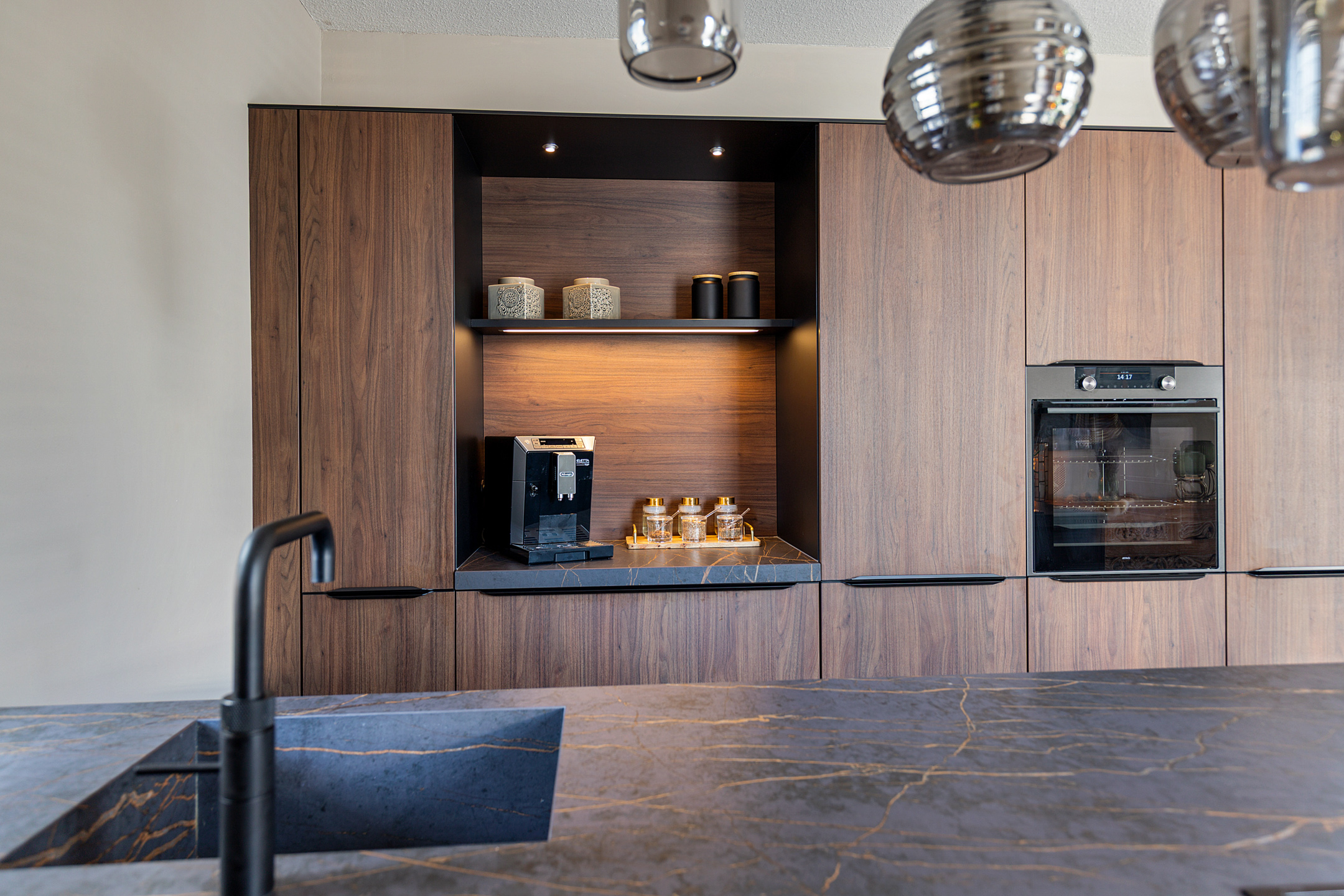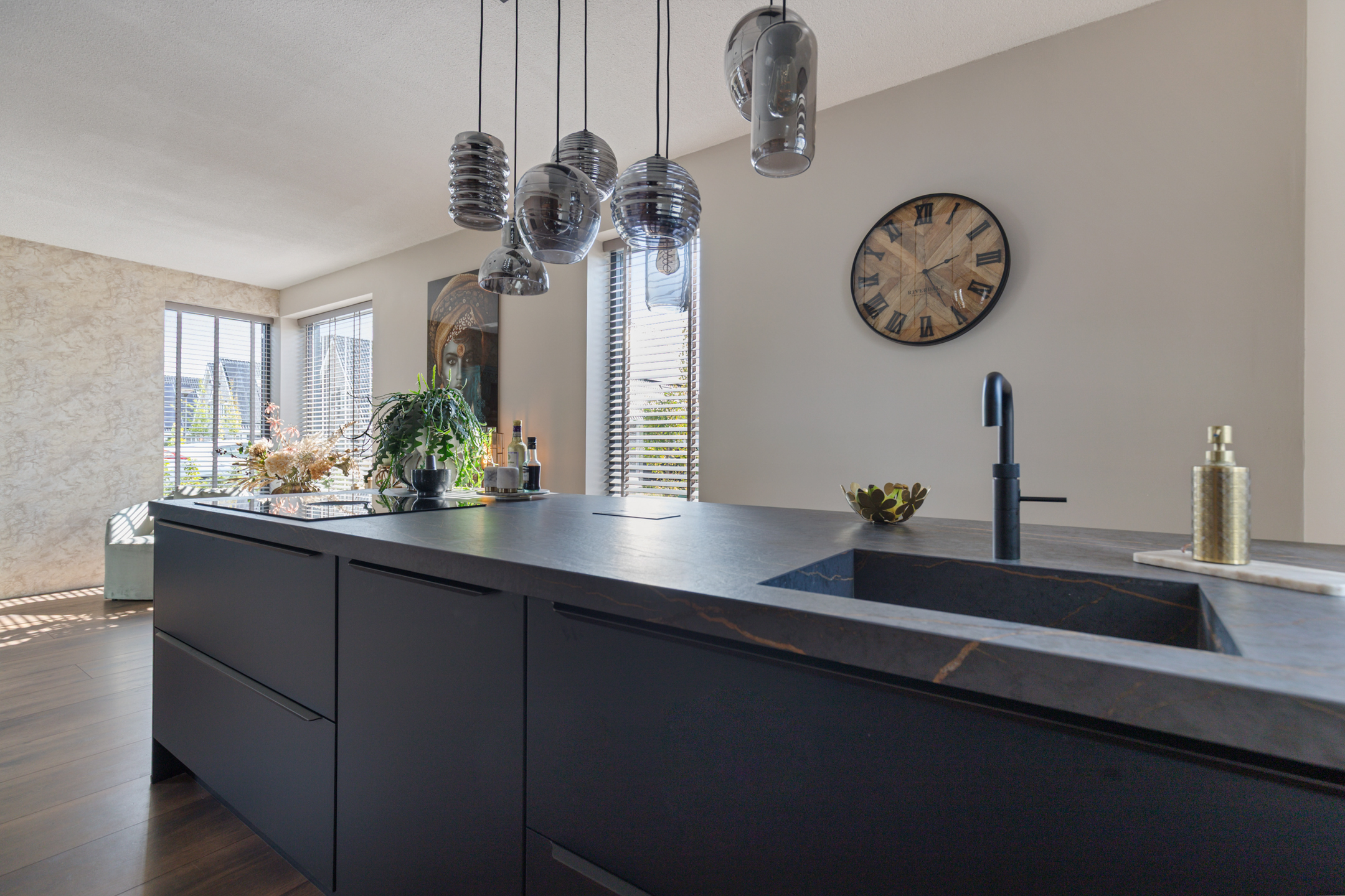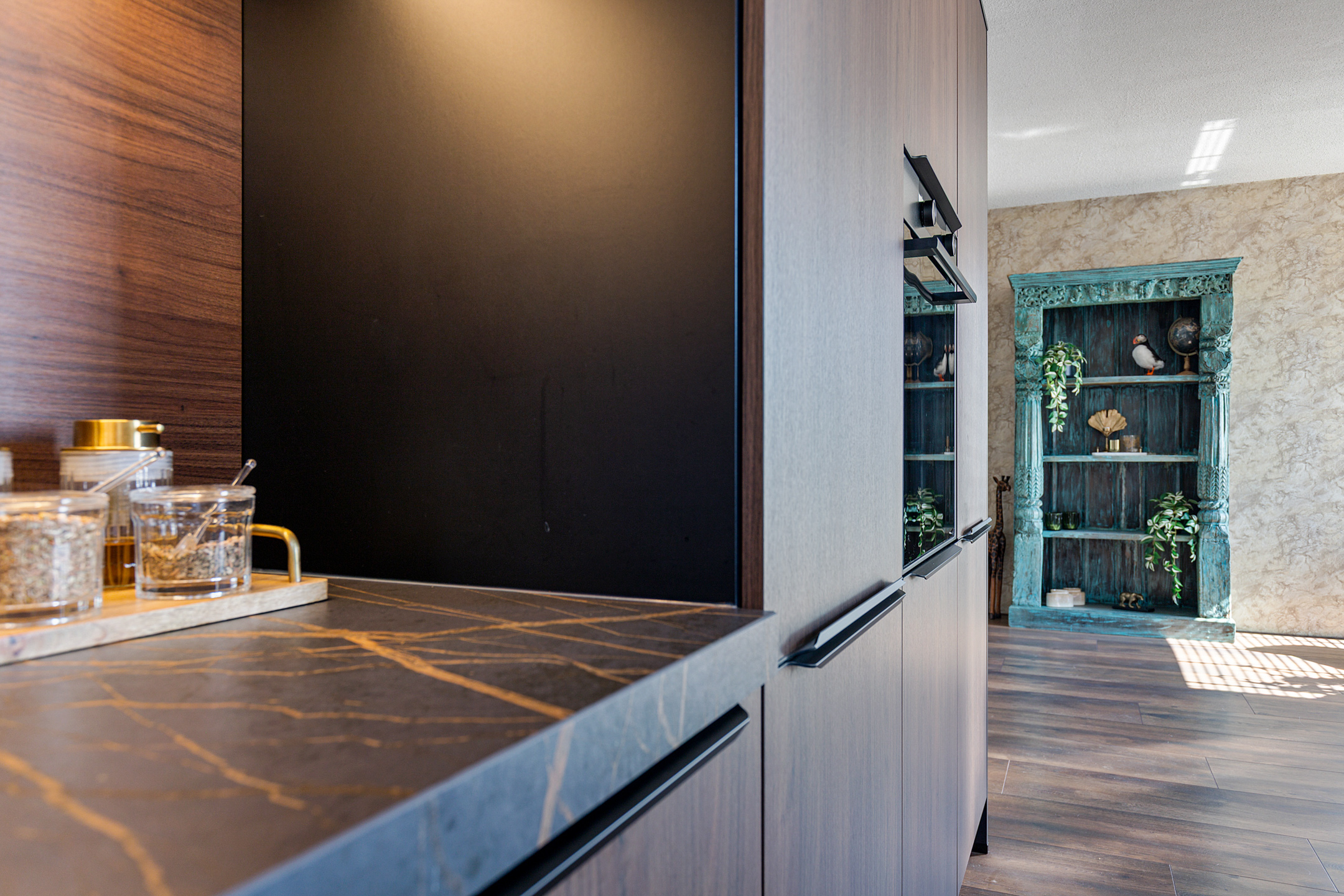 The living room, positioned towards the sheltered garden, creates a warm and intimate atmosphere and blends harmoniously with the light-filled kitchen-diner, forming an open-plan yet versatile living concept. The bespoke kitchen, situated at the front, is a true culinary statement, fitted with robust ceramic countertops, coffee station, dishwasher, combi oven, large Bora induction hob with integrated extractor, Quooker, and built-in fridge-freezer. The adjoining sitting area is designed for elegant comfort.