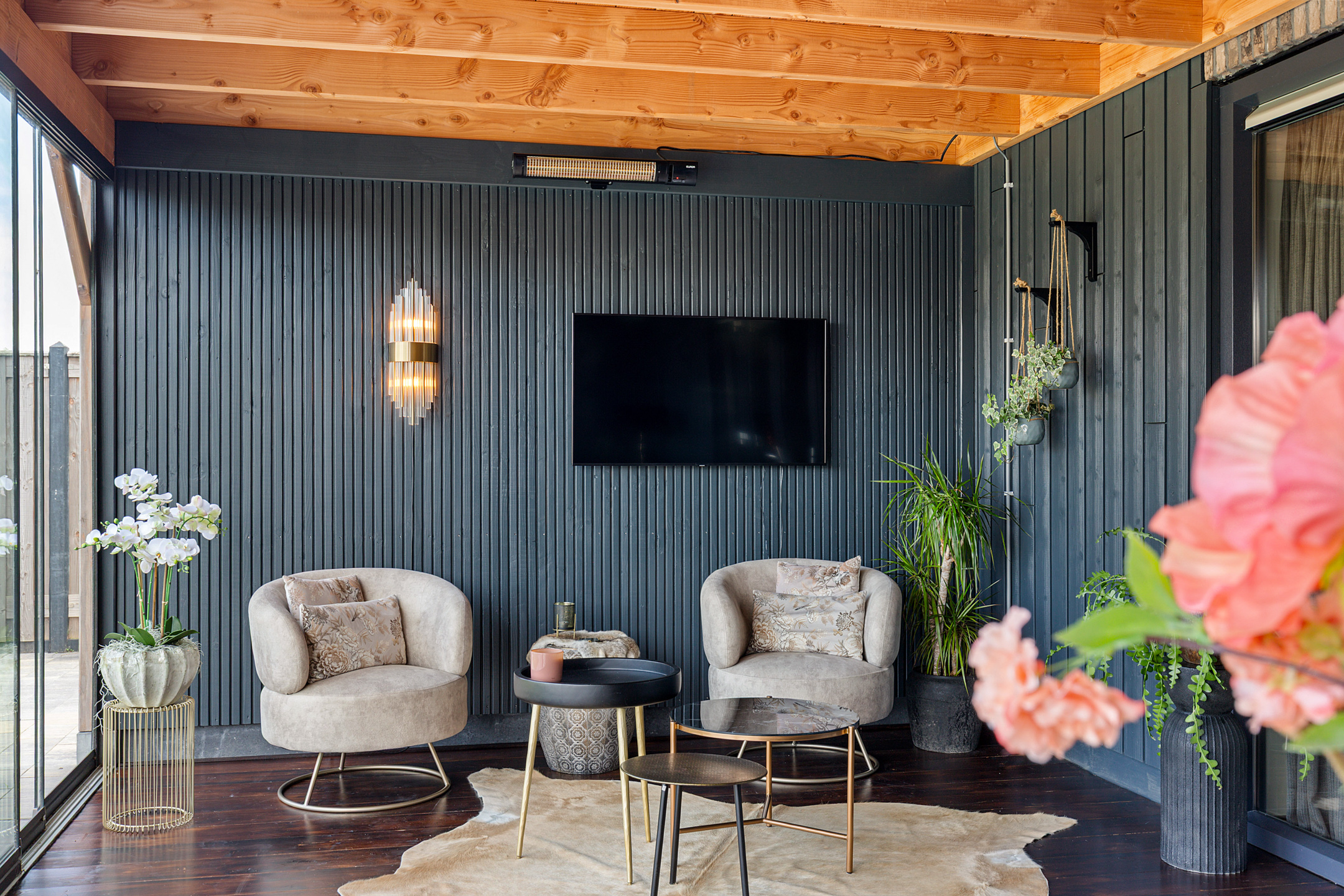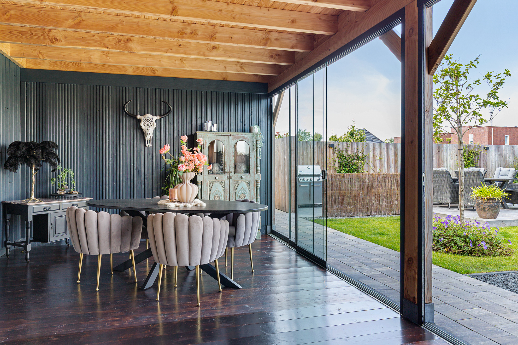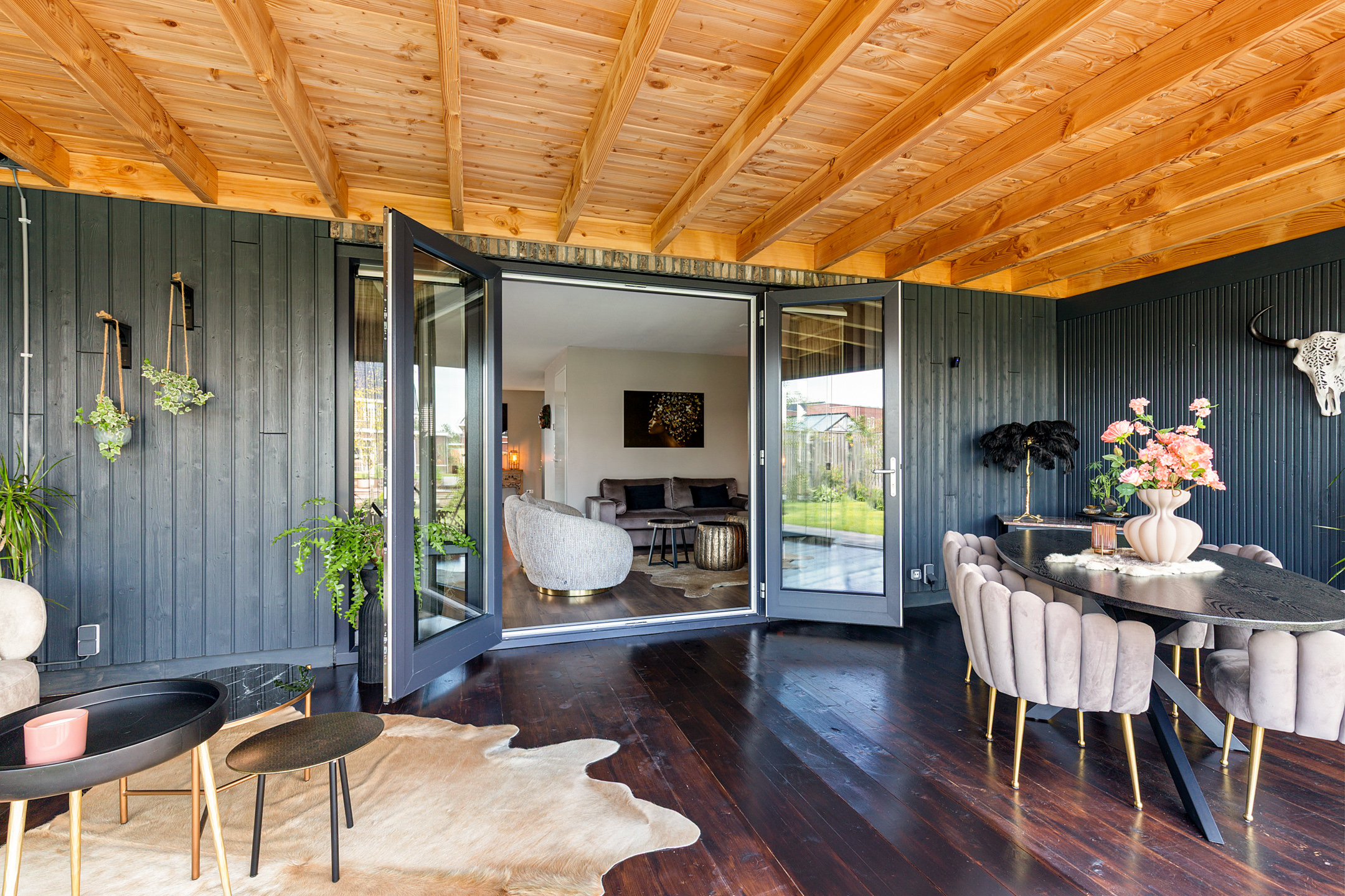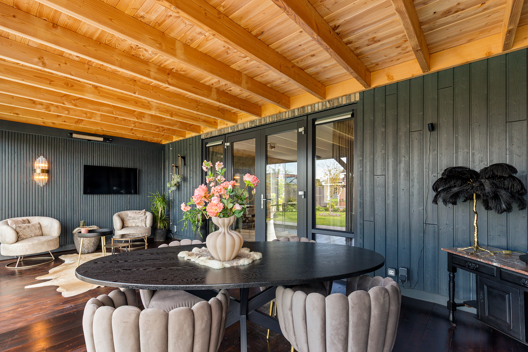 The garden room is an all-season retreat. With a fully opening glass façade, indoors and outdoors merge effortlessly. In summer, it provides the ultimate alfresco experience, while in the cooler months it transforms into a stylish lounge with electric heating.