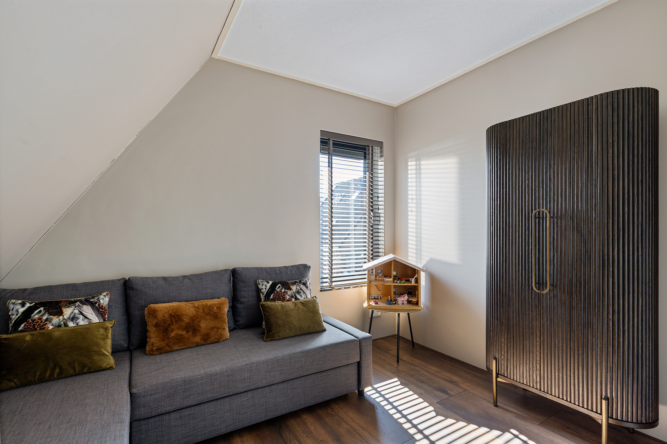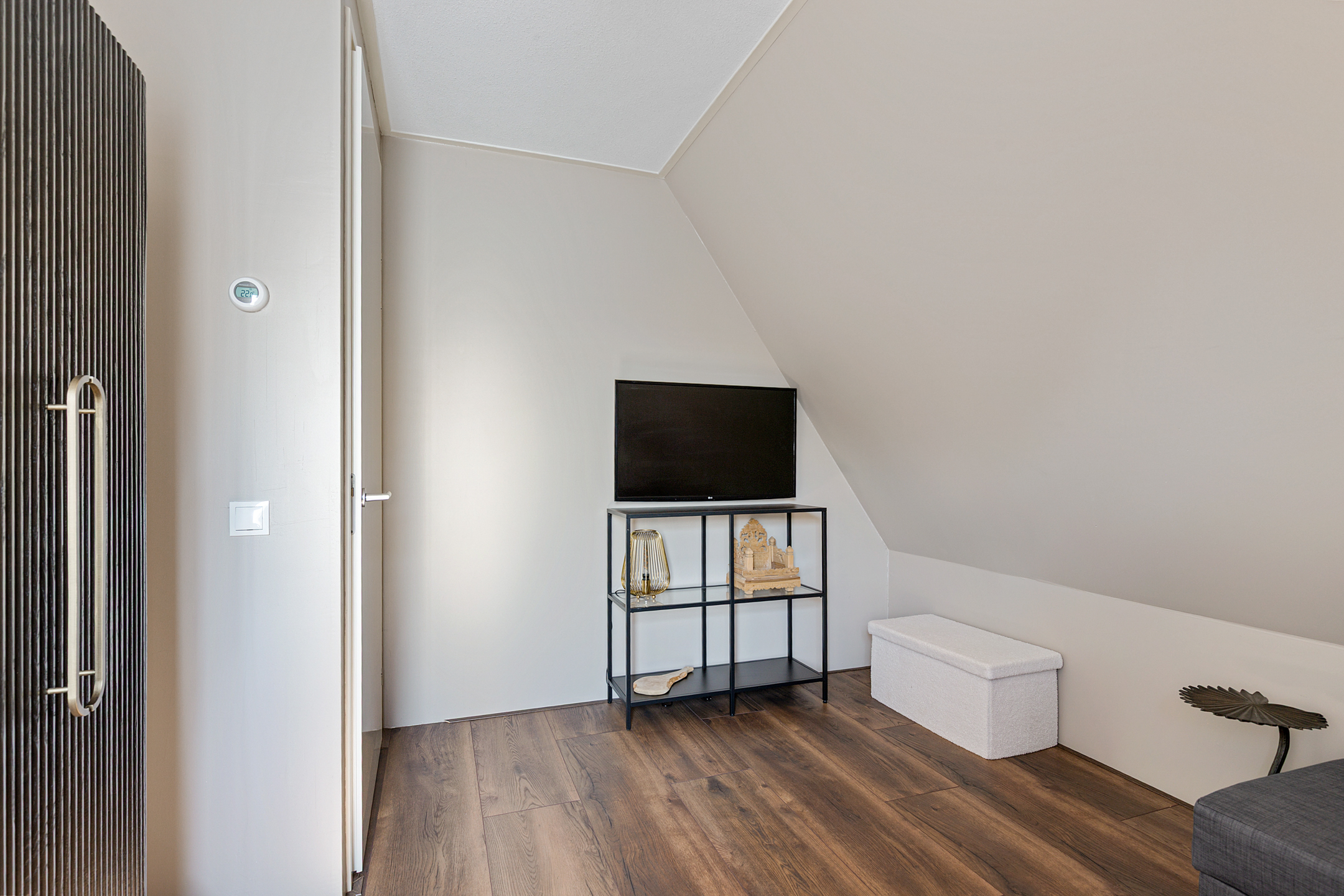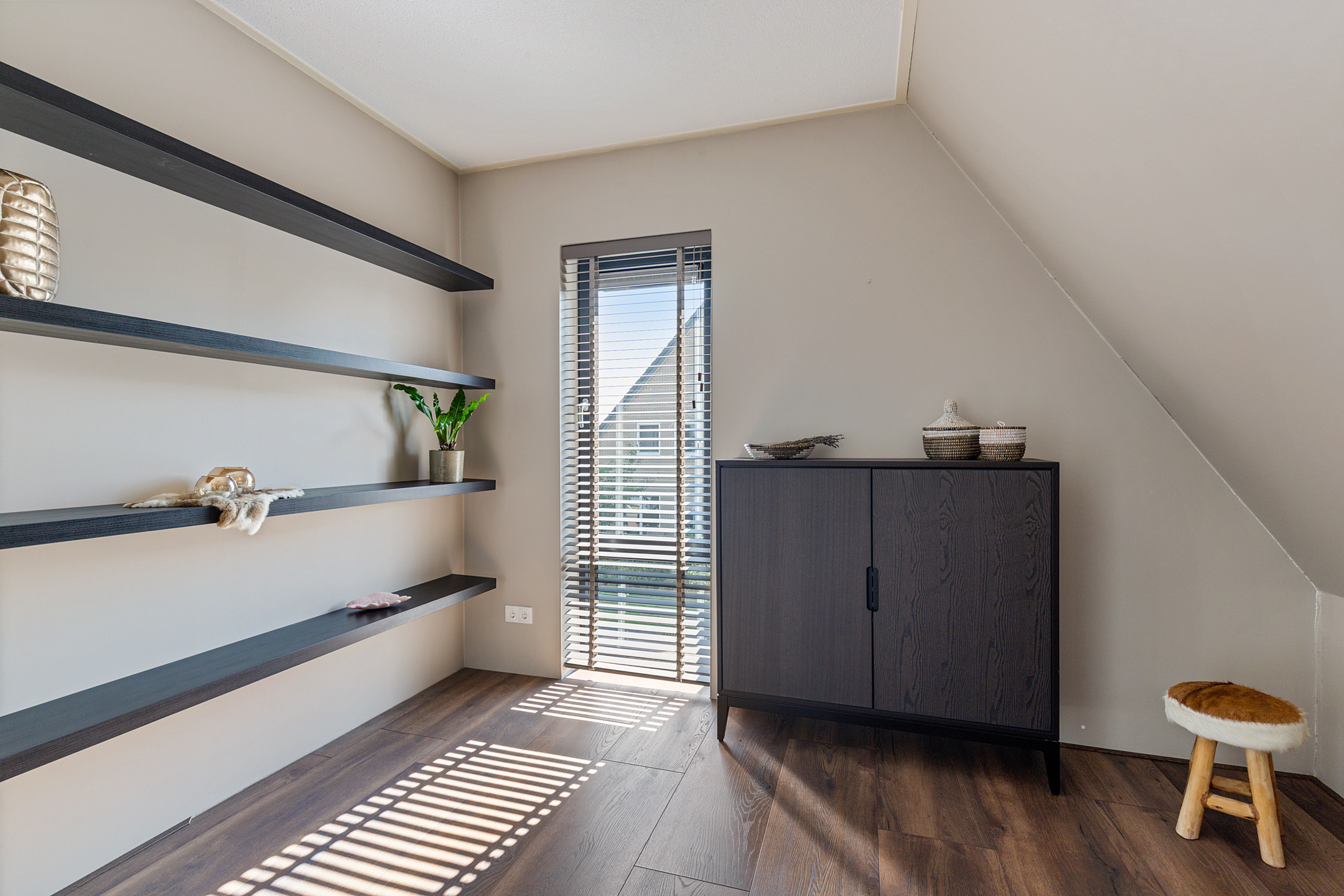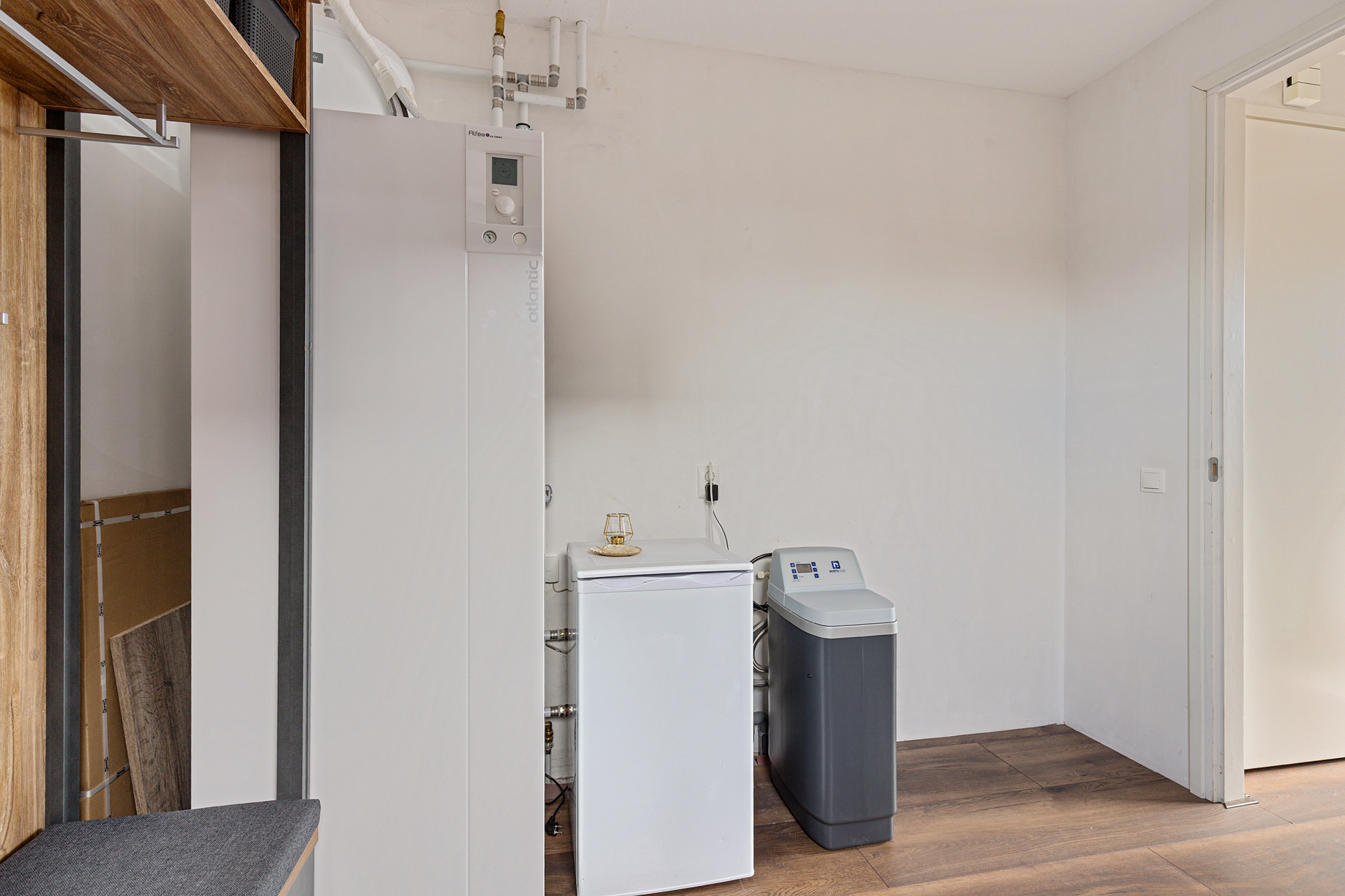 The utility room houses the advanced heat pump system with 190-litre boiler and laundry connections. The whisper-quiet air-source heat pump is discreetly placed outside. Throughout the ground floor, a refined laminate floor with underfloor heating and cooling ensures both style and comfort.
