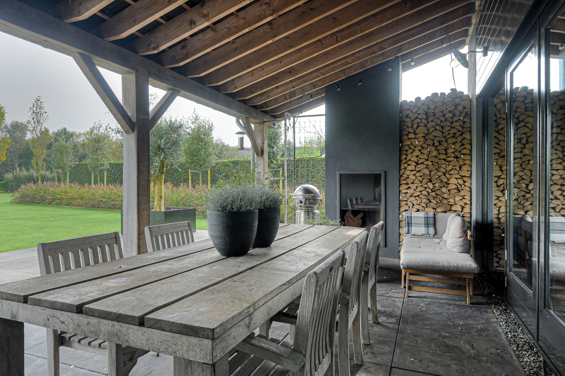 French doors provide access to the veranda. From here too – where an outdoor fireplace is located – you can enjoy stunning views of the garden and surrounding landscape.
