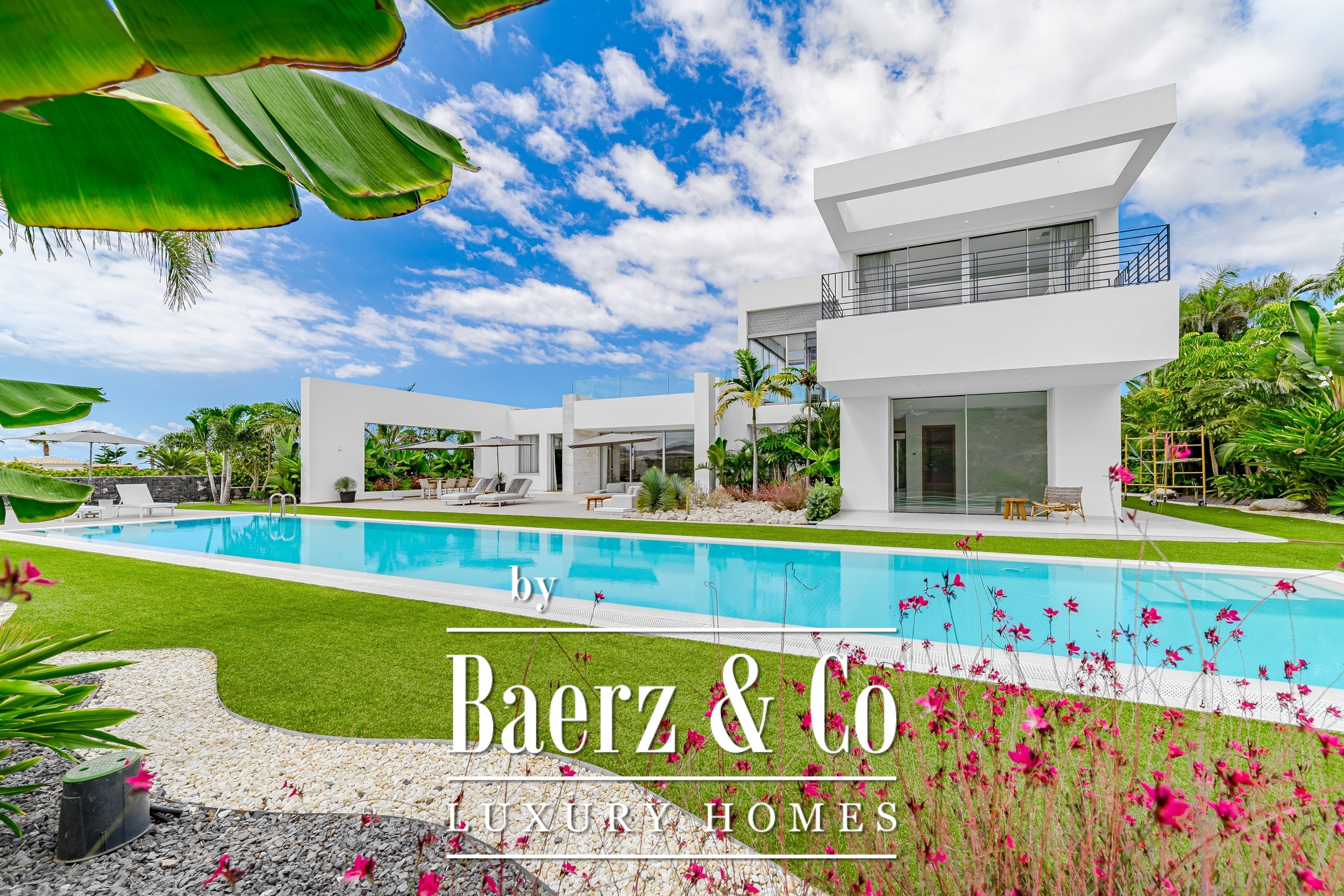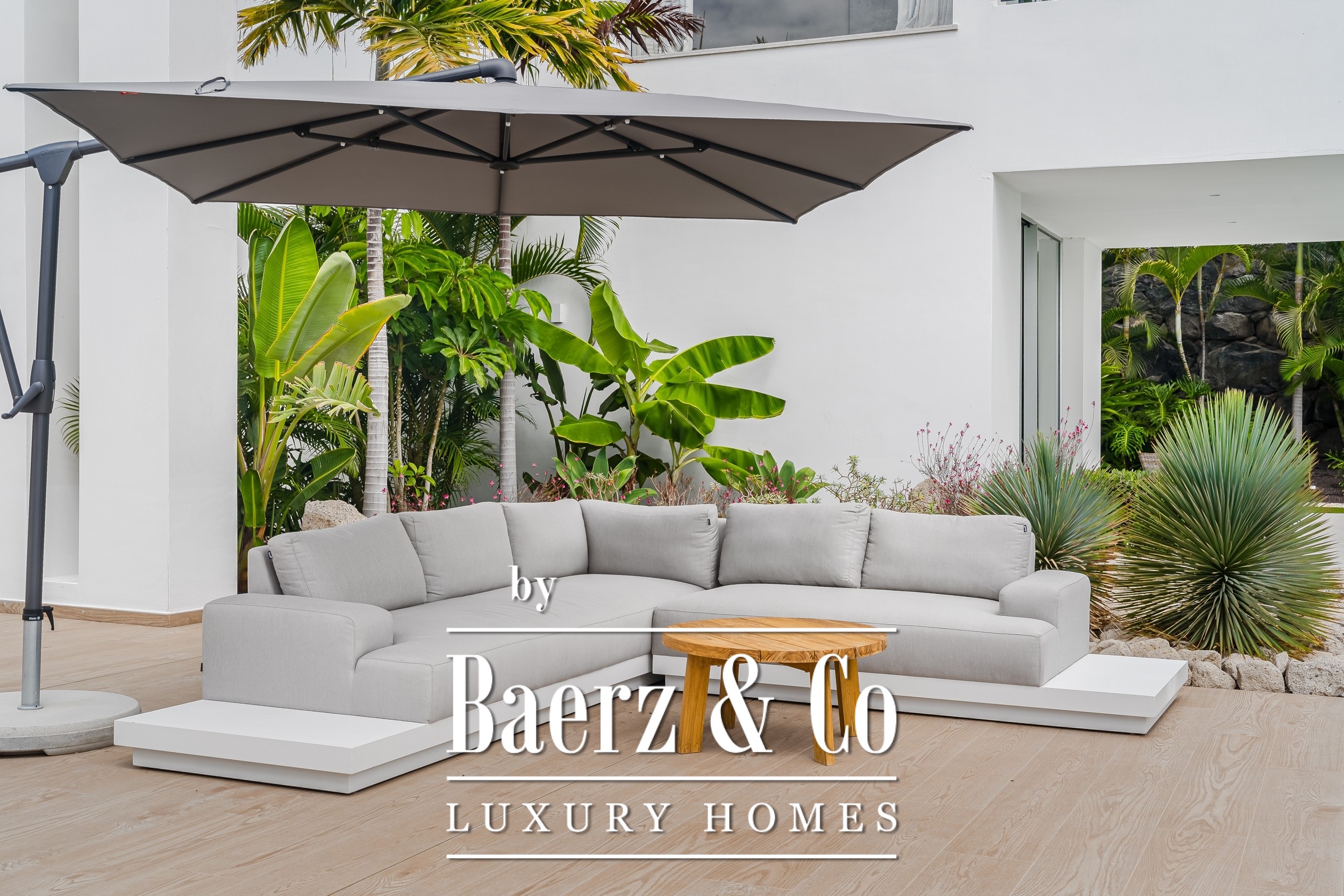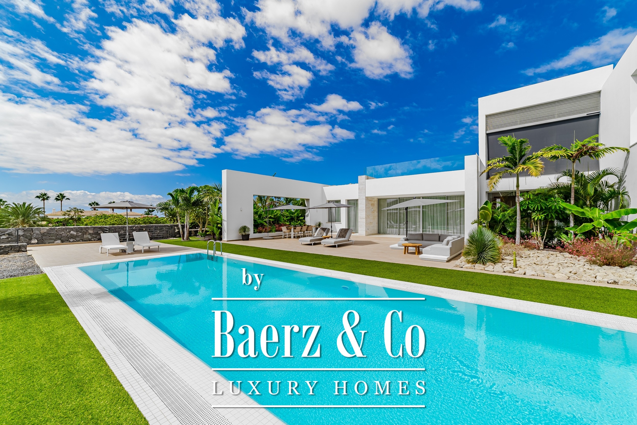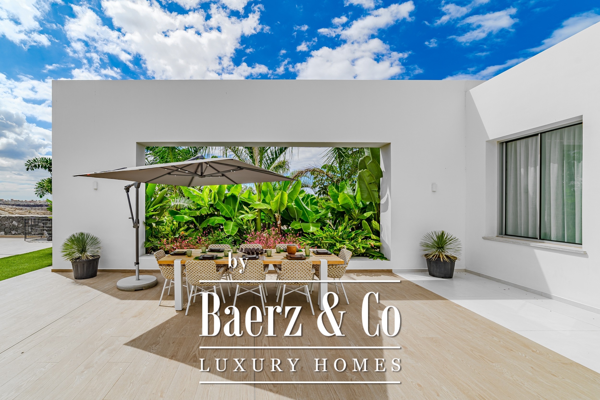 Luxury villa Golf Costa Adeje stands discreetly among the most prestigious addresses in southern Tenerife, where elevated design meets calm seclusion. Set within a 2,500 m² plot and embraced by a 1,500 m² tropical garden, this property reflects sophisticated island living. The villa encompasses approximately 350 m² of thoughtfully arranged spaces, complemented by a 200 m² basement that invites customization, whether for a private cinema, wellness studio, or gym.