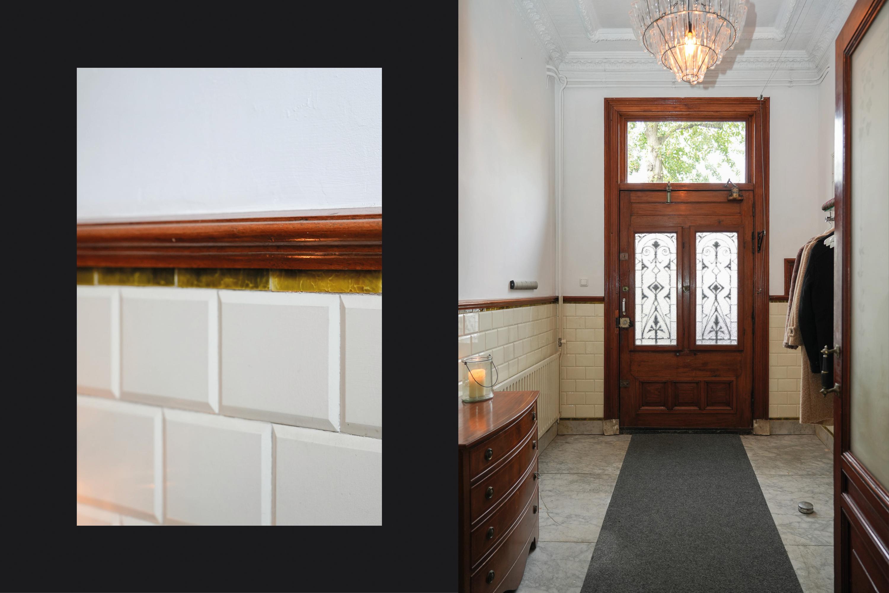Behind the elegant façade, the original panelled front door opens into a vestibule of rare grandeur — with its high ornamental ceiling, finely detailed woodwork, and beautifully preserved etched glass. The marble floor and original wall tiles remain intact.