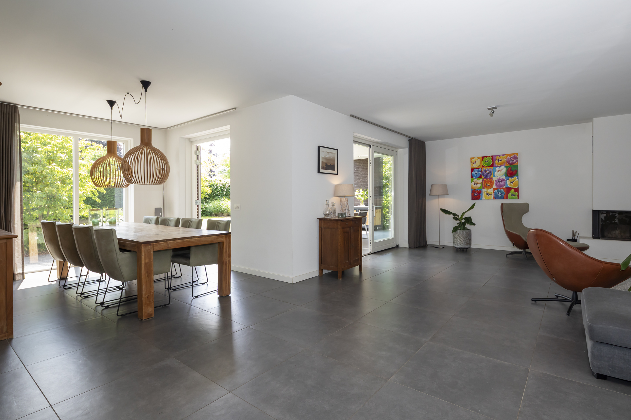 The dining area is also beautifully spacious. While seated at the table, you can enjoy the view of the beautiful garden. Double patio doors in the dining room open onto the generously sized covered terrace.