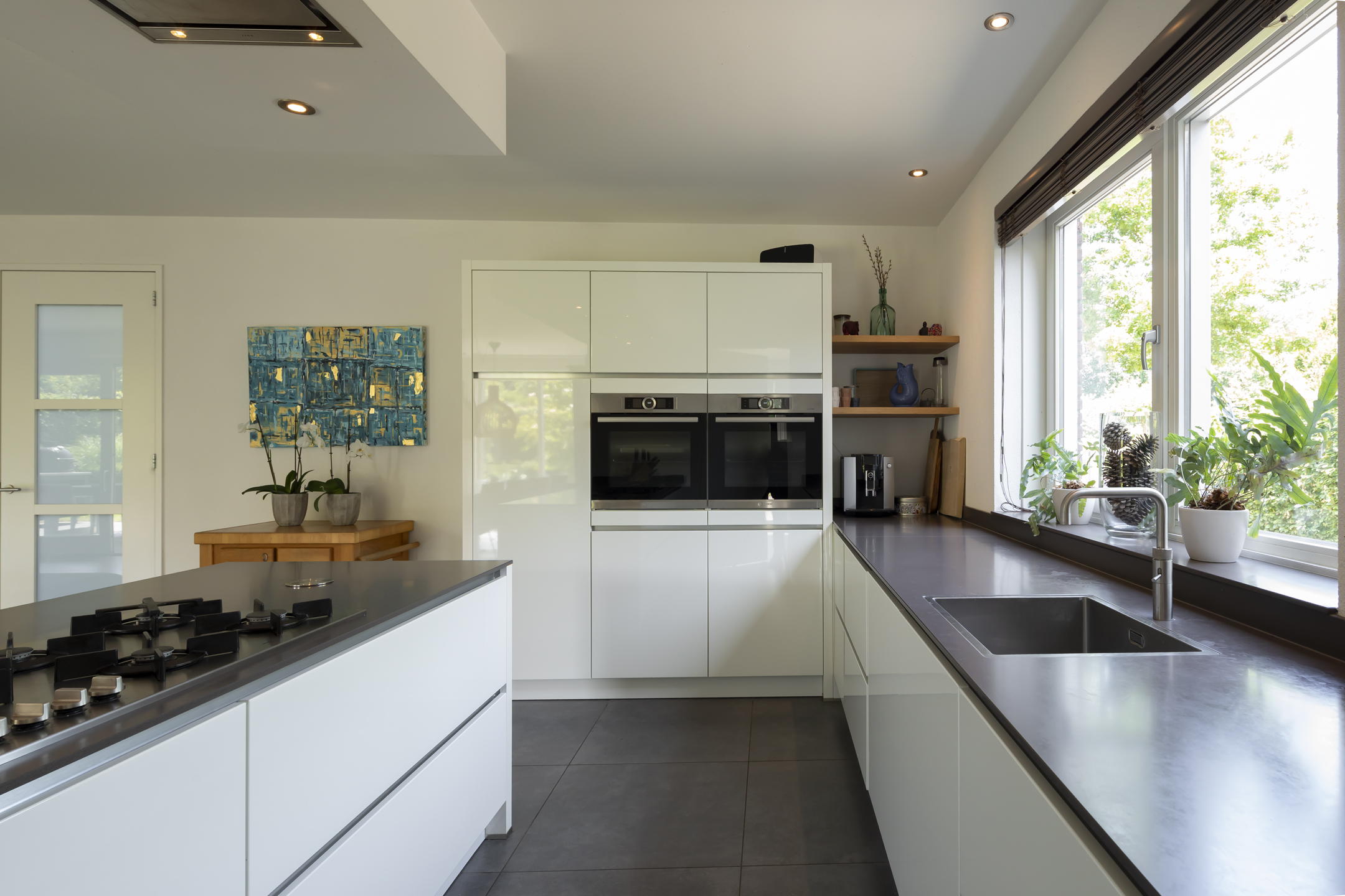 Cooking enthusiasts will be in their element here! This luxurious kitchen is equipped with a convenient Quooker, a steam oven and a convection oven, a refrigerator, and a dishwasher. The island has a 4-burner gas cooktop and a wok burner, and the extractor hood is integrated into the ceiling. The kitchen features a beautiful composite countertop and offers ample work and storage space thanks to the wide drawers and cabinets. It is handleless and finished in high-gloss white, which contrasts beautifully with the floor. While you're cooking, you can still enjoy the company of others at the table and not miss a thing.