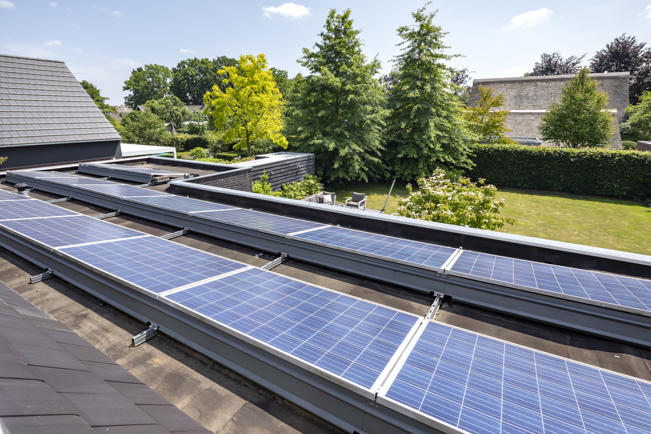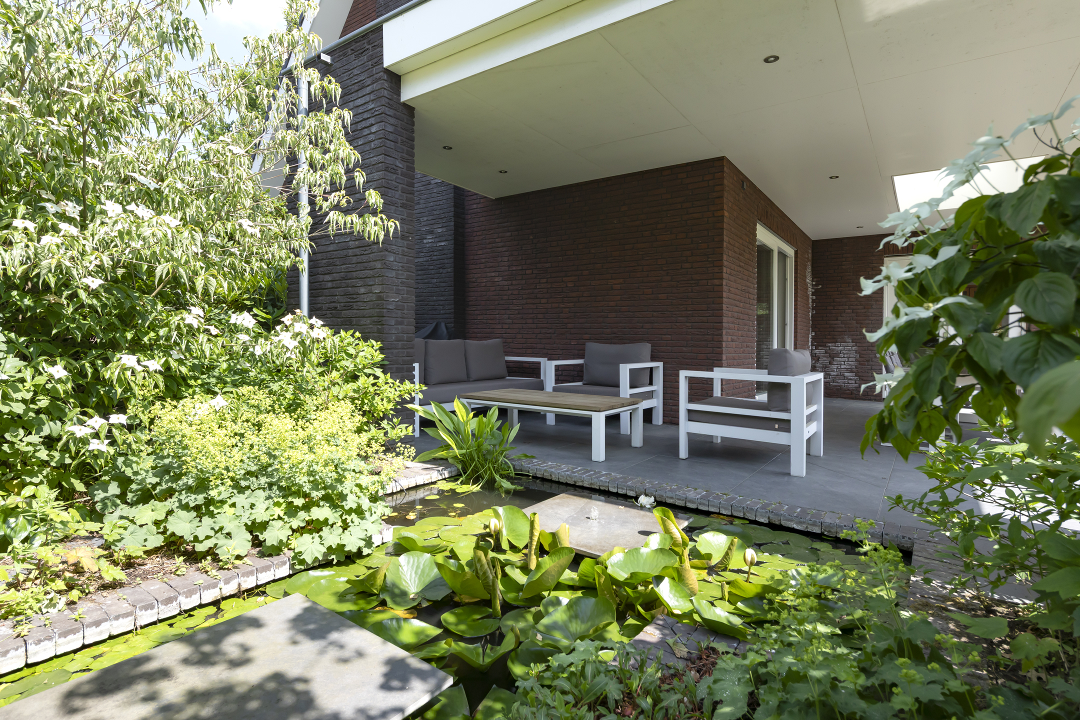 The garden is fantastic, offering wonderful privacy. The beautiful garden is bordered by green hedges, ensuring minimal views. A lovely lawn with a spacious sun terrace provides ample space for playing. In addition to the sun terrace, there is also a beautiful, spacious covered terrace adjacent to the rear of the house. The covered area has a large skylight, ensuring optimal daylight penetration into the living room. And then there's the unique sauna in the garden, where you can relax after a hard day's work. The front garden is also neatly landscaped and has a spacious driveway with space for 4 to 6 cars.