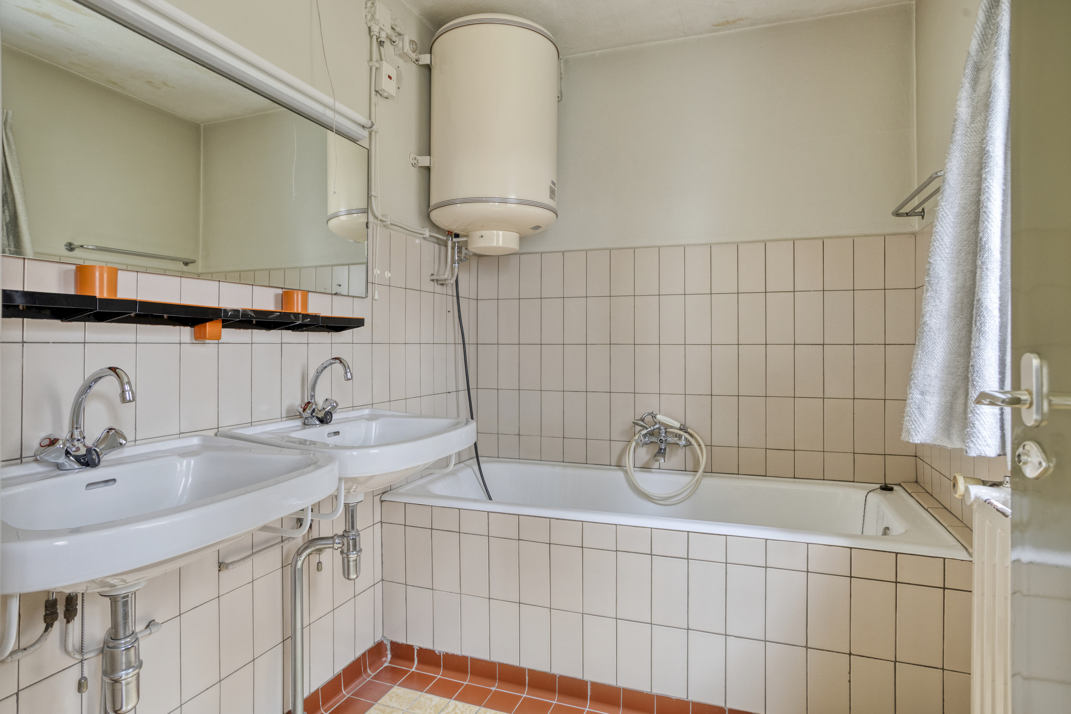 En-suite fully tiled bathroom with bathtub, double washbasin and boiler;
