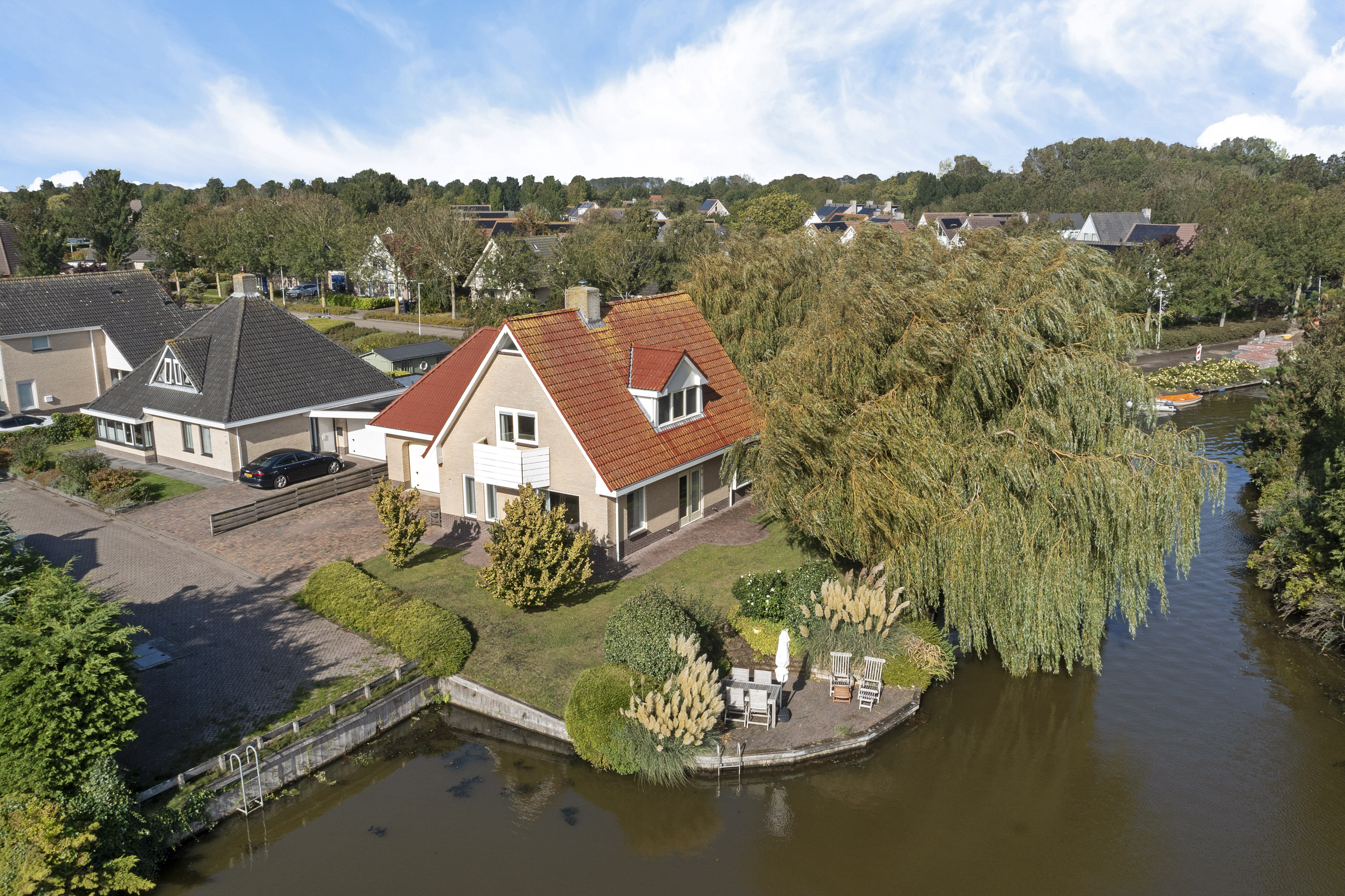 The beautifully landscaped garden with mature trees, shrubs, borders, and terraces ensures privacy and offers both sunny and shaded spots throughout the day. A sunken south-east facing terrace directly on the water, complete with a private swimming ladder, is the perfect place to enjoy your morning coffee or relax all day while watching boats pass by. The waterway is a branch of the famous *Bolswardervaart*, part of the historic Eleven Cities Route, and is accessible by boat.