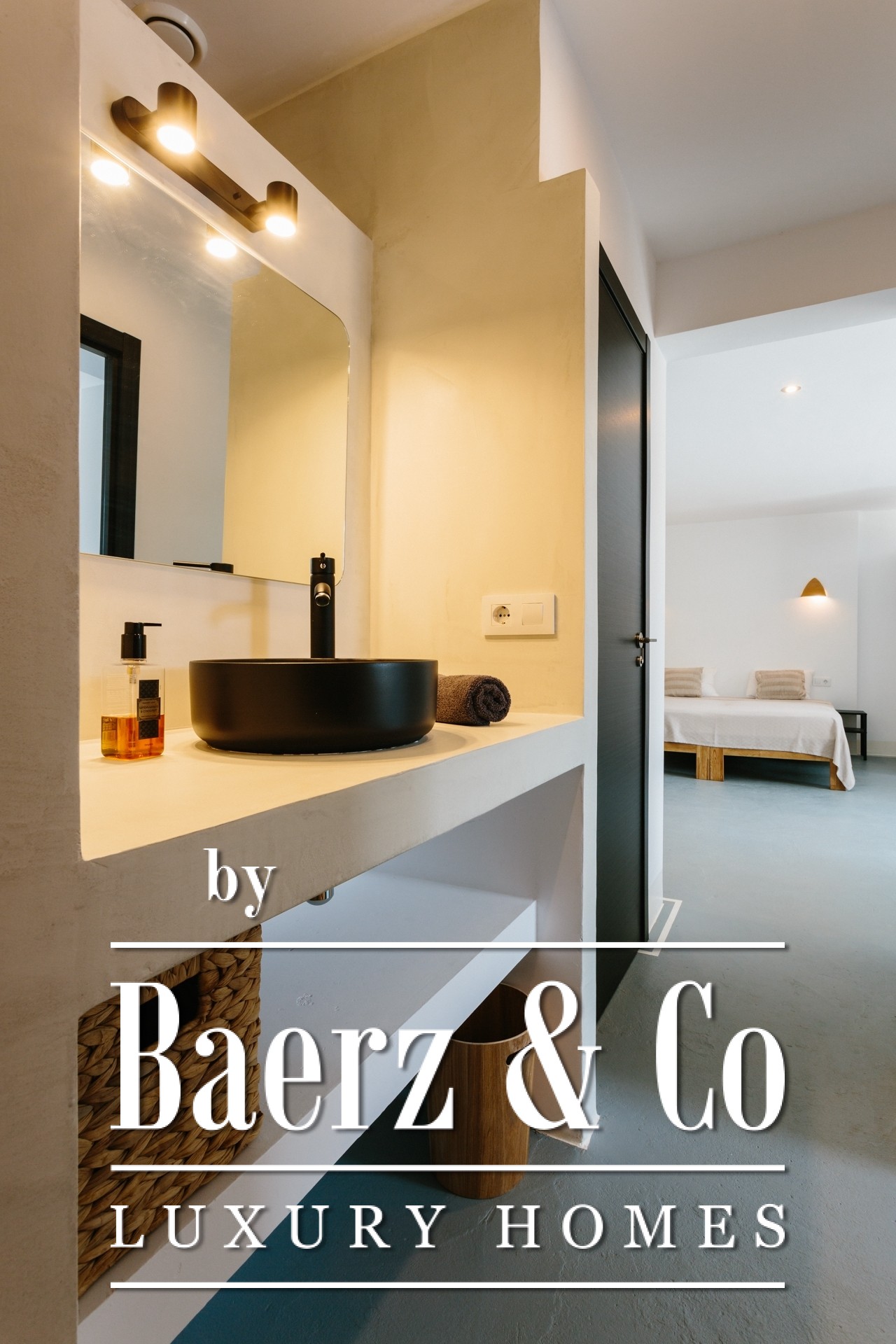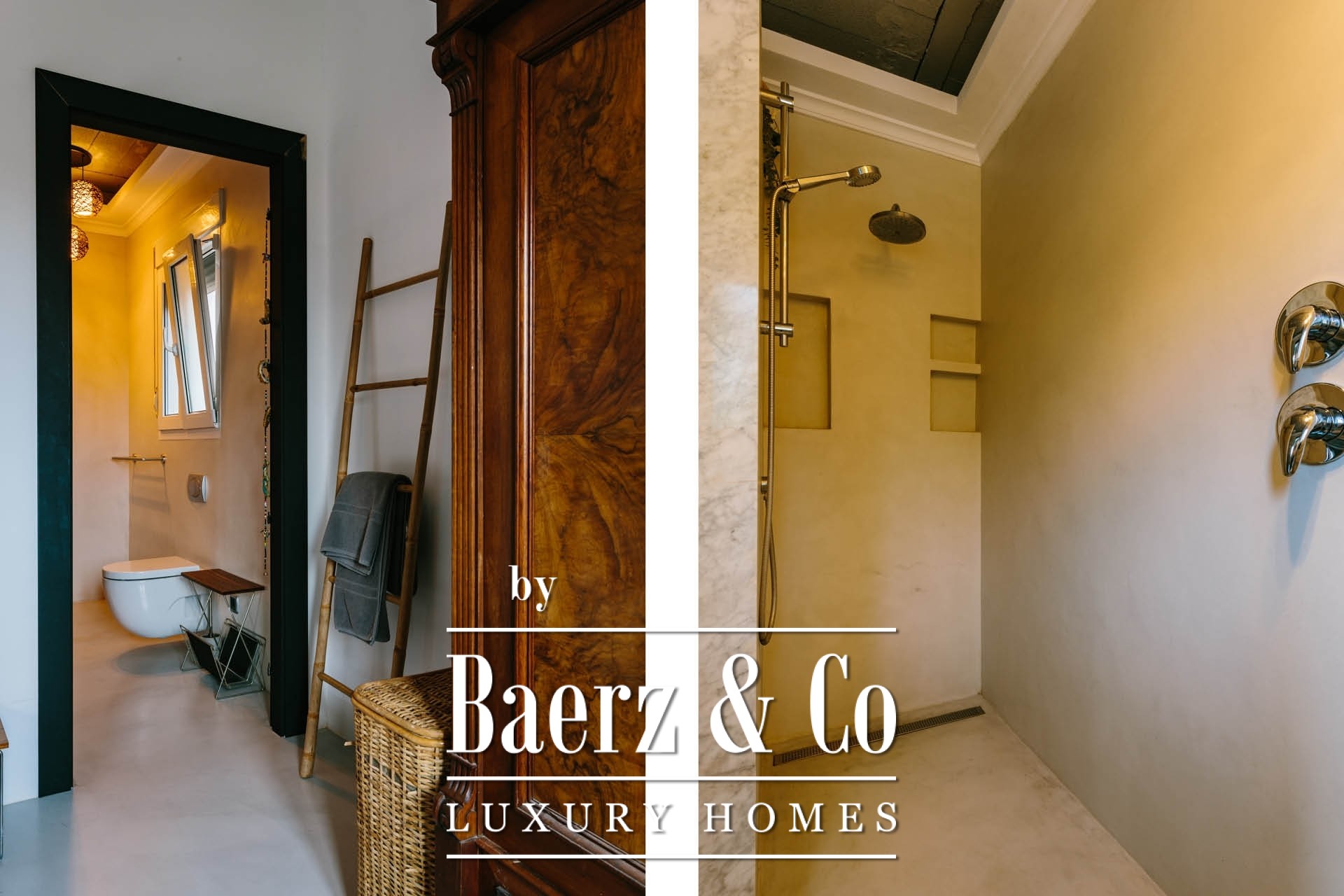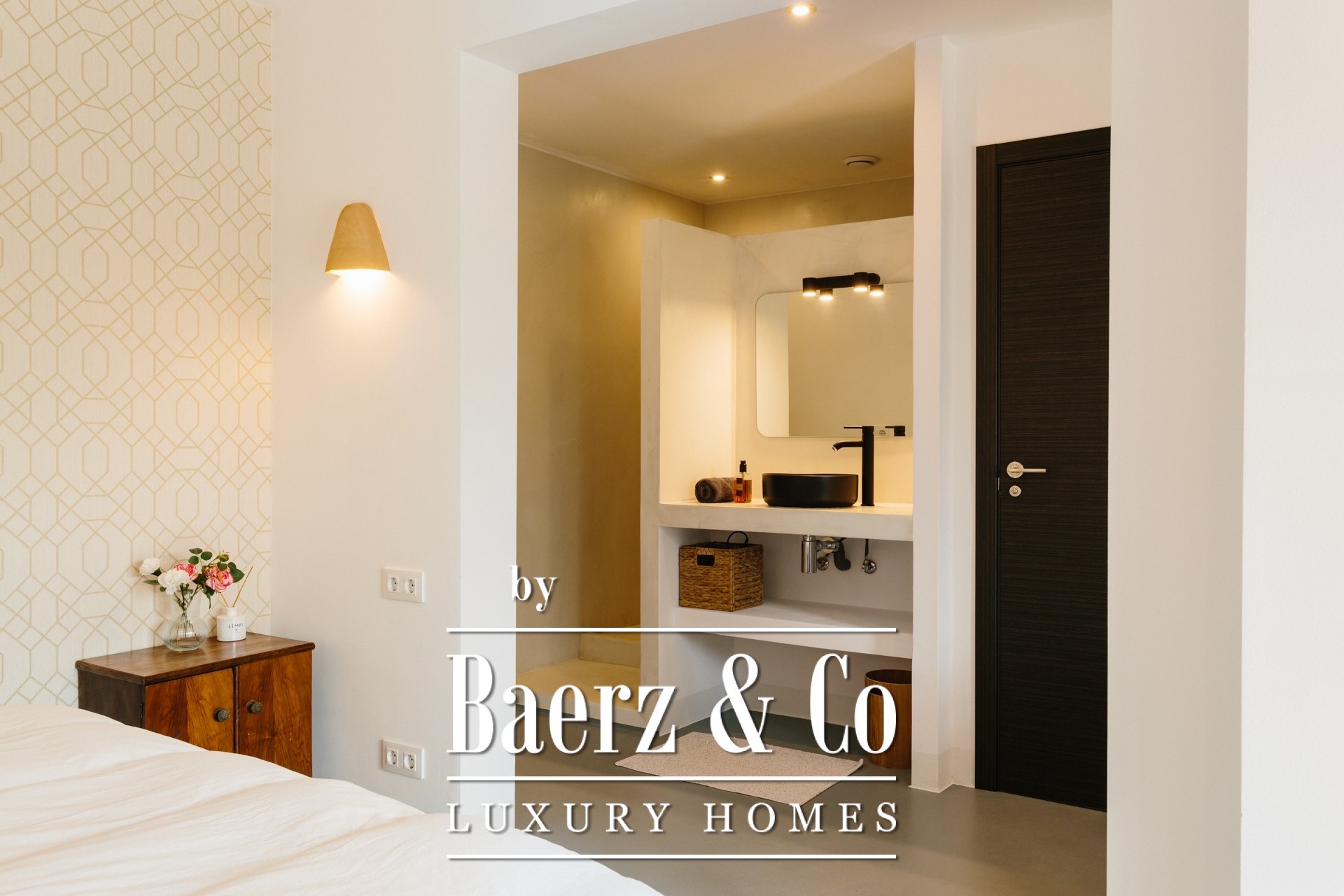 A staircase leads to the lower level of the property, where the 4 independent studio apartments are located — each designed to a high standard. All offer a private kitchenette, an en-suite bathroom and access to individual terraces that connect seamlessly to the landscaped garden.