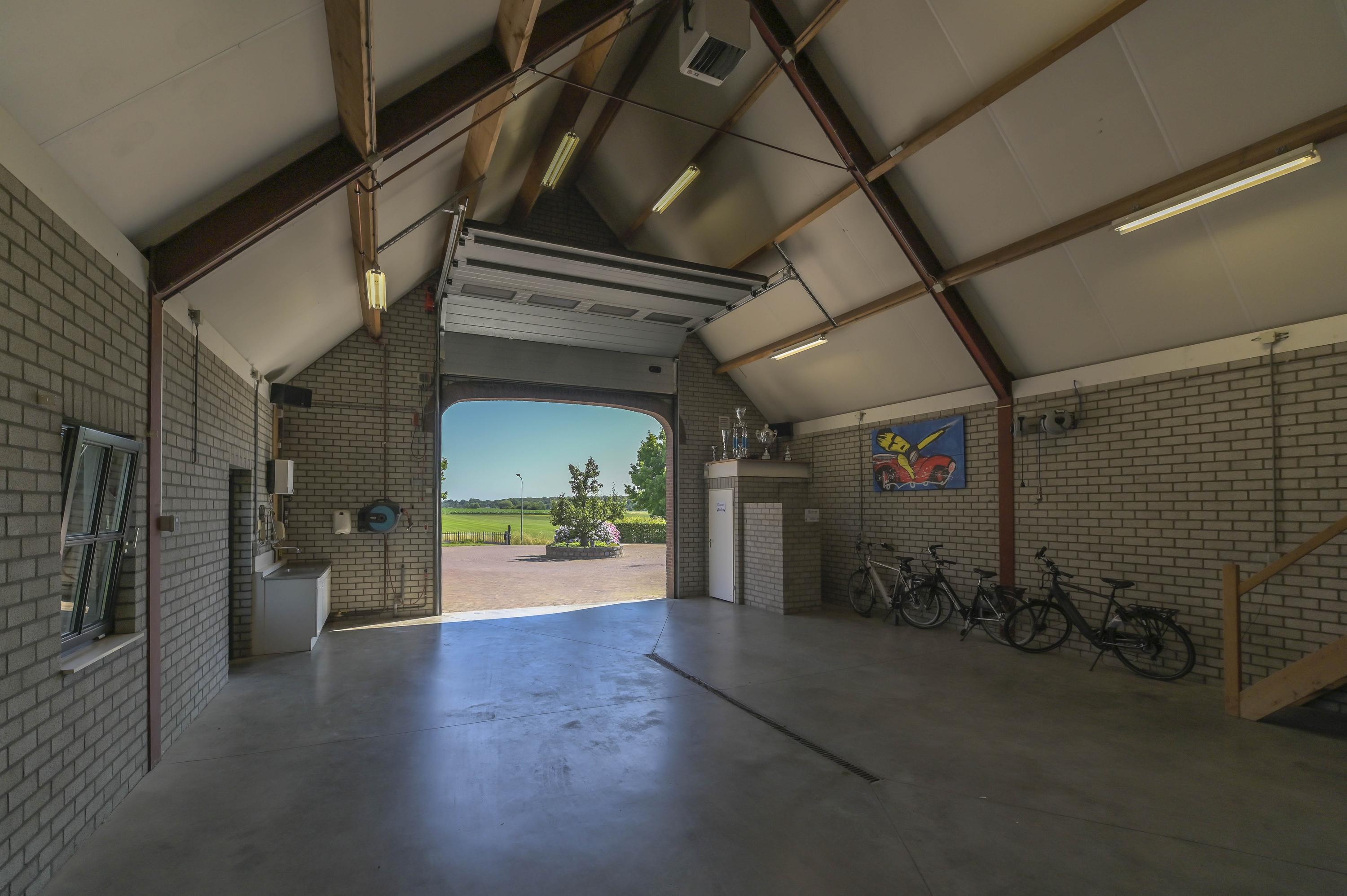 The exceptionally spacious garage provides room for multiple cars and is fully insulated. It features a separate boiler, electric sectional door, pedestrian door, toilet, and mezzanine with window. The high ceiling offers multiple possibilities. At the rear, part of the garage has been converted into a private bar with wooden flooring and air conditioning. French doors open directly to the garden.