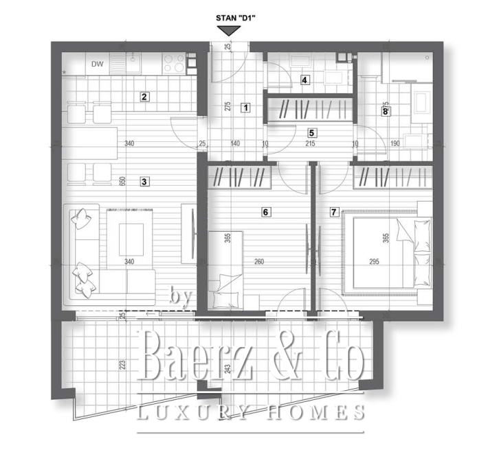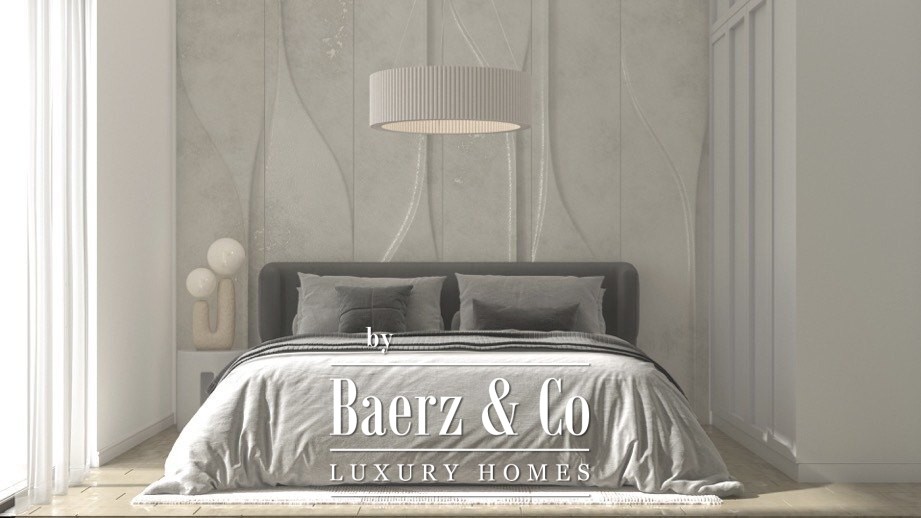 The building has 3 floors, while the apartment is on the 2nd floor. This apartment complex has 2 salt water pools. There is a berth for a boat taht is 70m2 away from the building. Each apartment has its own parking spot, and also, there is a n option of buying a garage spot for 20 000e. There are 5 buildings that have 3 floors in this apartment complex and each one has 5 apartments. This building will be finished in December 2026.