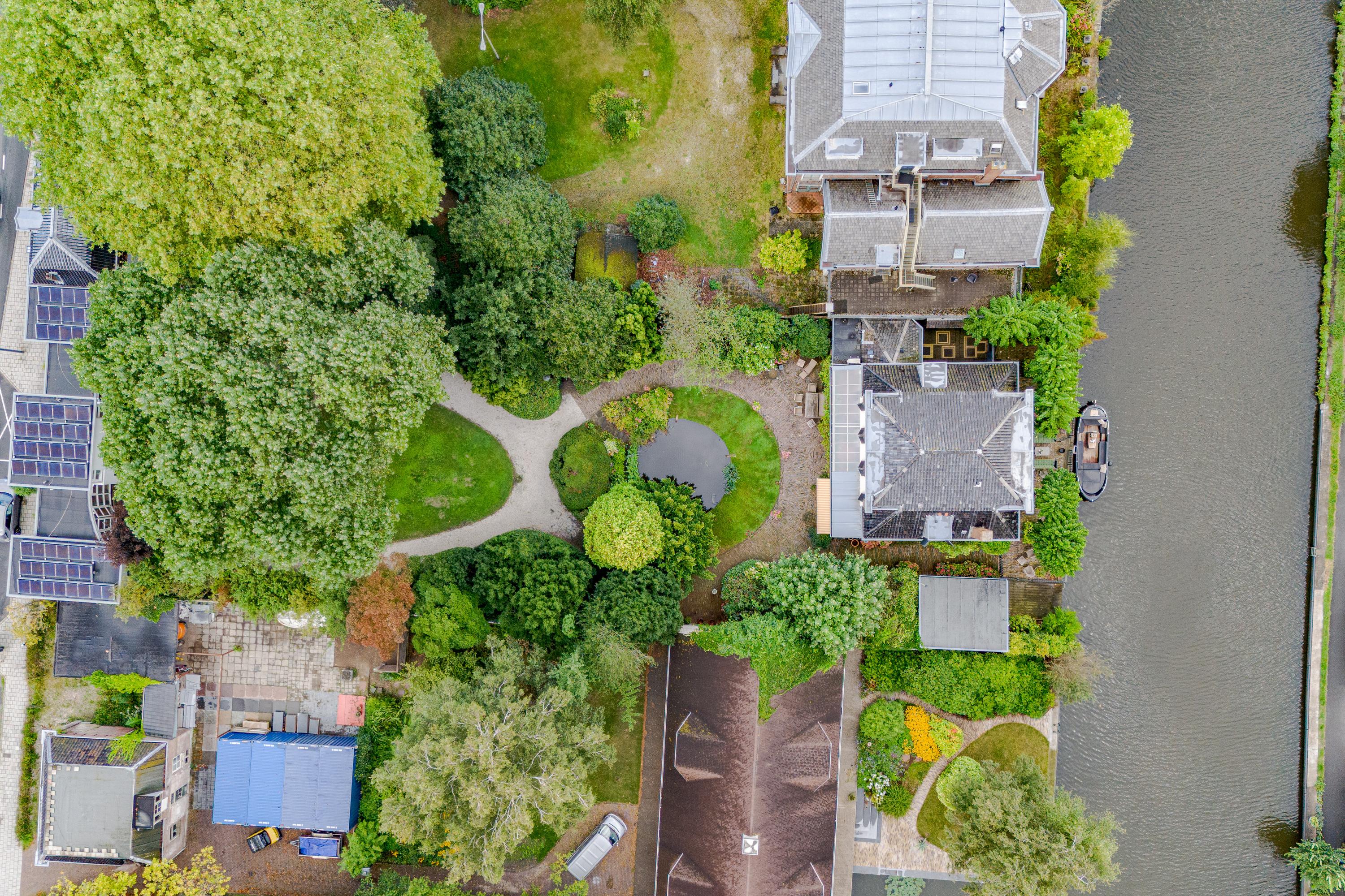 Upstairs, four serene bedrooms offer leafy, water-facing perspectives; the master suite includes a walk-in wardrobe and a refined bathroom featuring granite floors, underfloor heating, a sunken bath, sauna, and Turkish bath. Three bathrooms in total assure comfort and privacy. The estate’s boathouse allows effortless river access, opening leisure to the waterways of De Kaag and the Groene Hart.