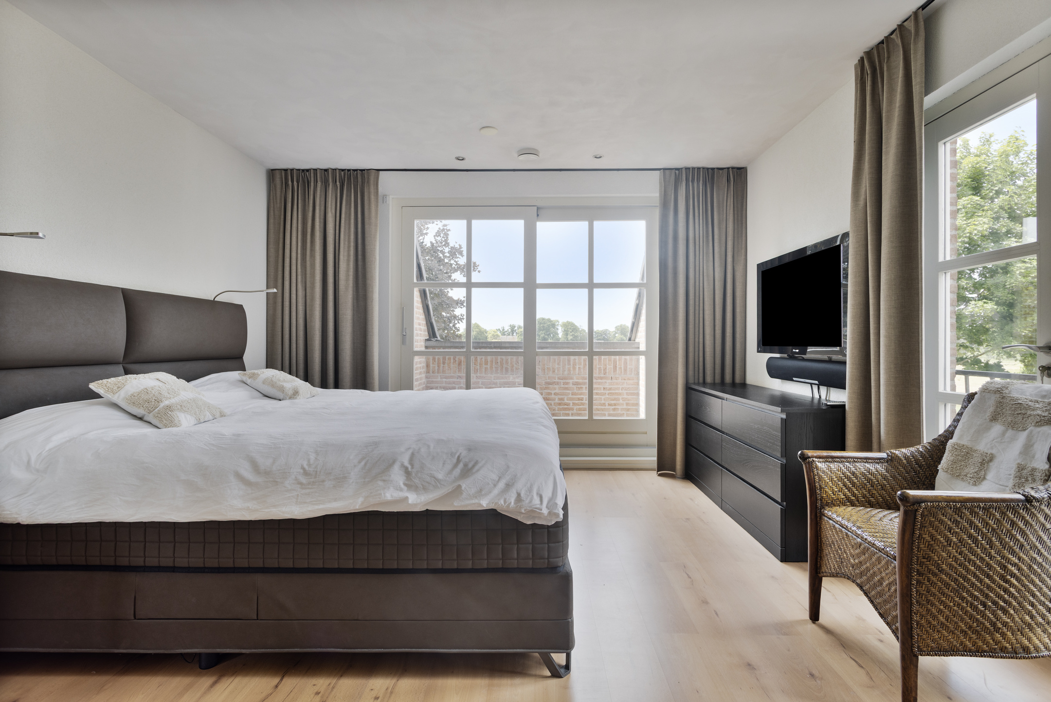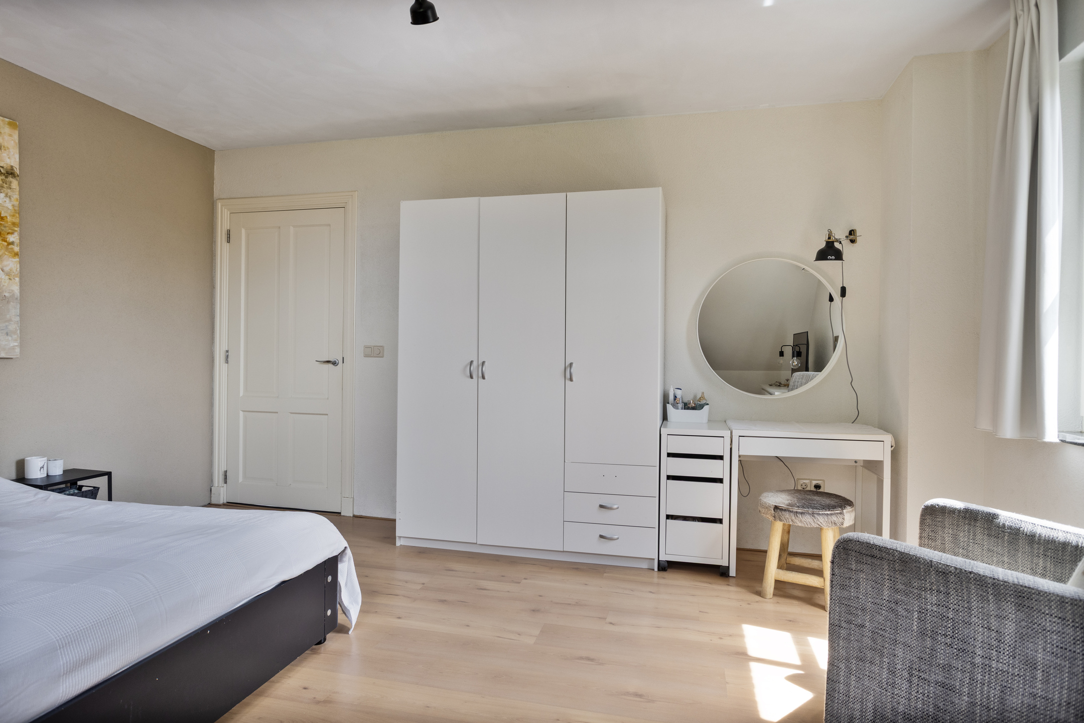 hoofdslaapkamer (ca. 28,5 m²) met een loggiabalkon, airco-installatie en een inloopkast, wandafwerking sierpleister, vloer afgewerkt met laminaat, schuurwerk plafond;