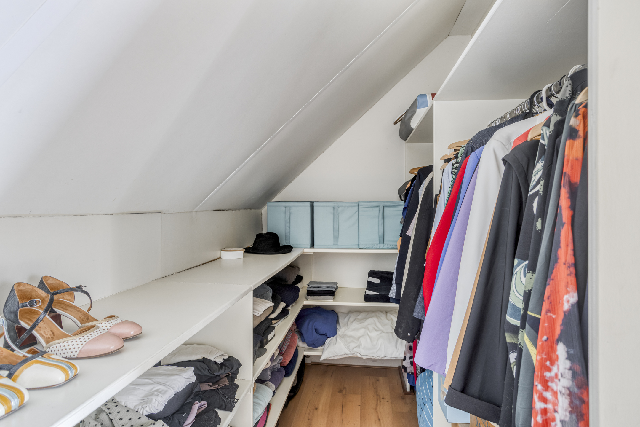 Open zolderruimte ten behoeve van extra opslag, vv. opstelplaats WTW-systeem, wandafwerking sauswerk, vloer afgewerkt met tapijt, dakplaten in het zicht.