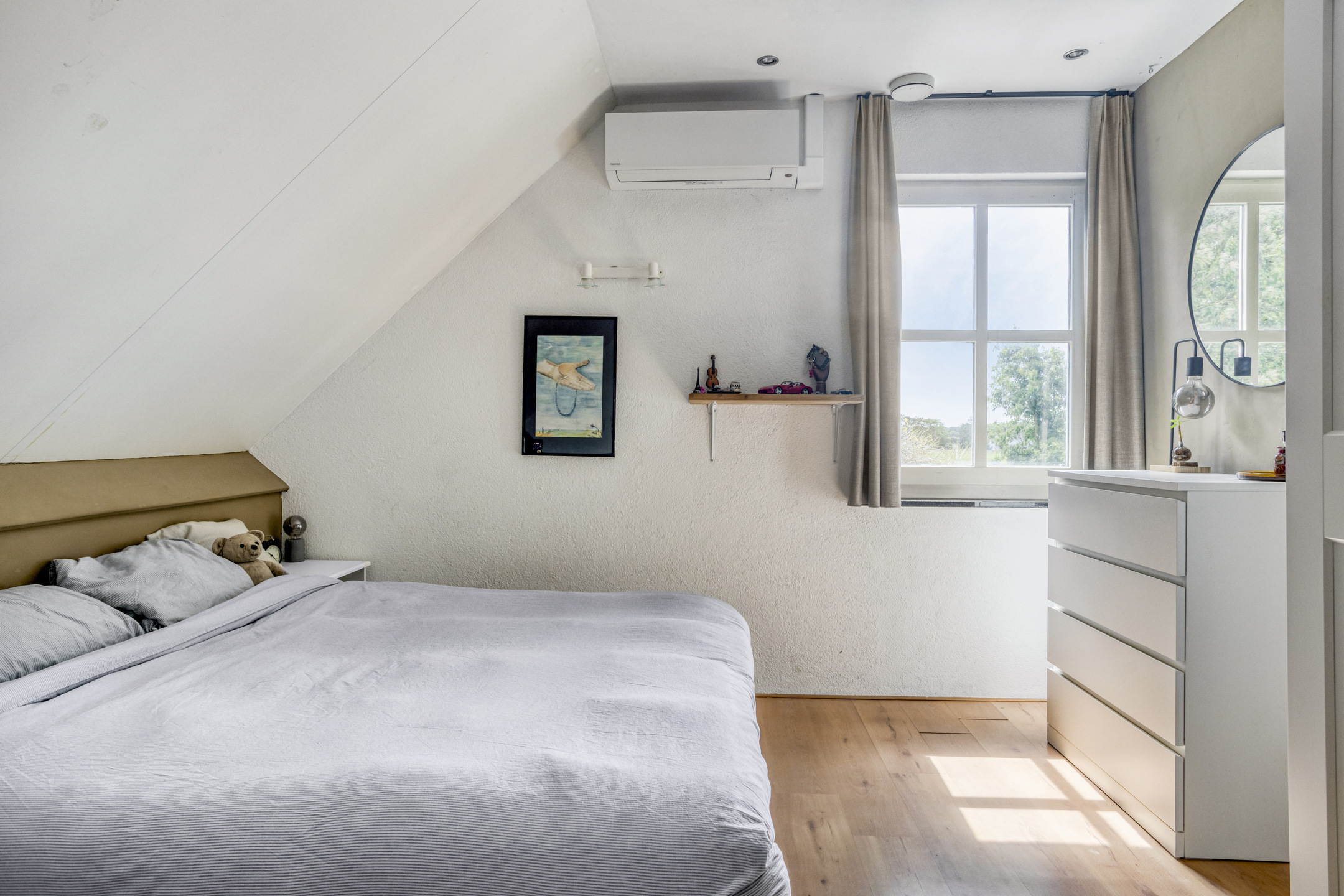 slaapkamer links achter (ca. 16,5 m²) met een dakkapel en airco-installatie, wandafwerking sierpleister, vloer afgewerkt met laminaat, schuurwerk plafond;
