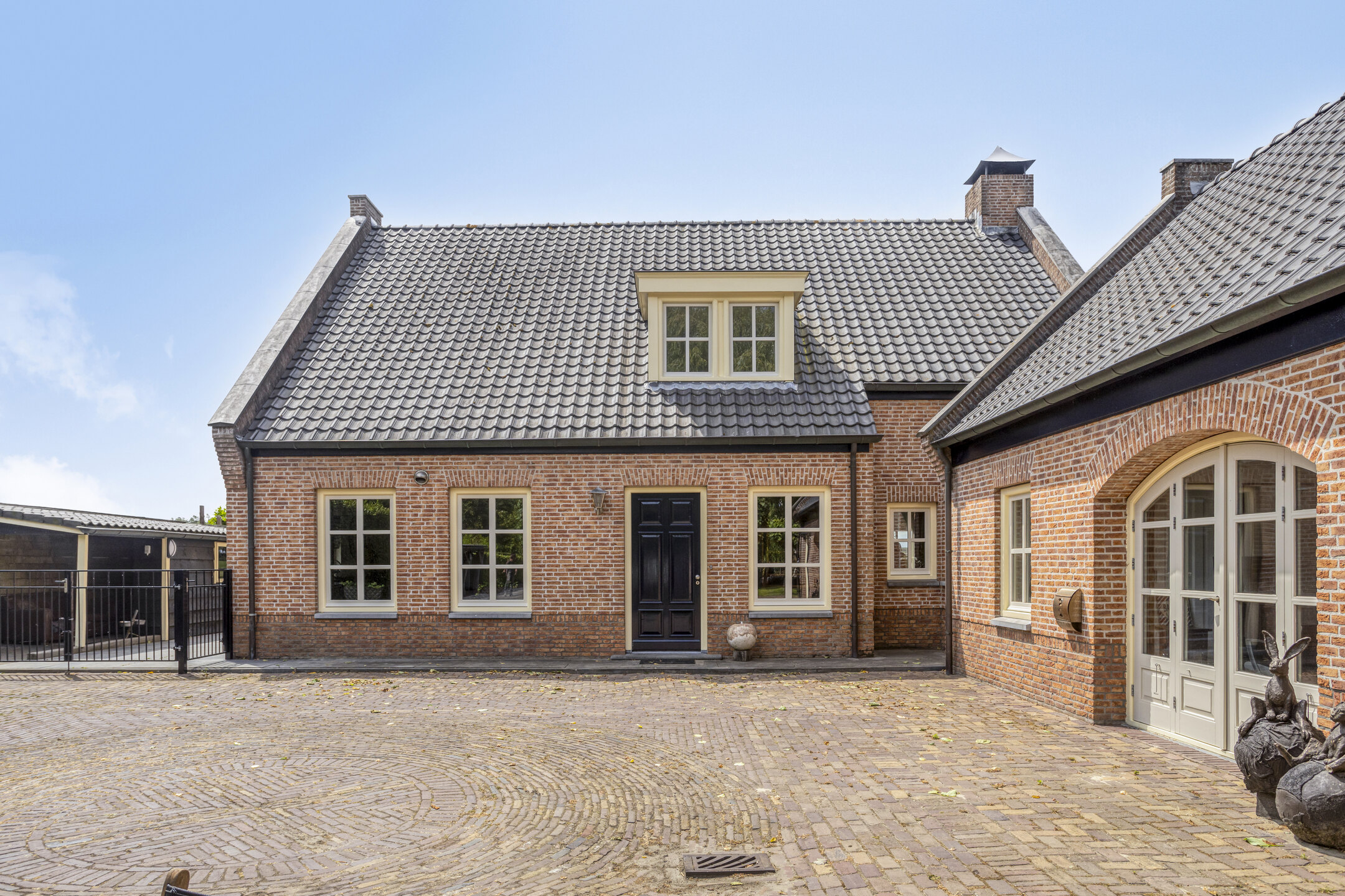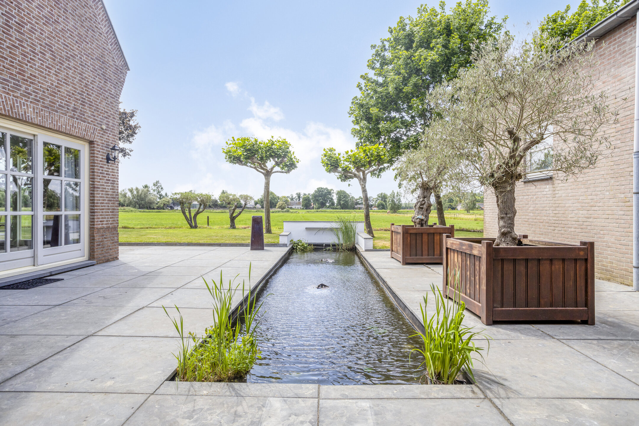 Aangelegde tuin rondom, terras bestraat met natuursteen, voorzien van een veranda tussen woning en loods, borders, gazon, vijverpartij, vrij uitzicht over de landerijen, vrij pad langs de woning t.b.v. achterom, lange oprijlaan overlopend in voorterrein als aangelegd met gebakken klinkers vv. straatkolken, deels betonklinkers en een groen plein, grotendeels omheind vv. elektrische poort met beeldcamera.