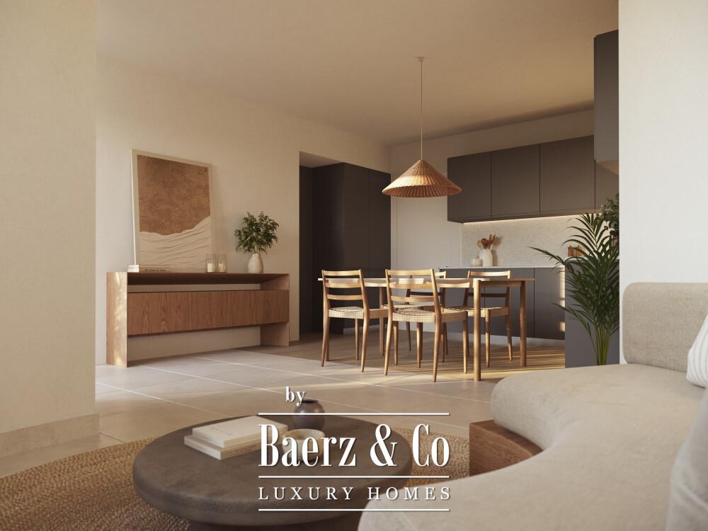 Inside, a fully equipped kitchen with integrated appliances complements one bedroom and two bathrooms, offering balance between comfort and functionality. The penthouse is delivered with a storage room and a reserved parking space in the underground garage. Communal spaces include a heated swimming pool, sun terraces, landscaped gardens, and a residents’ gym, all contributing to a quiet pace of life.