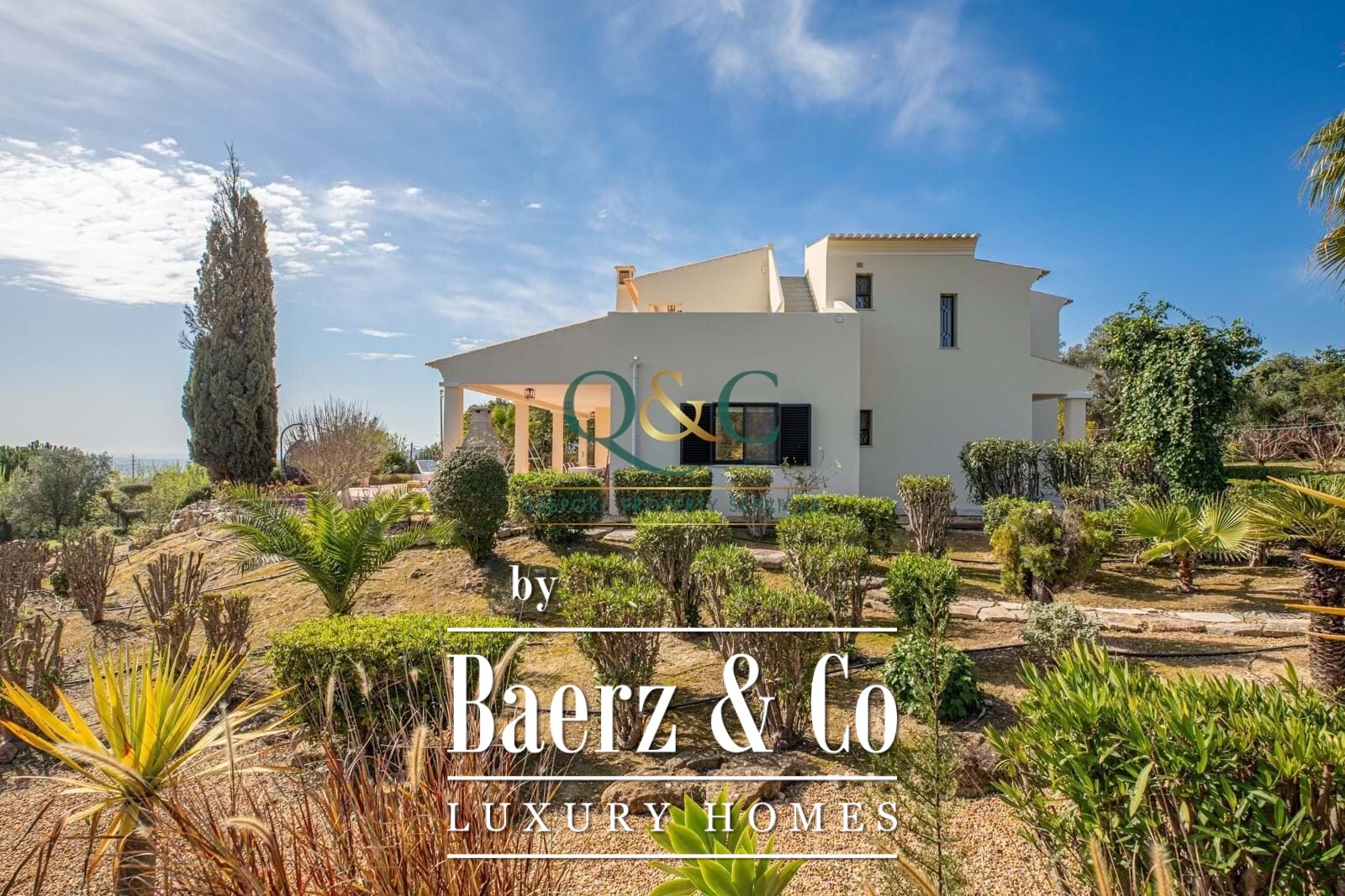 Villa Loulé presents a rare sense of calm just five minutes from the vibrant market town of Loule, with captivating sea and countryside views. This villa rests on a 6,720 m² plot, embraced by established gardens and a distinct rhythm of space and light. The 440 m² residence welcomes you with an open plan living and dining area, anchored by a fireplace and direct access to a broad terrace. The kitchen is well-proportioned and equipped for daily living. On the main floor, the master ensuite offers a generous walk-in dressing room, complemented by a family bathroom.