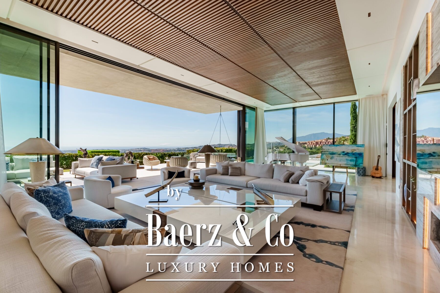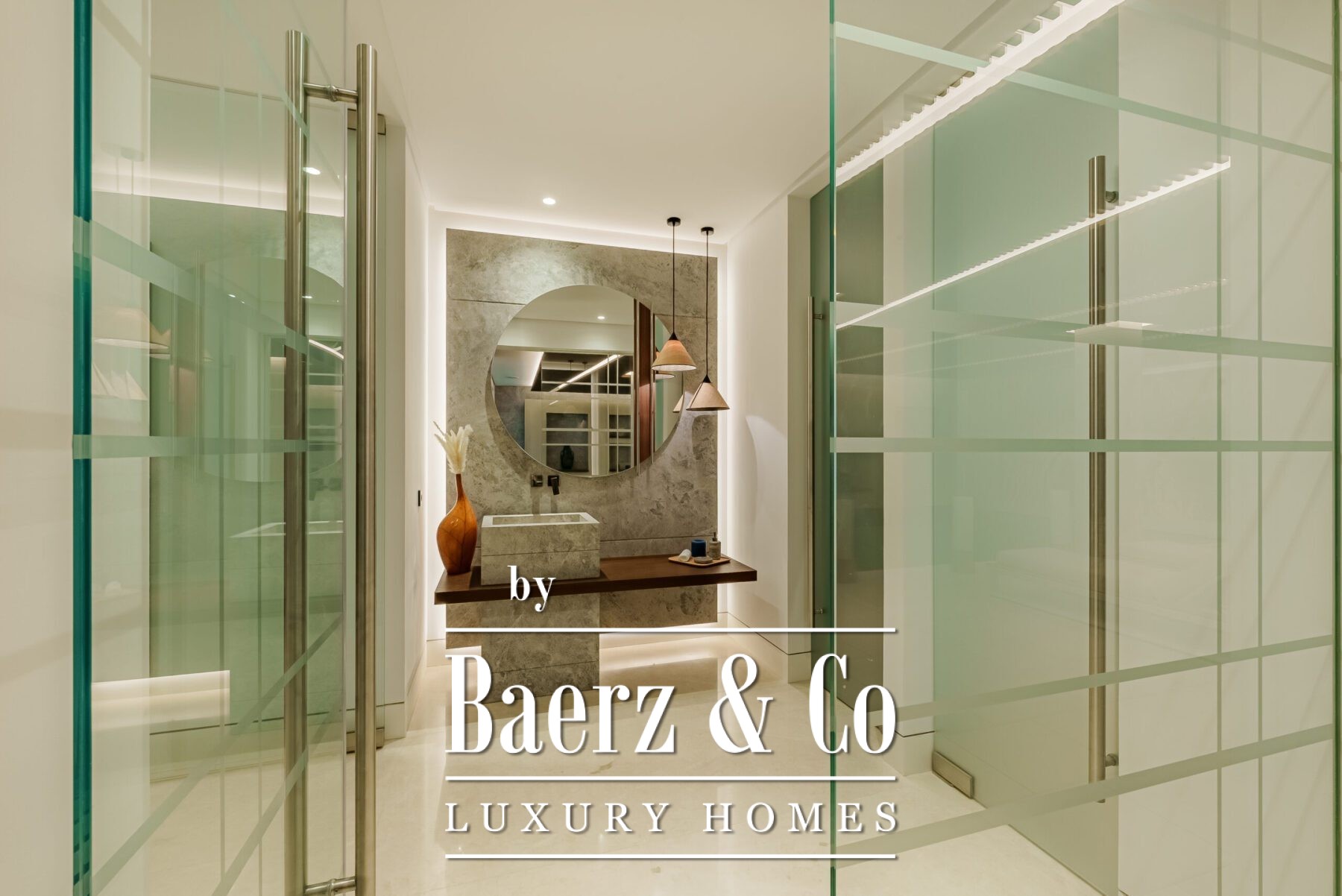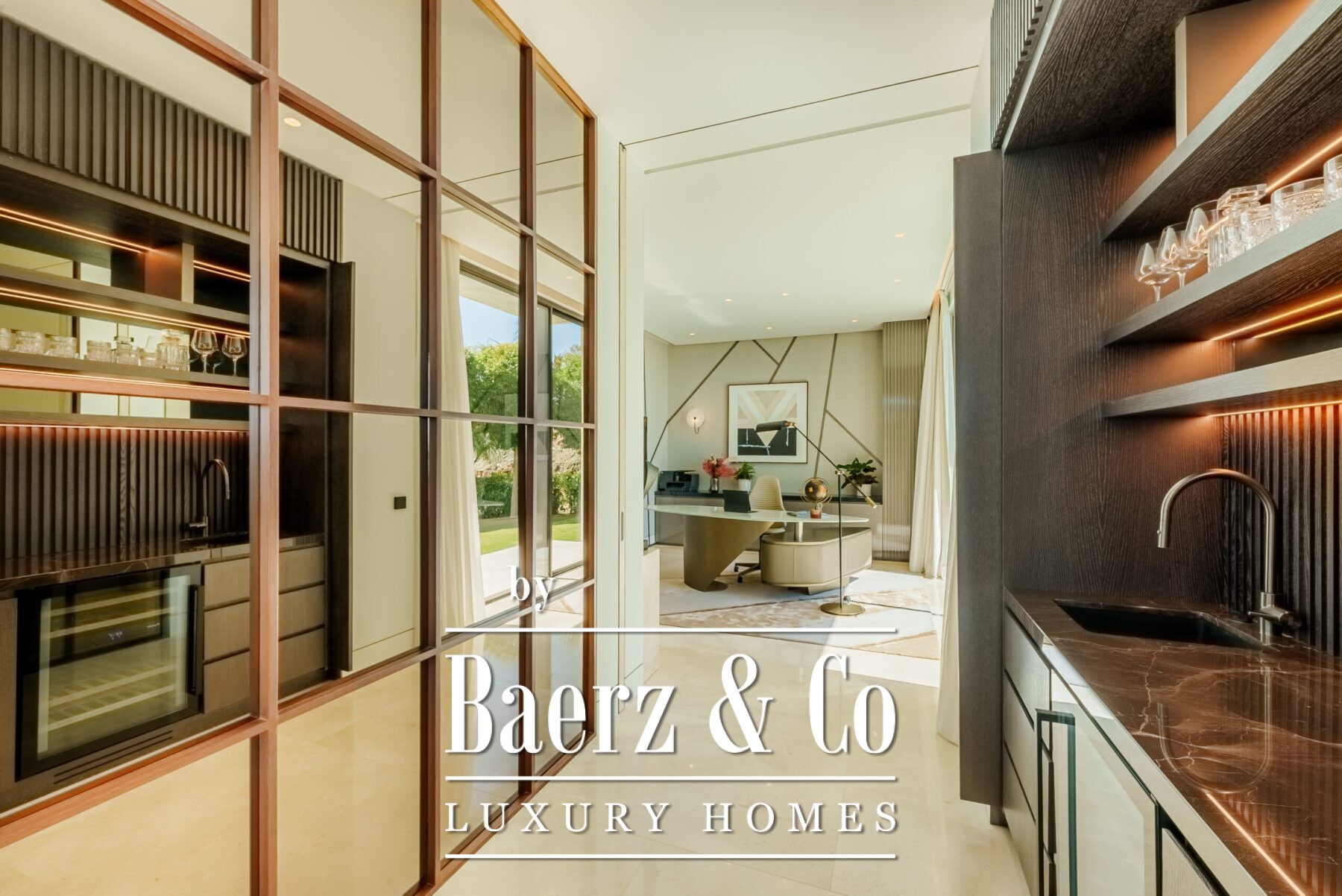 At the heart of the home lies a breath-taking living area, defined by soaring ceilings and full-height glass sliding doors that seamlessly disappear into the walls, blurring the line between indoors and out. The natural light floods the space, accentuating the fine finishes and drawing the eye out to the expansive terraces, tranquil garden, and infinity pool beyond. This open-concept layout creates a fluid connection with the outdoors, offering an inviting atmosphere for both intimate moments and large-scale entertaining.