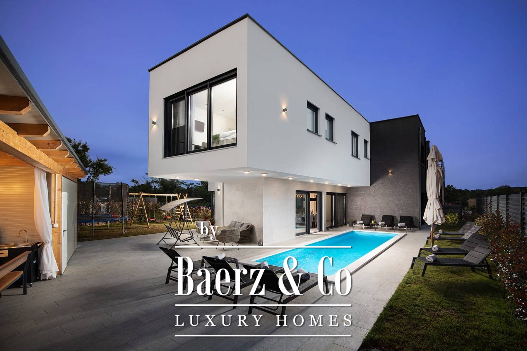 For sale is this luxurious modern villa in Medulin, net area 300 m2, located on a plot of 600 m2 in a quiet area. It consists of a basement, ground floor and first floor with the following layout: in the basement there is a wellness area with a relaxation zone. On the ground floor there is an entrance, a spacious open space living room with kitchen and dining room, three bedrooms each with its own bathroom. From the living room there is access to the terrace (part covered, part uncovered) from which access to the pool 9 m x 3.5 m and the garden, summer kitchen and children's playground. On the first