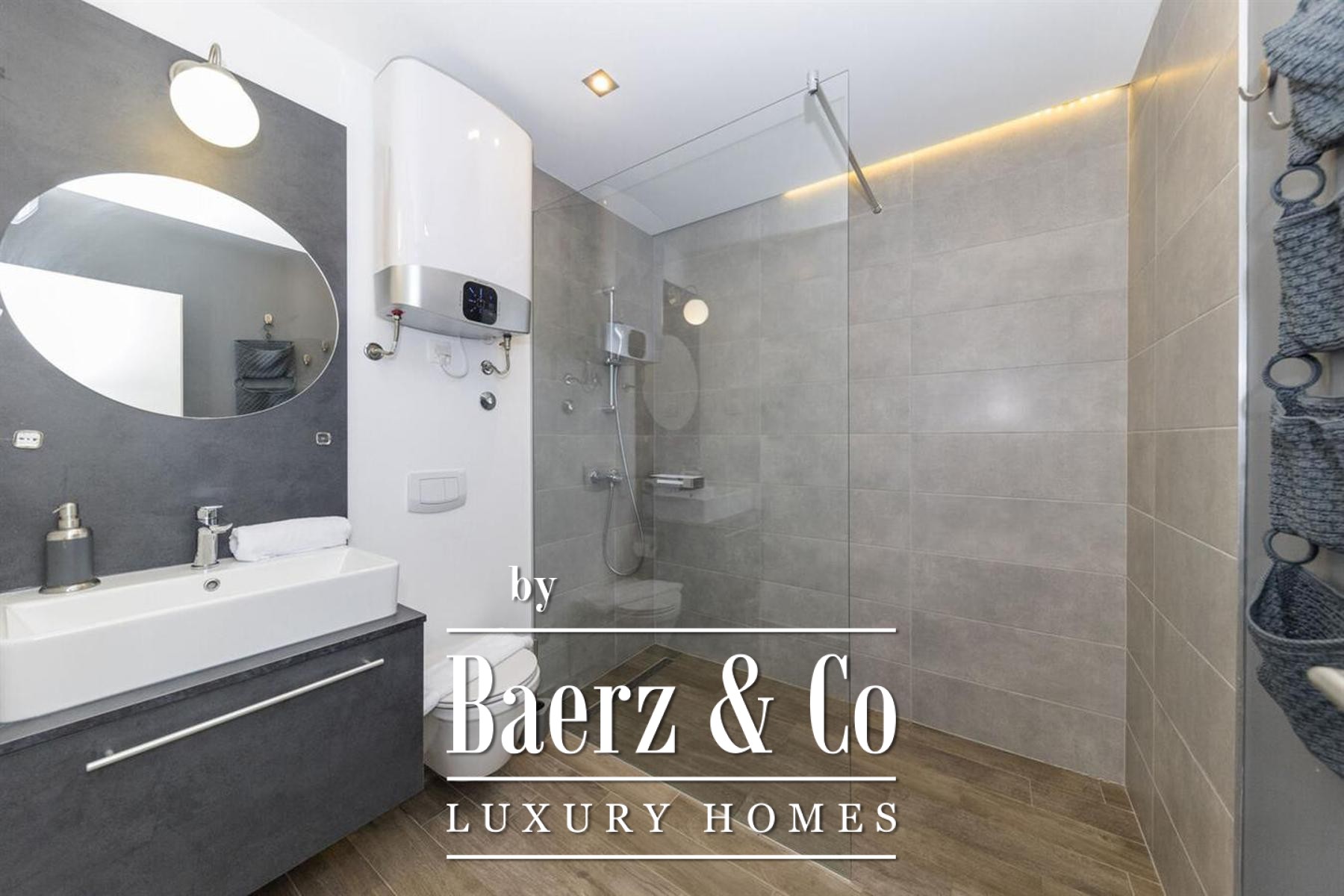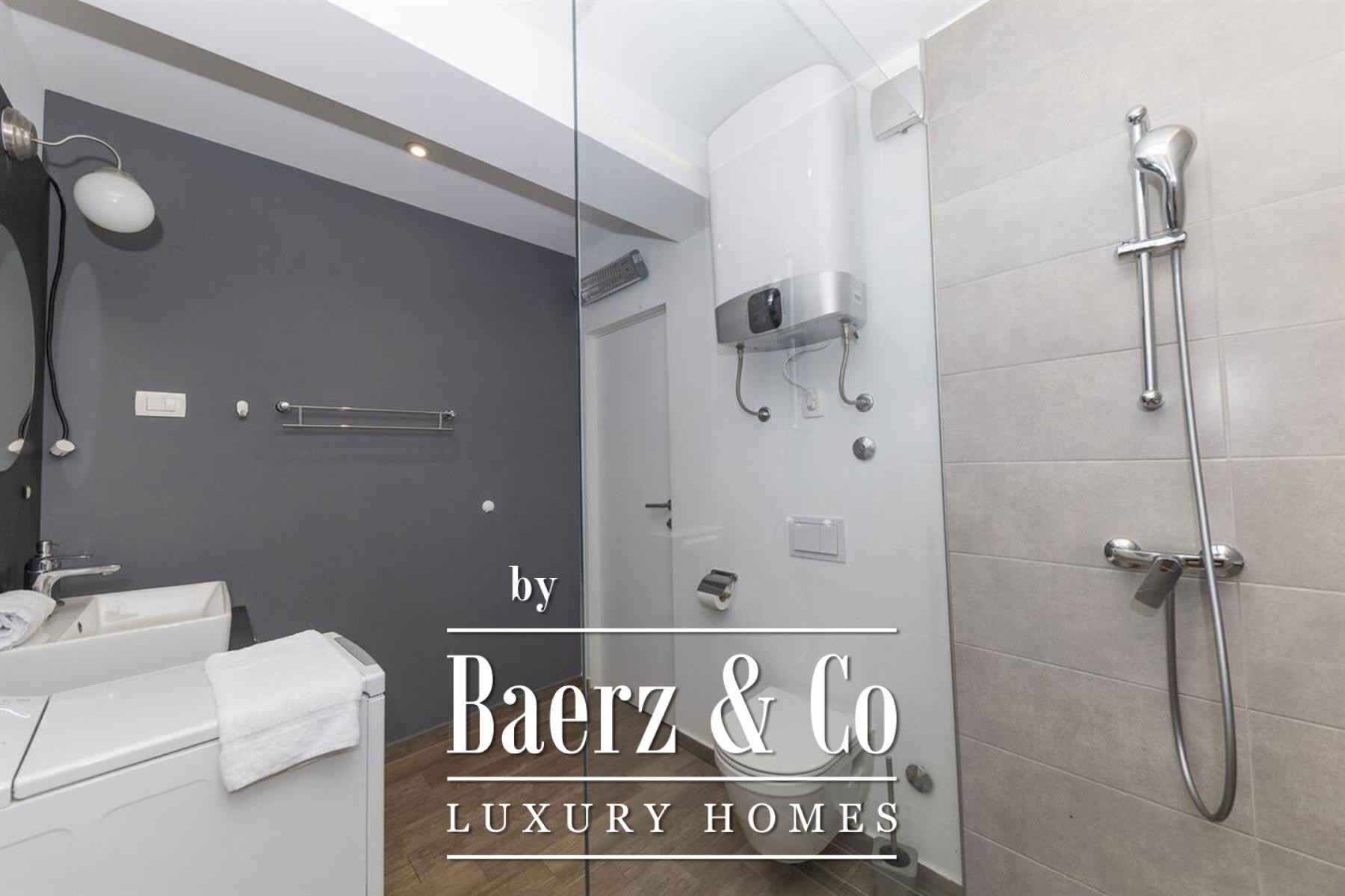 The property’s architectural rhythm divides into three independent, contemporary apartments, each with private entrances and direct pool access. The largest, at 190 m², features five bedrooms, four bathrooms, and a separate WC. Two further apartments, each 150 m², provide four bedrooms and four bathrooms plus an additional WC per unit. Throughout, high-quality ceramic tiles, inverter air conditioning, and premium sanitary fittings reinforce a commitment to quiet excellence and lasting value.