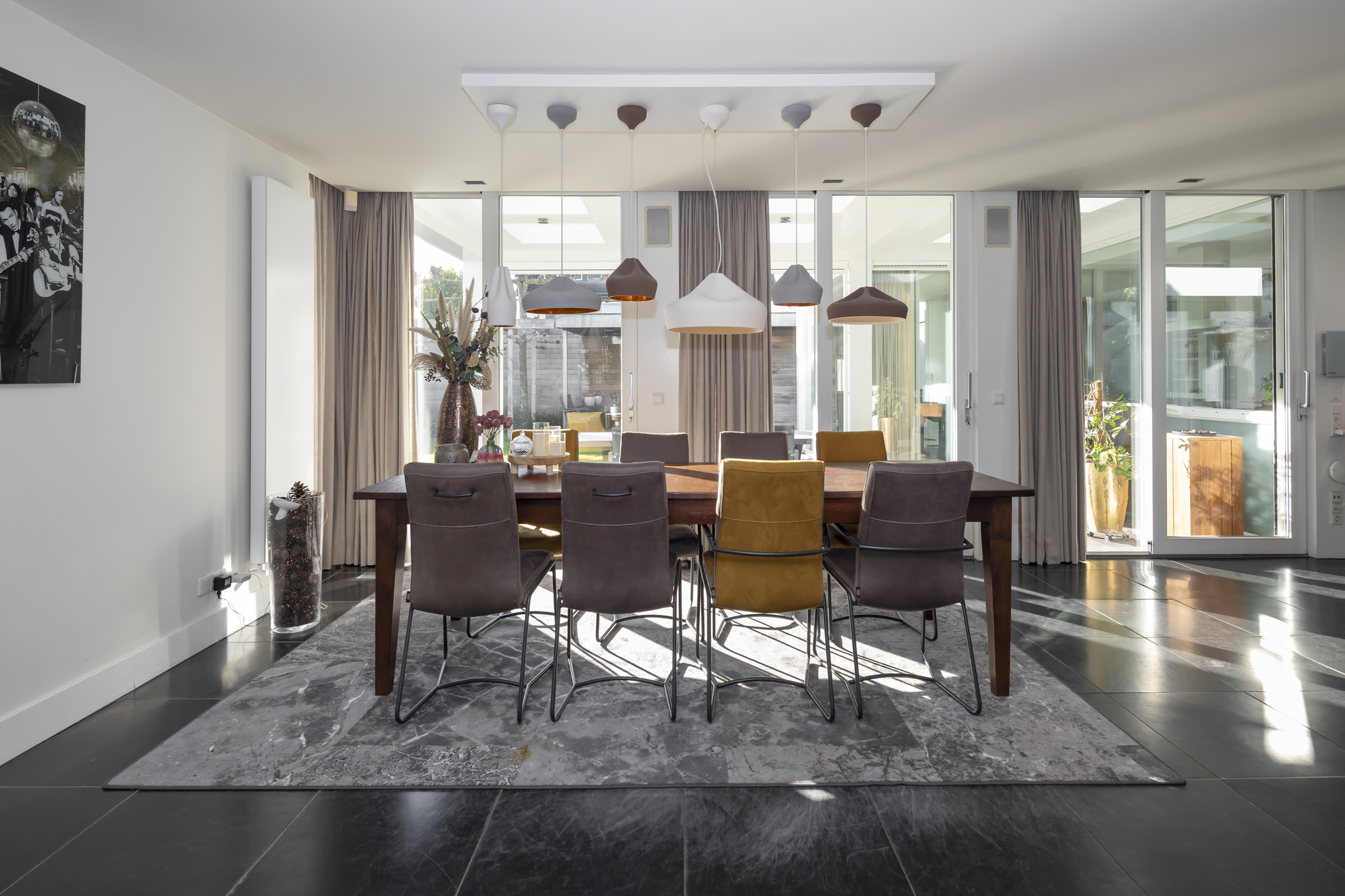 Thanks to the large windows all around, it's a wonderfully bright and sunny home. The living room is open plan to the dining room and the elongated, modern kitchen. At the front of the house is a lovely spot for working in peace, or for the kids to play.