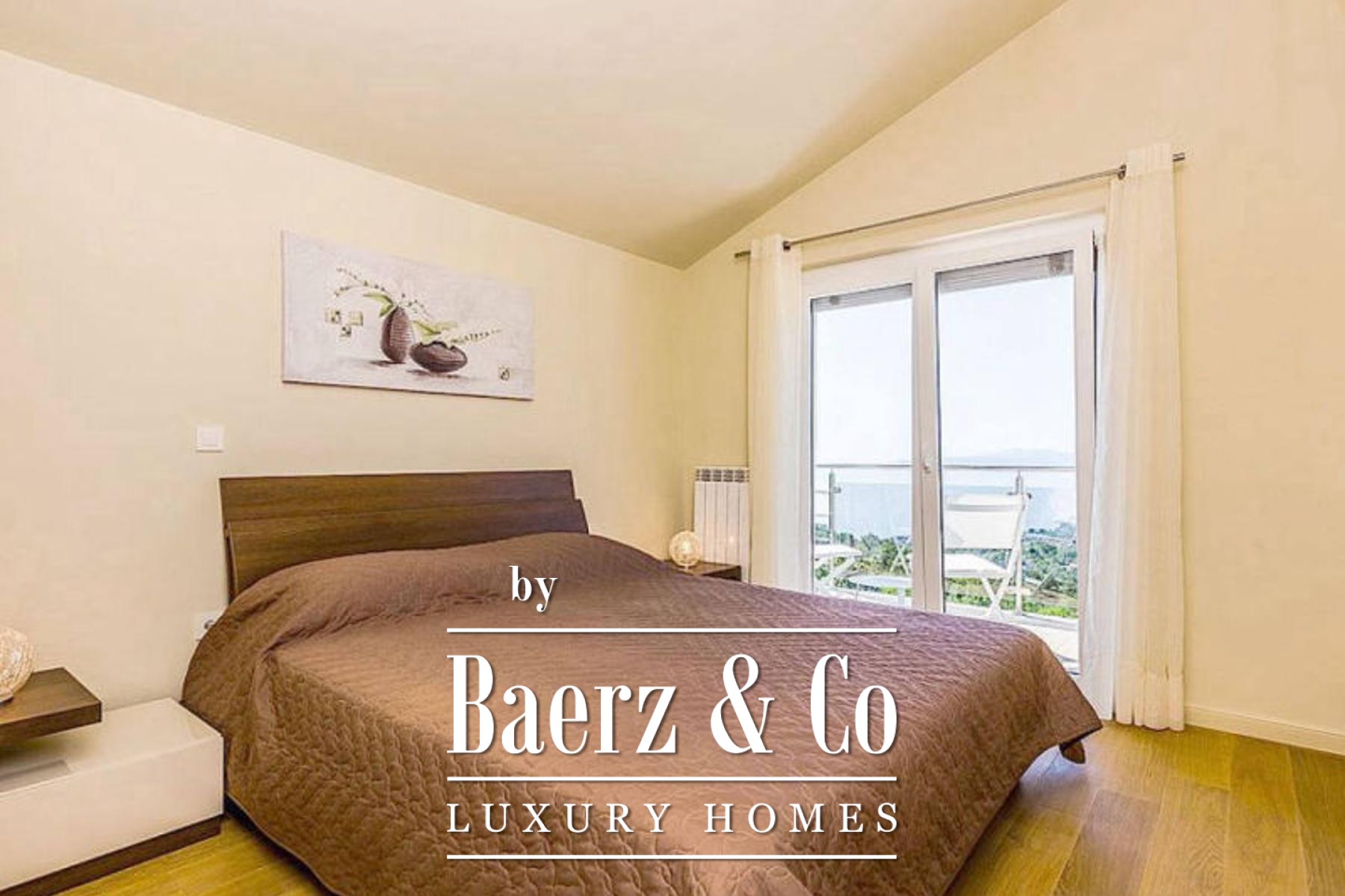 Outside, two balconies and dual 19 m² terraces invite open-air living with panoramic views over the Adriatic and Mediterranean greenery. The landscaped garden features a heated pool, sunbathing area, barbecue, and an automatic irrigation system, framing outdoor moments throughout the year. The villa is fully furnished, equipped with central heating and cooling, high-speed internet, SAT TV, video surveillance, and a comprehensive alarm system for peace of mind.