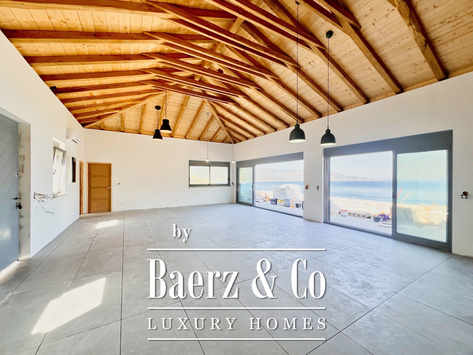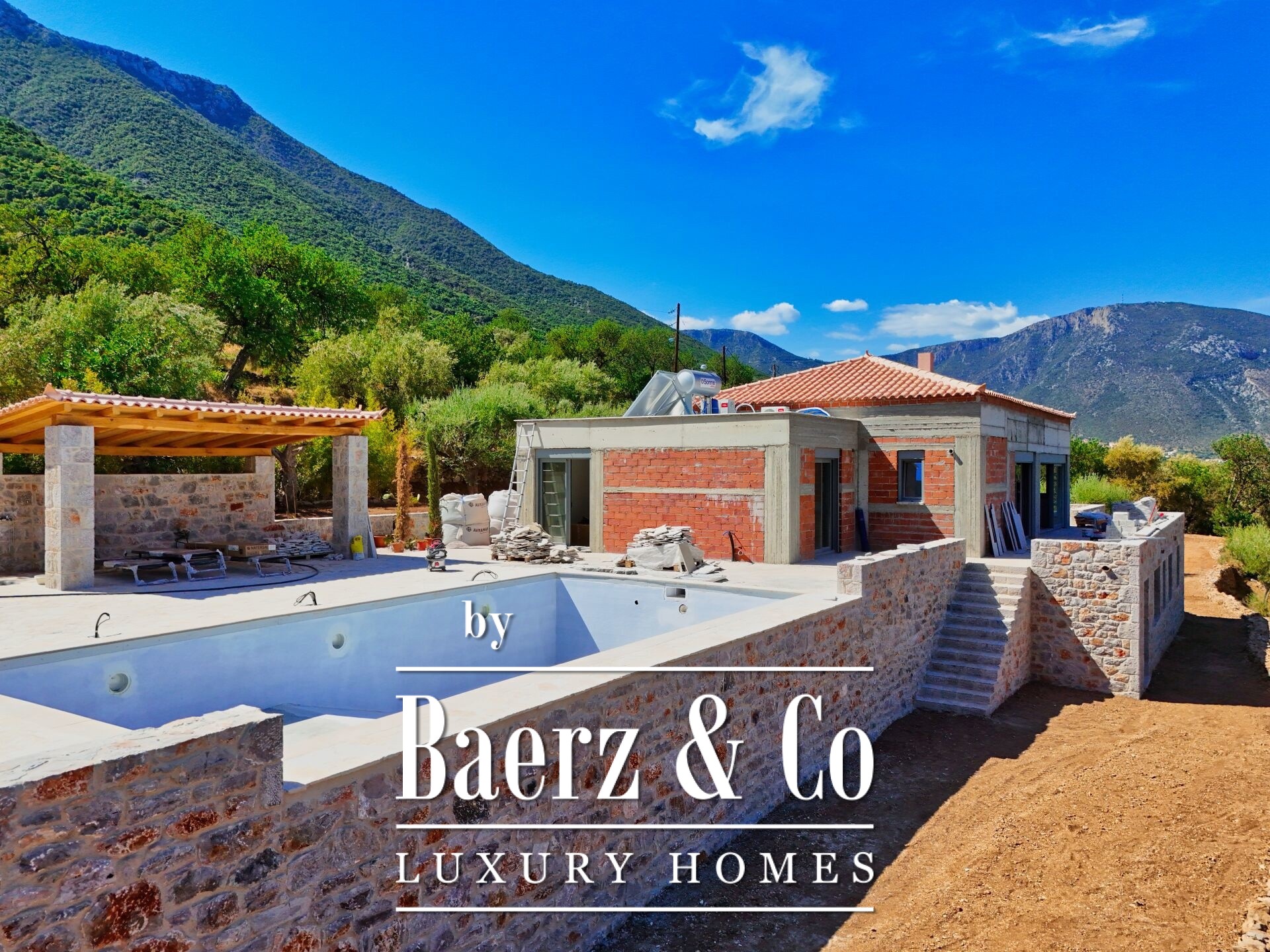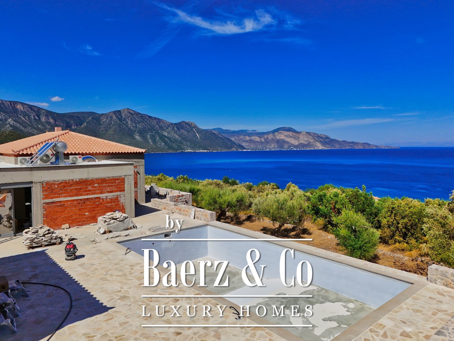 The grounds feature a landscaped courtyard, a 5 by 10 metre swimming pool, and an elegant stone barbecue, complemented by planned tree plantings to heighten a sense of seclusion and beauty. The house is delivered complete, with double-glazed insulation, air conditioning, solar water system, and a security door. Access to the beach remains both easy and direct, underscoring the property’s effortless connection to its remarkable coastal context. This luxury detached house for sale in Poulithra brings Greek landscape and timeless architecture into quiet alignment.