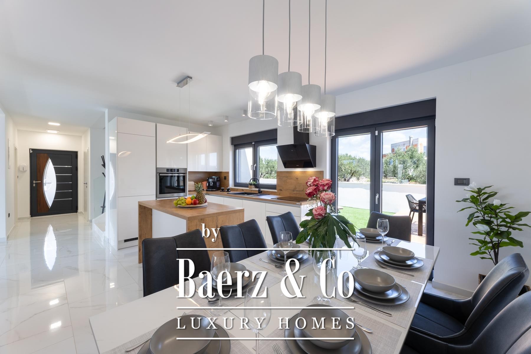 Villa Primošten with sea view presents a modern Croatian retreat defined by its 311.56 m² of refined living space and compelling Adriatic outlook. Completed in 2024 on a 515 m² plot, this residence articulates contemporary architecture across three thoughtfully arranged floors. The main level flows from a light-filled living room into a kitchen and dining area, accompanied by a bedroom suite and a separate wellness room with a sauna. Expansive glass doors open onto a sheltered terrace beside the pool, where a counter-current swimming system invites leisure and fitness alike.
