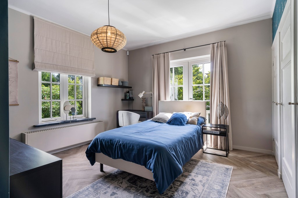 On the first floor there are four generous bedrooms. Each room is beautifully finished and highly versatile: whether you need extra bedrooms, a home office, hobby room, or fitness space, these rooms can be arranged to suit. The finely finished bathroom on this floor features a luxurious freestanding tub, a serene spot to unwind and enjoy a moment to yourself.