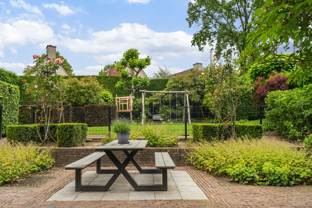 Outside, a large garden awaits with countless possibilities for recreation and relaxation. There is ample space for children to play, to create a vegetable garden, or to design multiple seating areas for unwinding. Whether you’re hosting a summer BBQ, gardening, or simply relaxing in peace, this garden has it all—a perfect extension of the indoor living space and a true invitation to outdoor living. The planting is wonderfully traditional with rose bushes and richly planted borders.